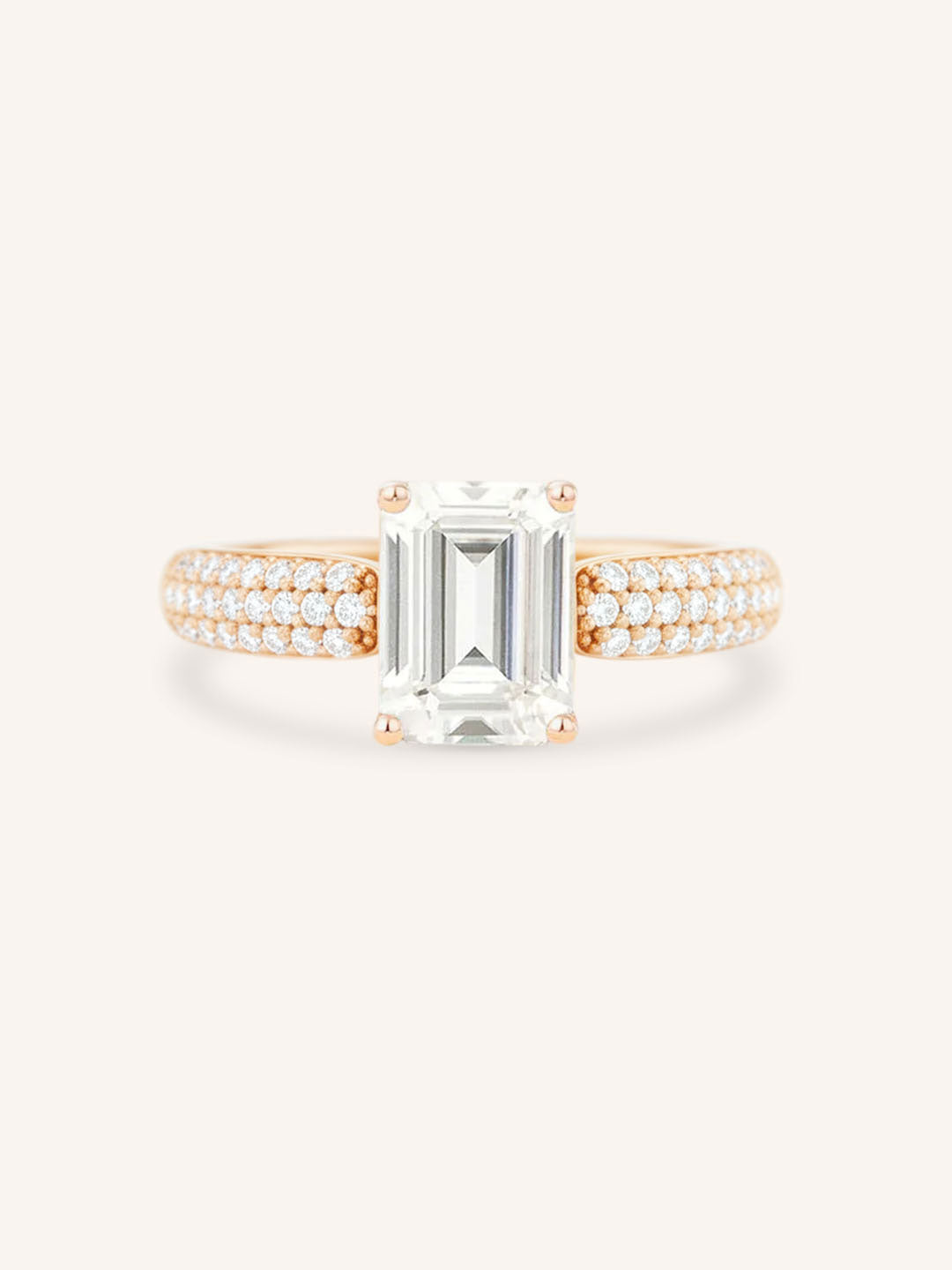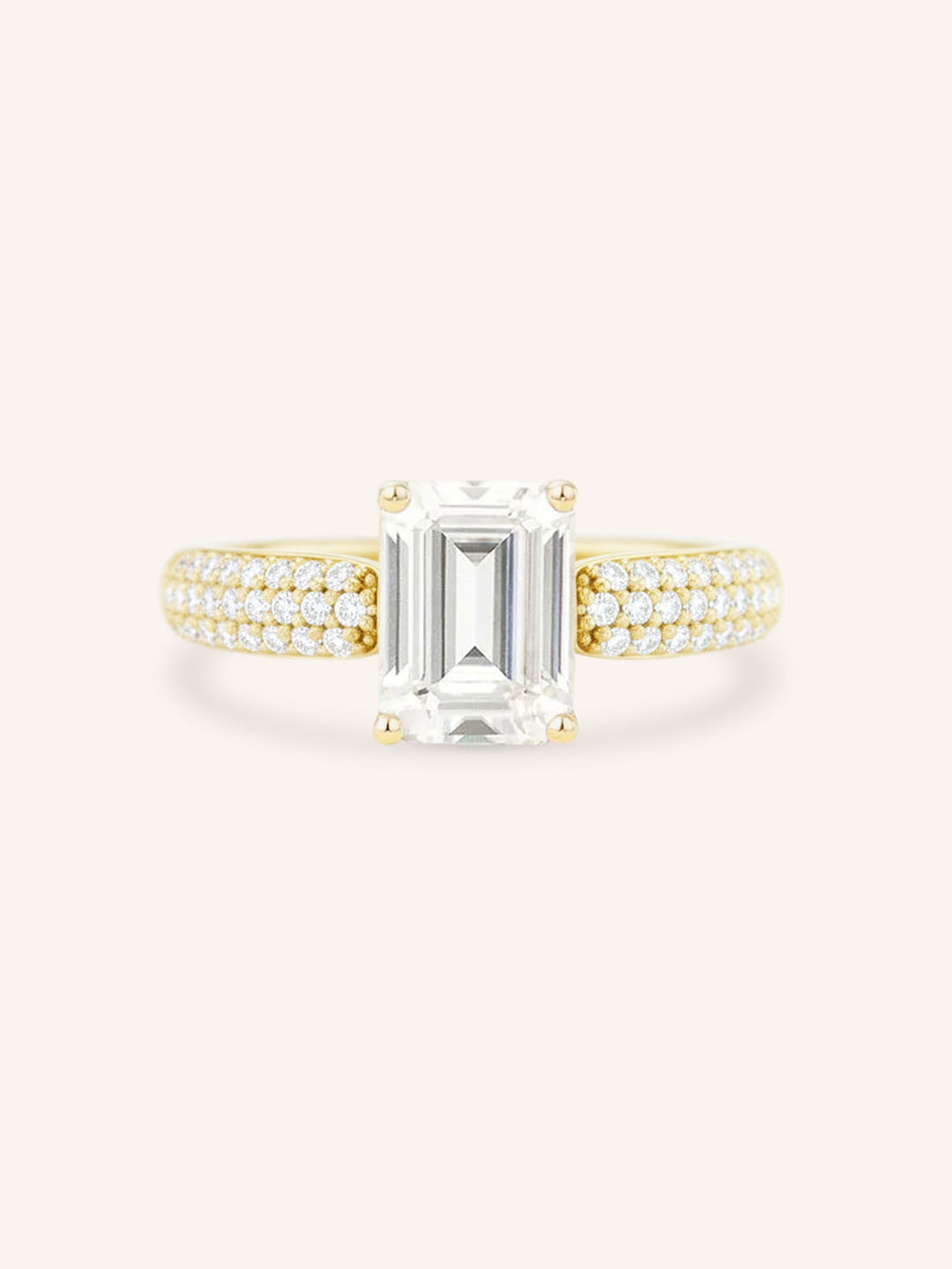 This exquisite design showcases a dazzling solitaire center stone, capturing timeless elegance and brilliance. The shank is adorned with three rows of pavé-set diamonds, adding a sparkling dimension that complements the center gem. Perfect for those who love classic sophistication with a modern twist, this ring is designed to shine from every angle.