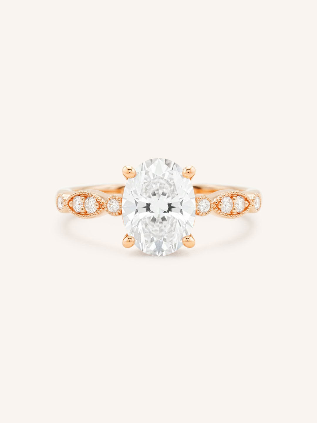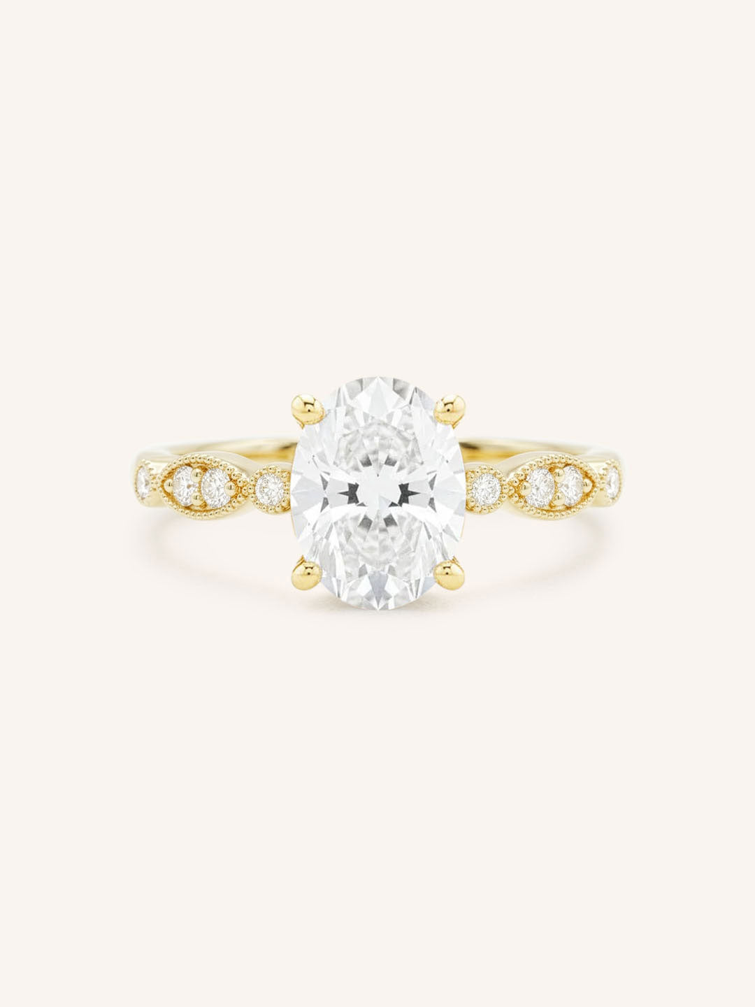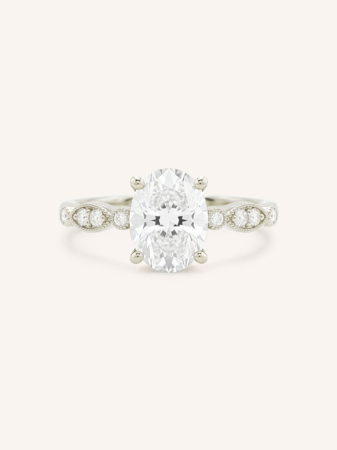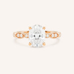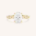 Featuring an oval faceted lab-grown diamond, available in 7x5mm, 8x6mm, or 9x7mm size. *Sizes are approximate and measurements are subject to change/alter to fit. The center stone will come graded with a certified report.