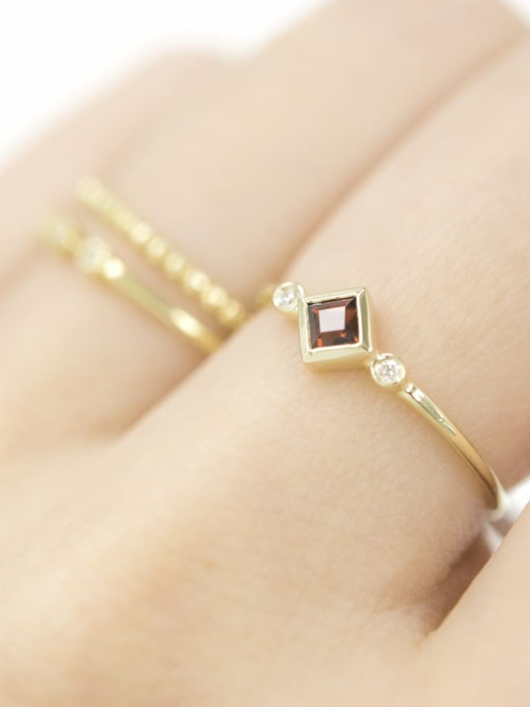 Wildflowers represent a joy that is colored in the most amazing hues. The Wildflower ring emulates this happiness with a petite ring you can stack or wear alone. It features a minimal princess cut gemstone bezel-set diagonally embellished by two luminous diamonds to make the rich colors of the ring blossom.