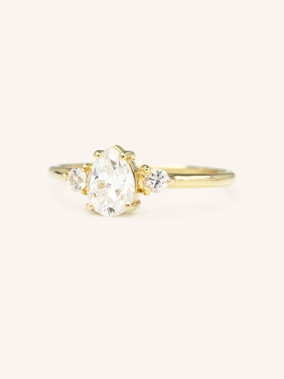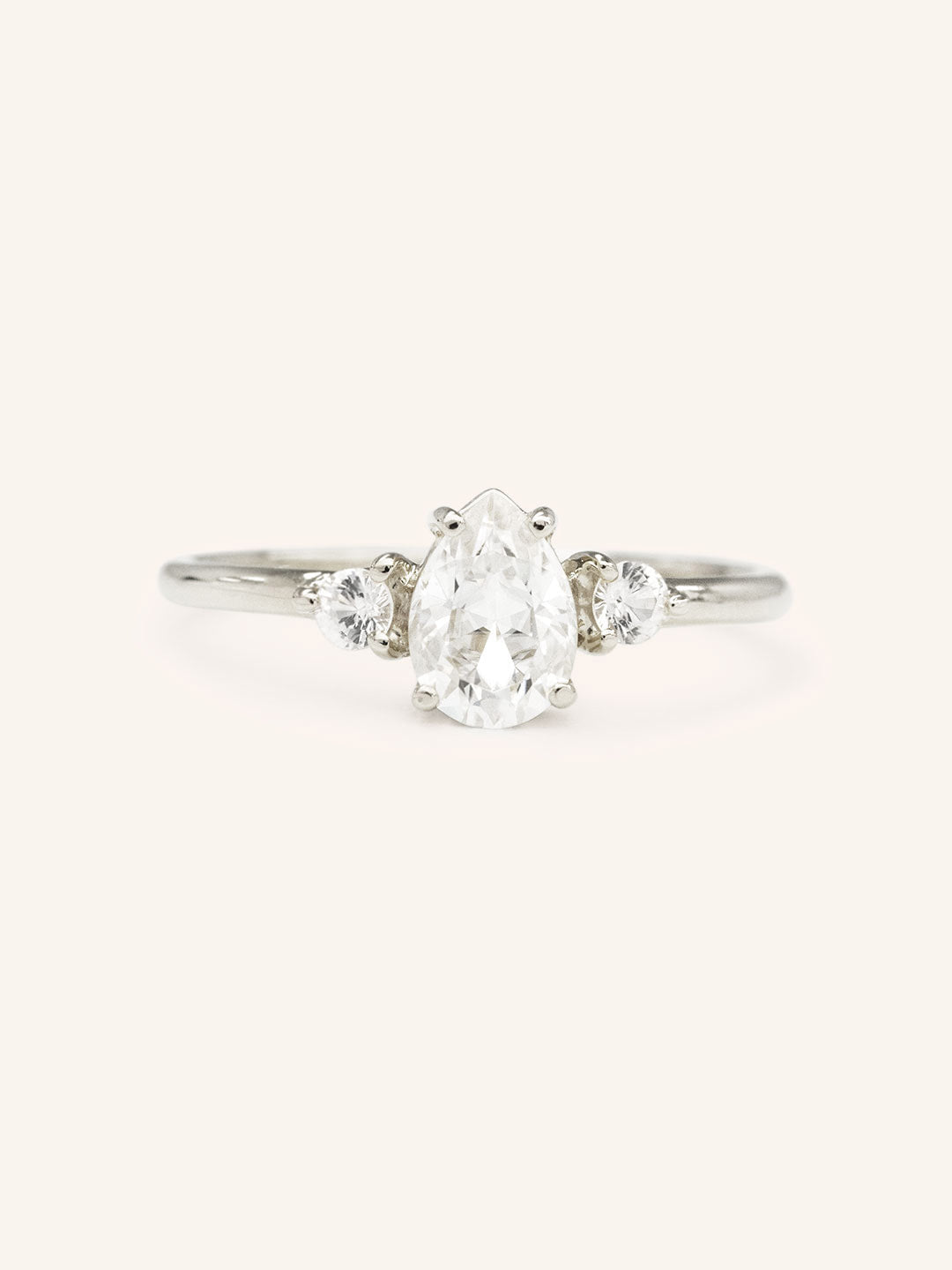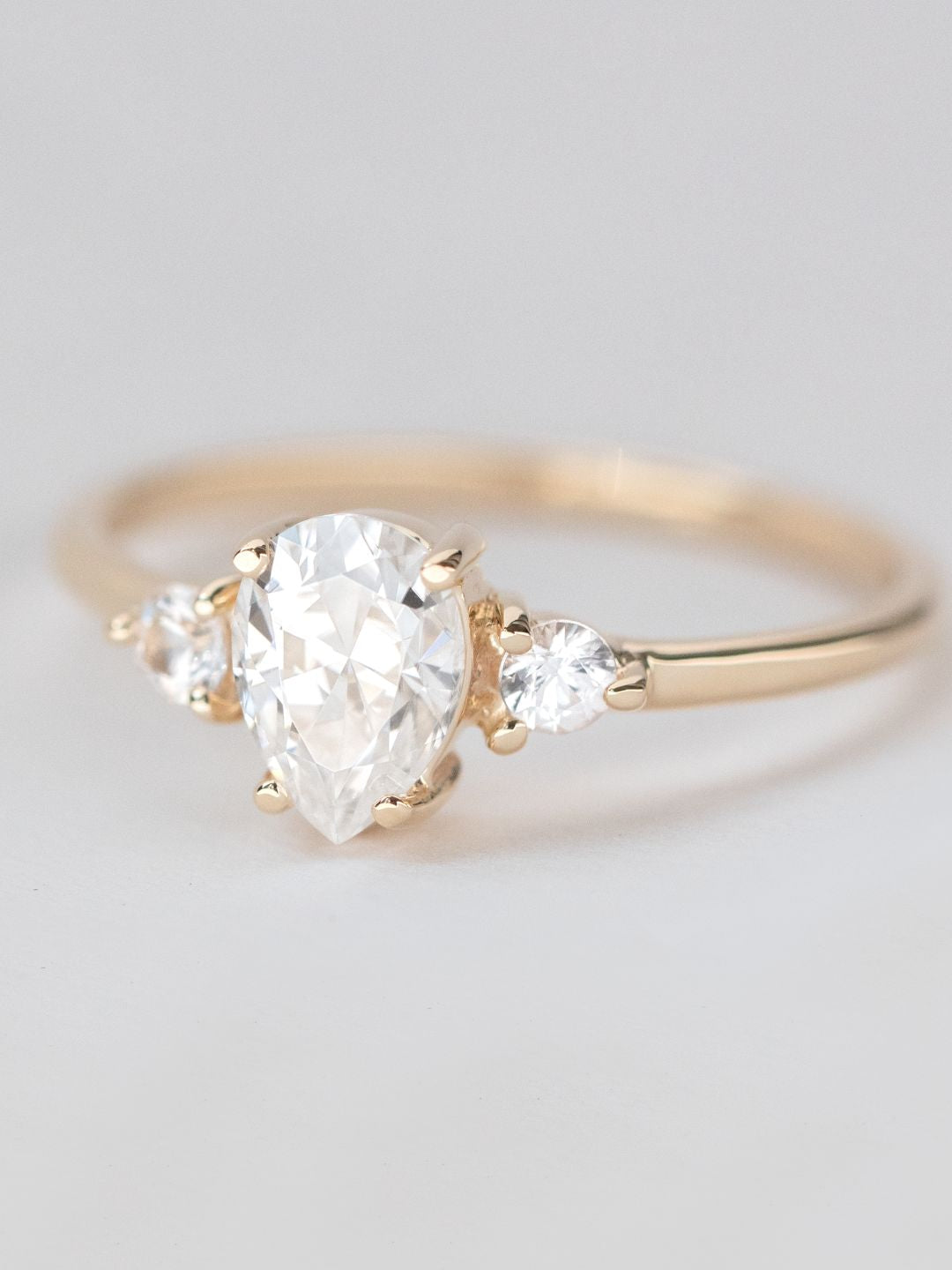 Blushing Bride Moissanite Pear Three Stone Engagement Ring