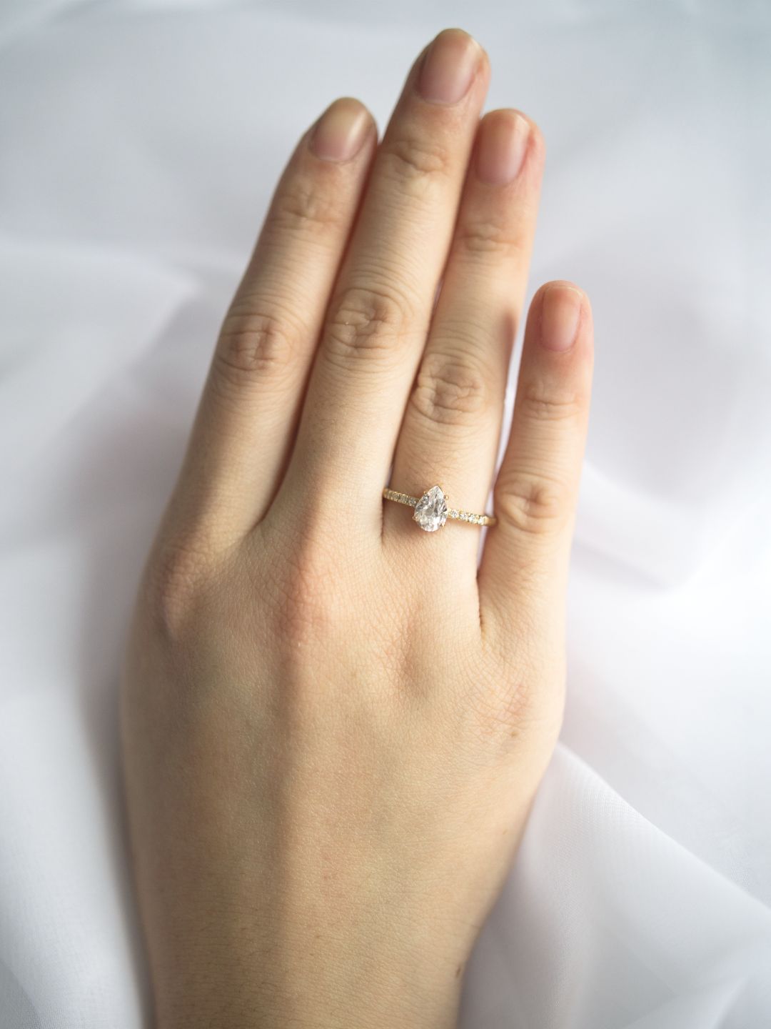 - One(1) Pear Cut Faceted Moissanite (approx 0.69 ctw/ 7 x 5 mm, DEF color grading)