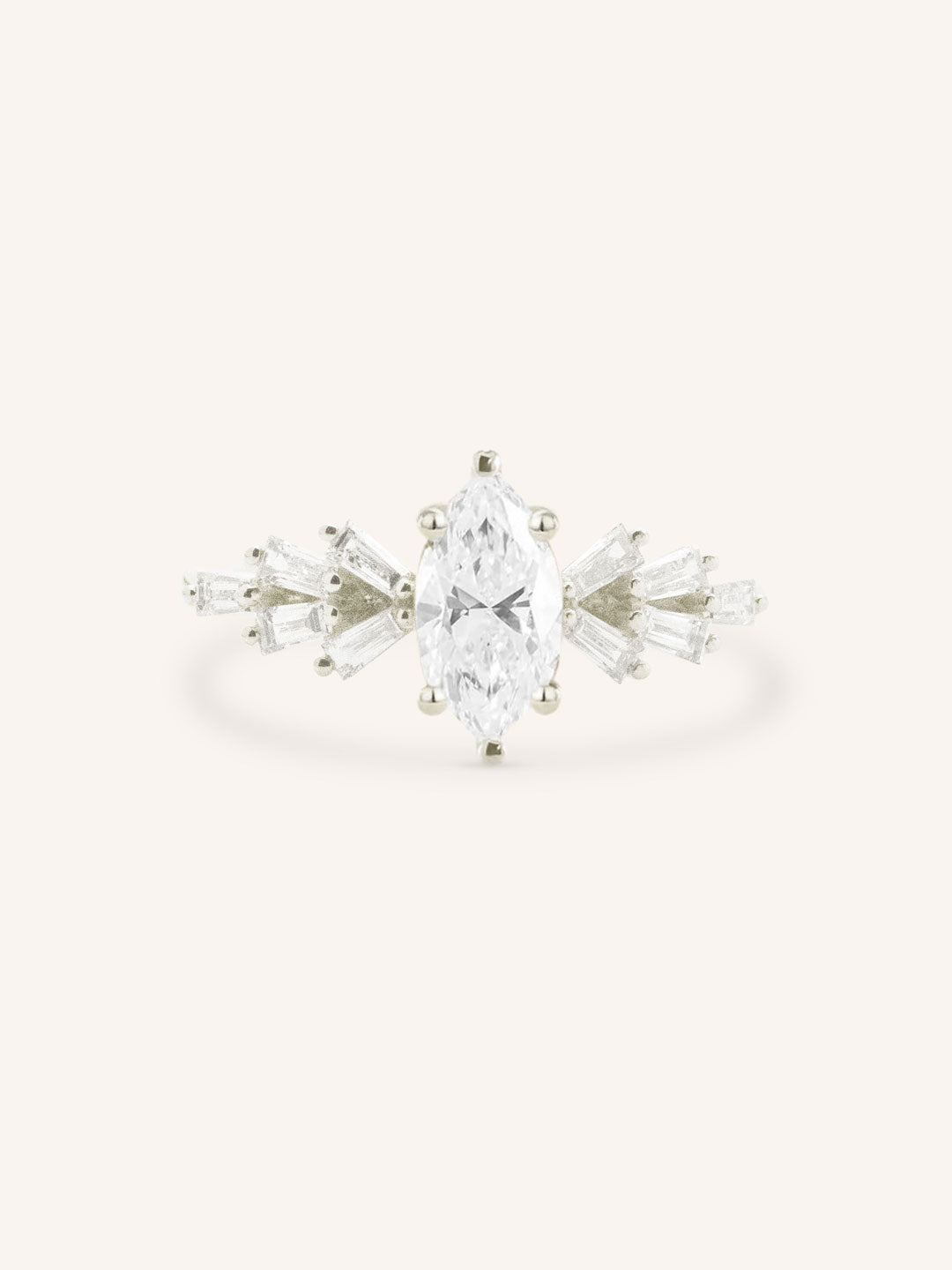 The Dawnsky Marquise Diamond Engagement Ring features a striking center stone framed by a radiant fan of straight baguette diamonds. This accented design creates a sunburst-inspired silhouette, adding a sense of brilliance and movement to the elegant emerald cut. A bold yet refined statement of love and light.