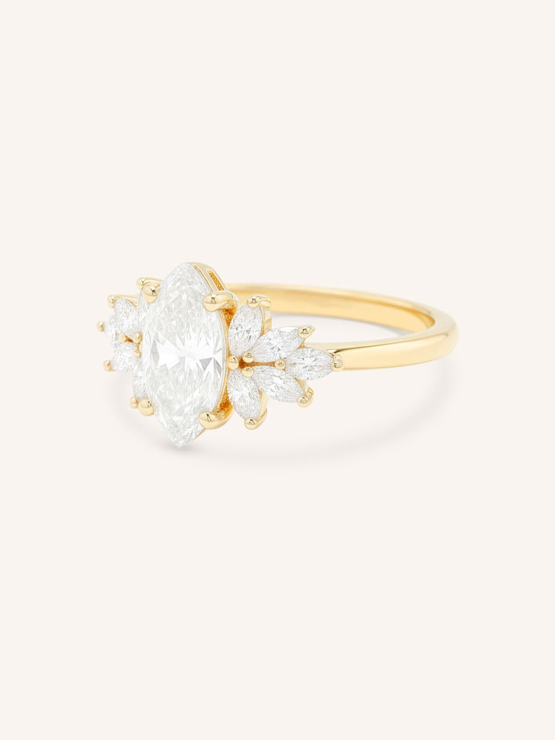 Discover a classic engagement ring with a modern twist. This stunning ring features a brilliant diamond marquise at the center, set in a cluster style with marquise diamonds adorning each side. The cluster design of this ring is both timeless and contemporary, making it a perfect choice for any bride.