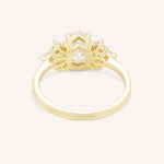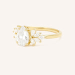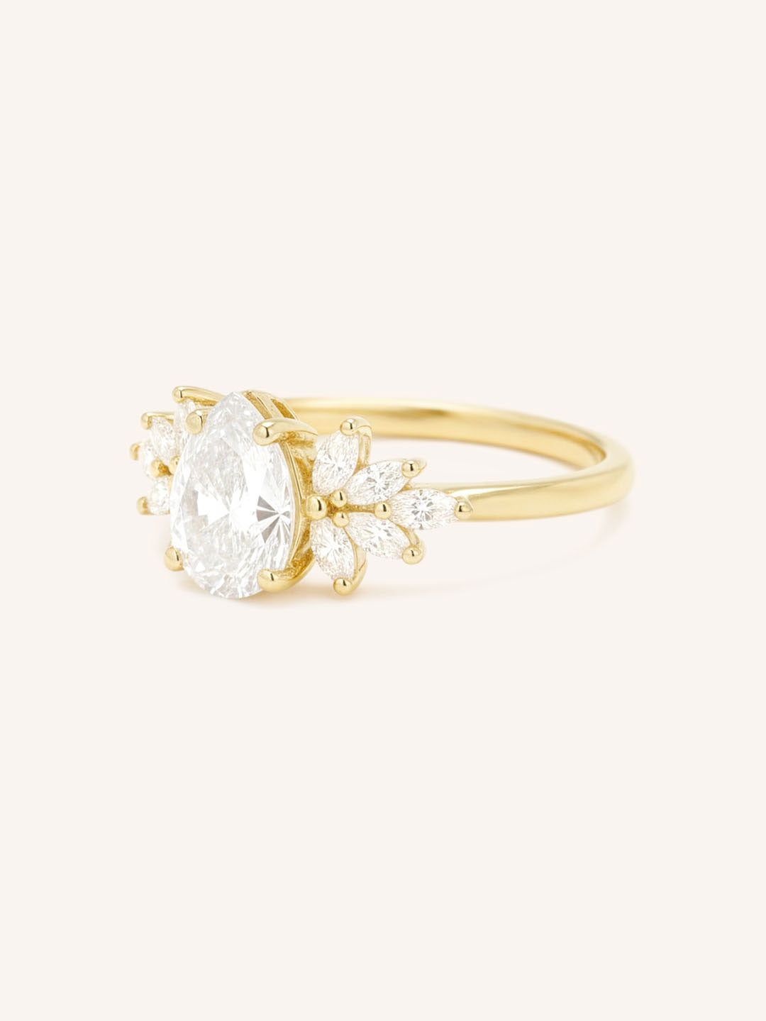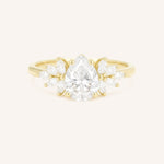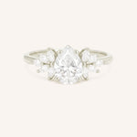 Discover a classic engagement ring with a modern twist. This stunning ring features a brilliant pear diamond at the center, set in a cluster style with marquise diamonds adorning each side. The cluster design of this ring is both timeless and contemporary, making it a perfect choice for any bride.