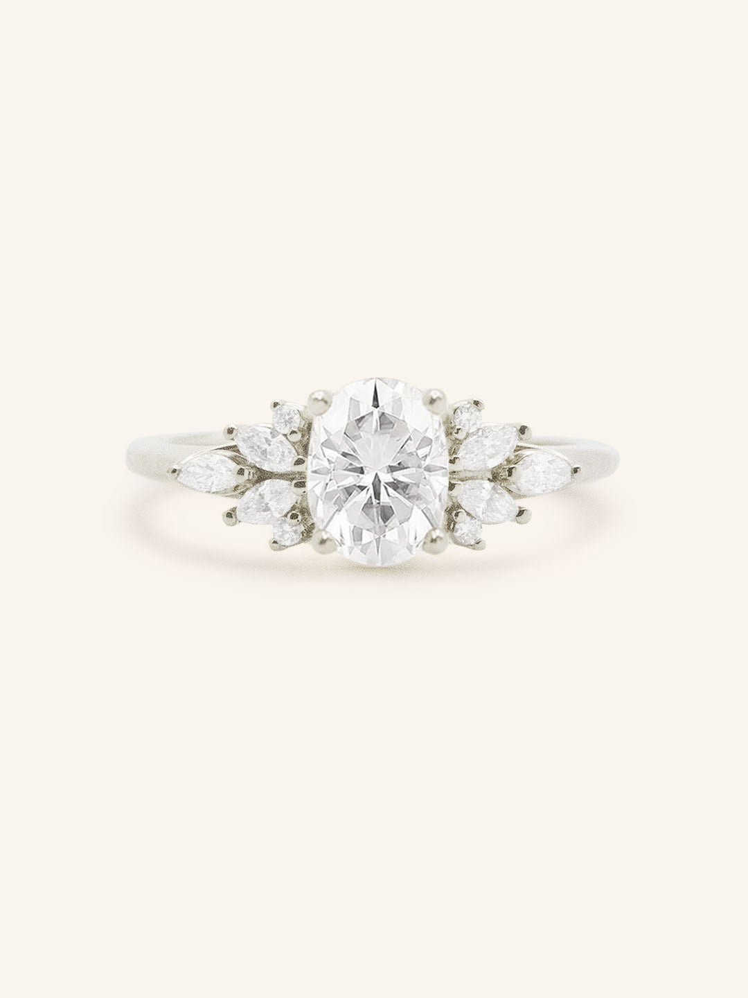 Featuring an oval faceted lab-grown diamond, available in 7x5mm, 8x6mm, or 9x7mm size. *Sizes are approximate and measurements are subject to change/alter to fit. The center stone will come graded with a certified report.