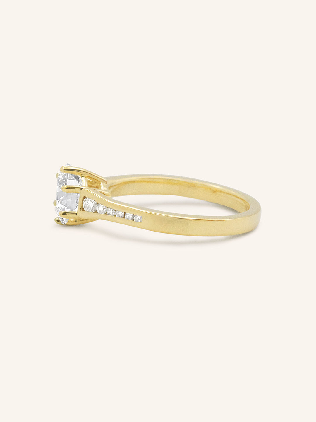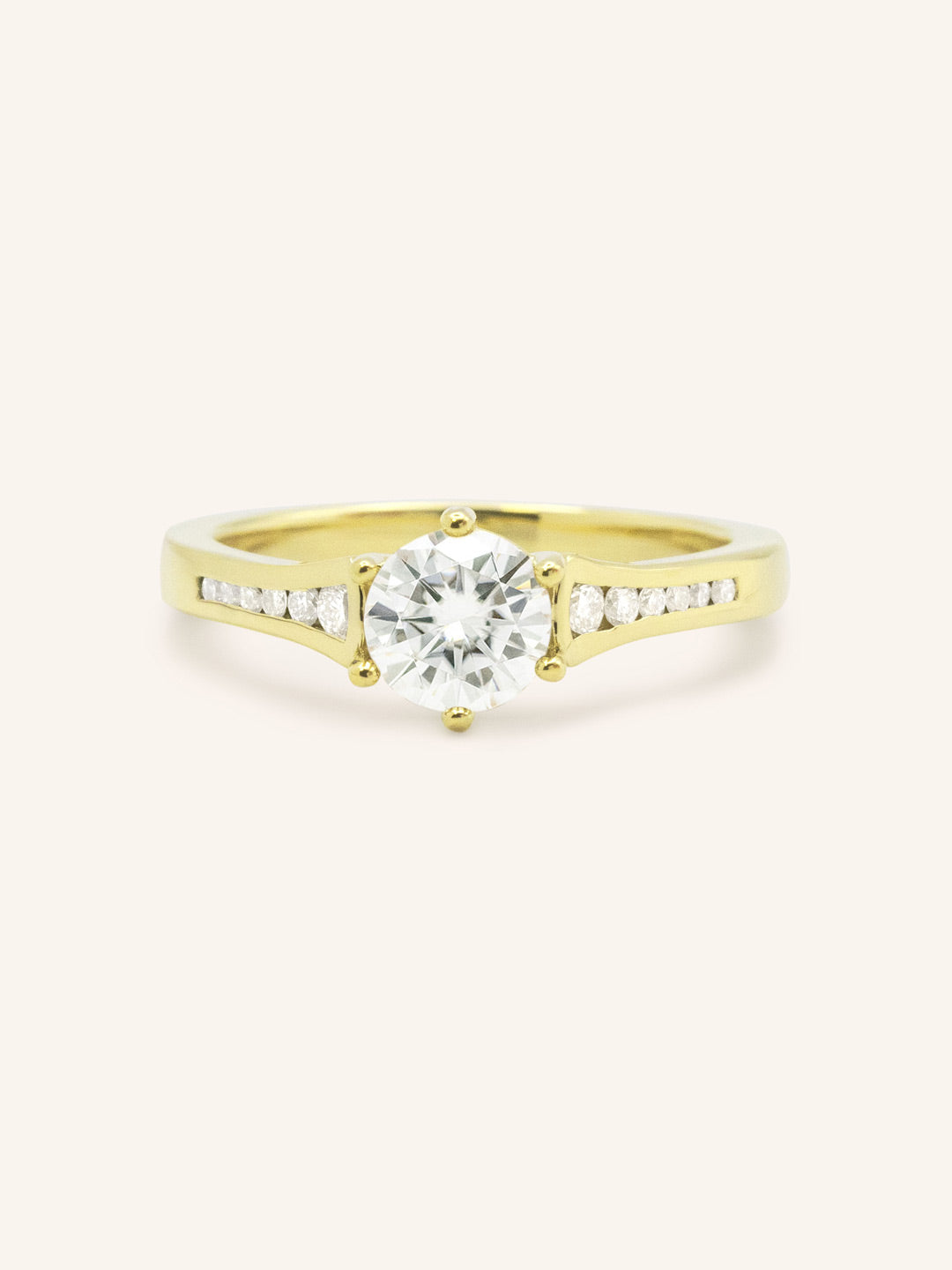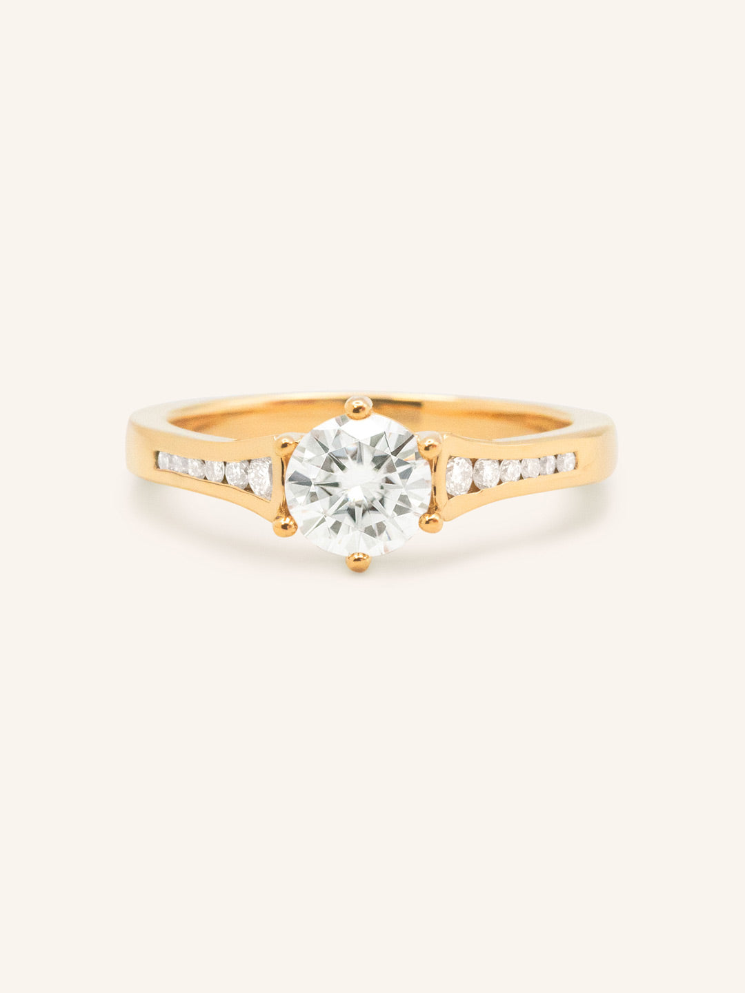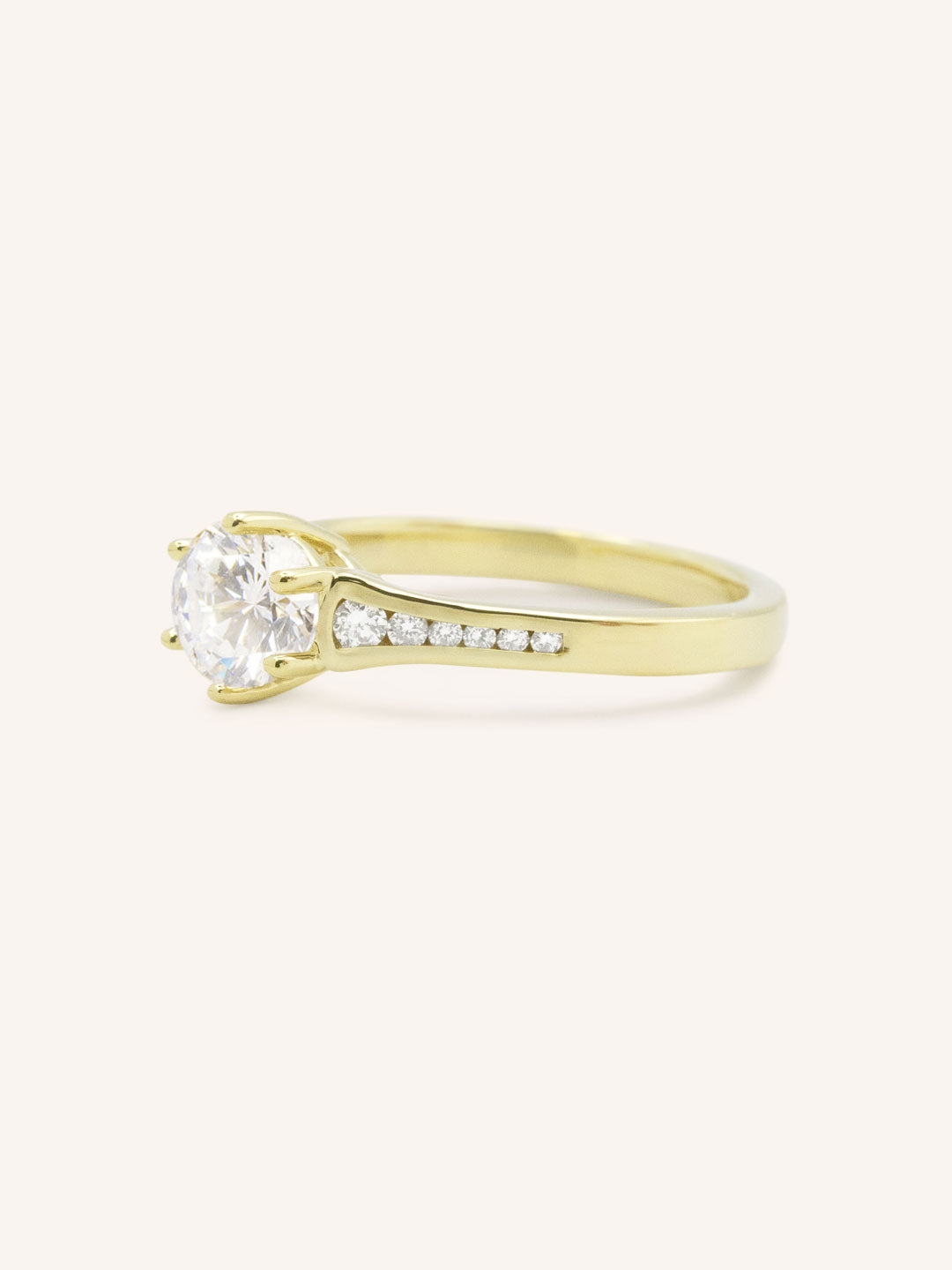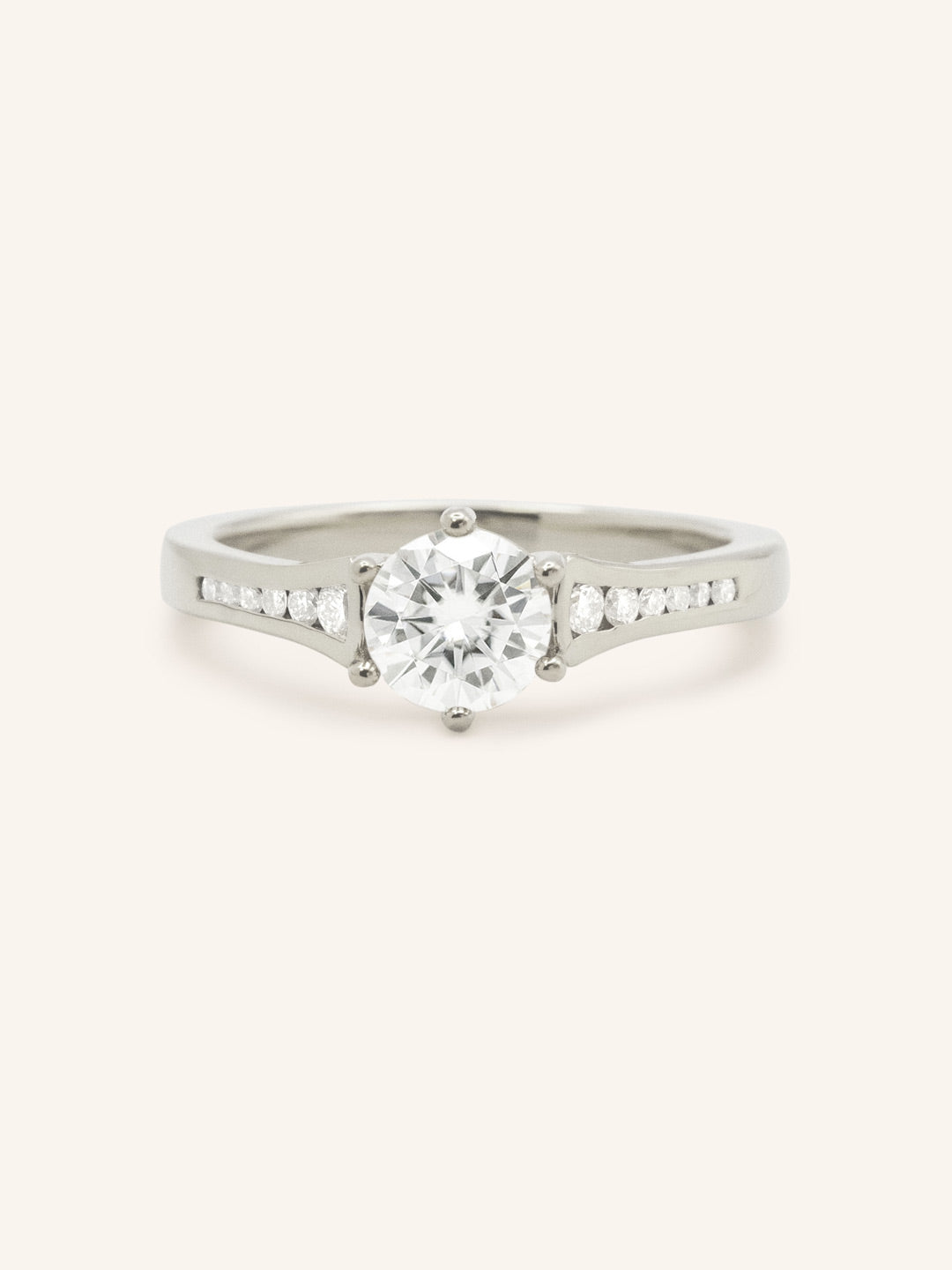 The Lucille Round Diamond Engagement Ring showcases a stunning round center diamond accented by channel-set side stones. This graceful design offers a touch of brilliance and elegance, creating a meaningful symbol of everlasting love.