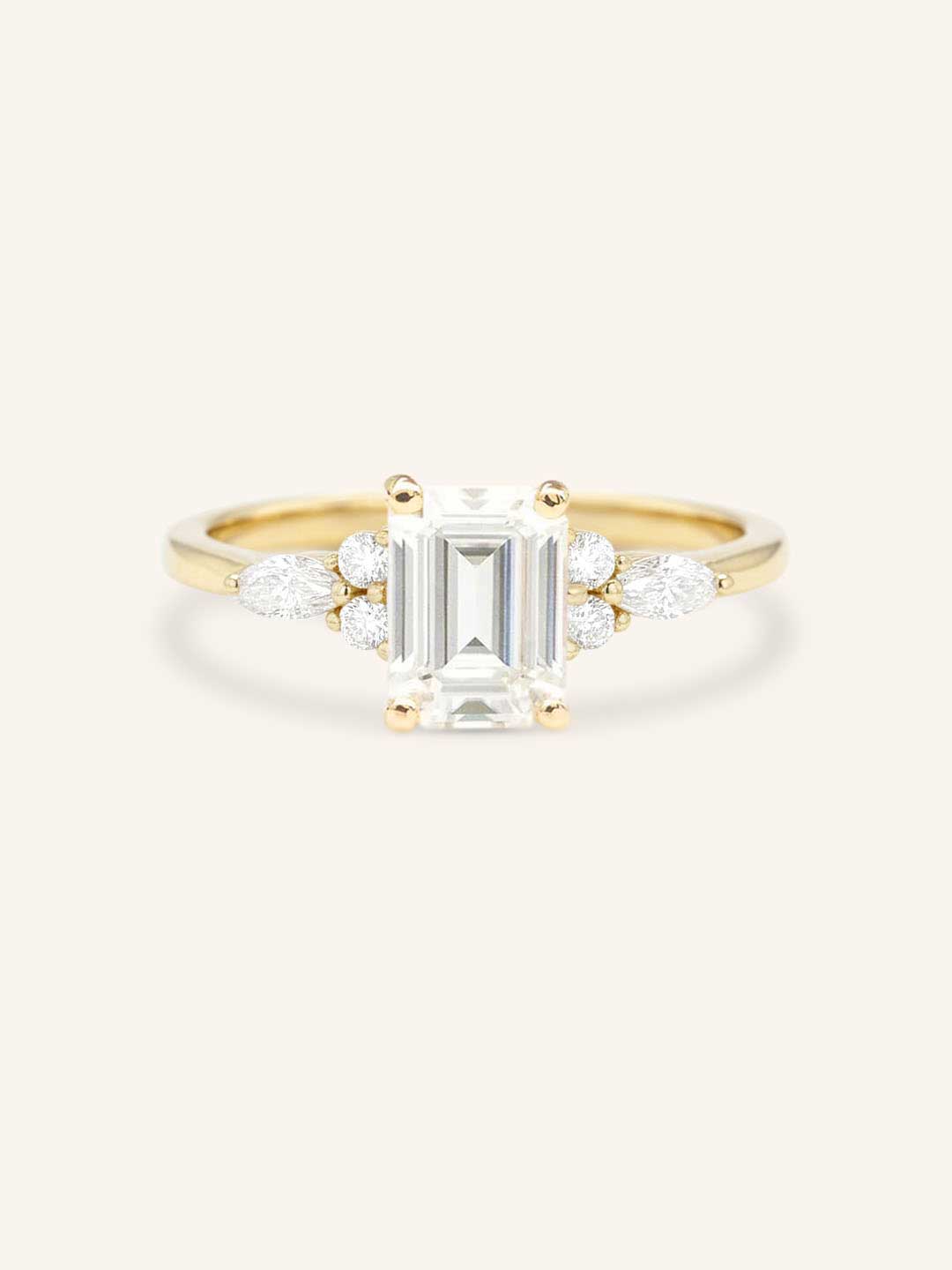Featuring a emerald cut lab-grown diamond, available in 7x5mm, 8x6mm, or 9x7mm sizes. *Sizes are approximate and measurements are subject to change/alter to fit. The center stone will come with a certified report.