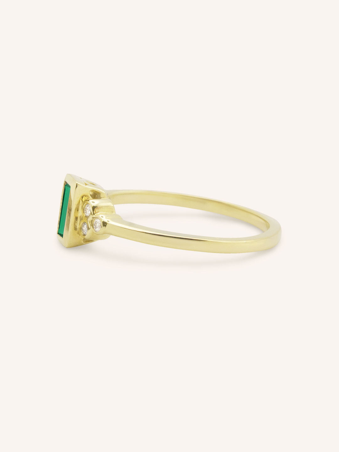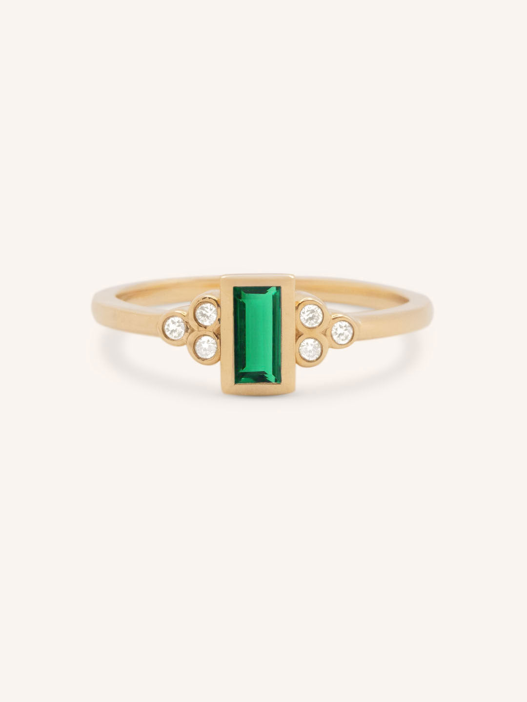 The Abigail Ring features a richly colored gemstone framed by a trio of petite diamonds on each side. Delicate yet vibrant, its timeless silhouette makes it perfect for stacking or wearing solo as a subtle statement.