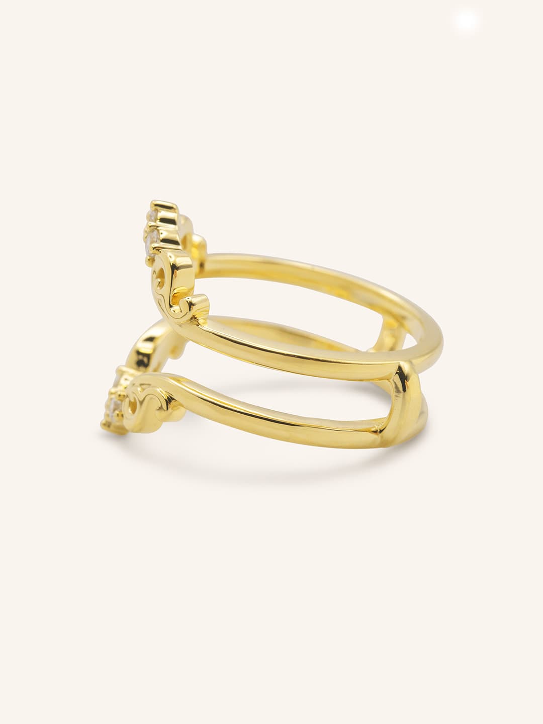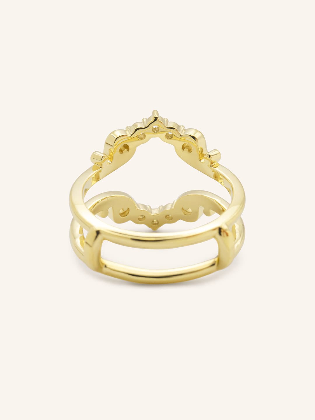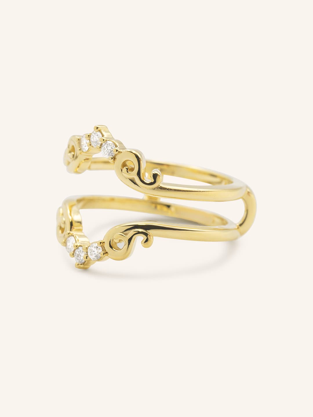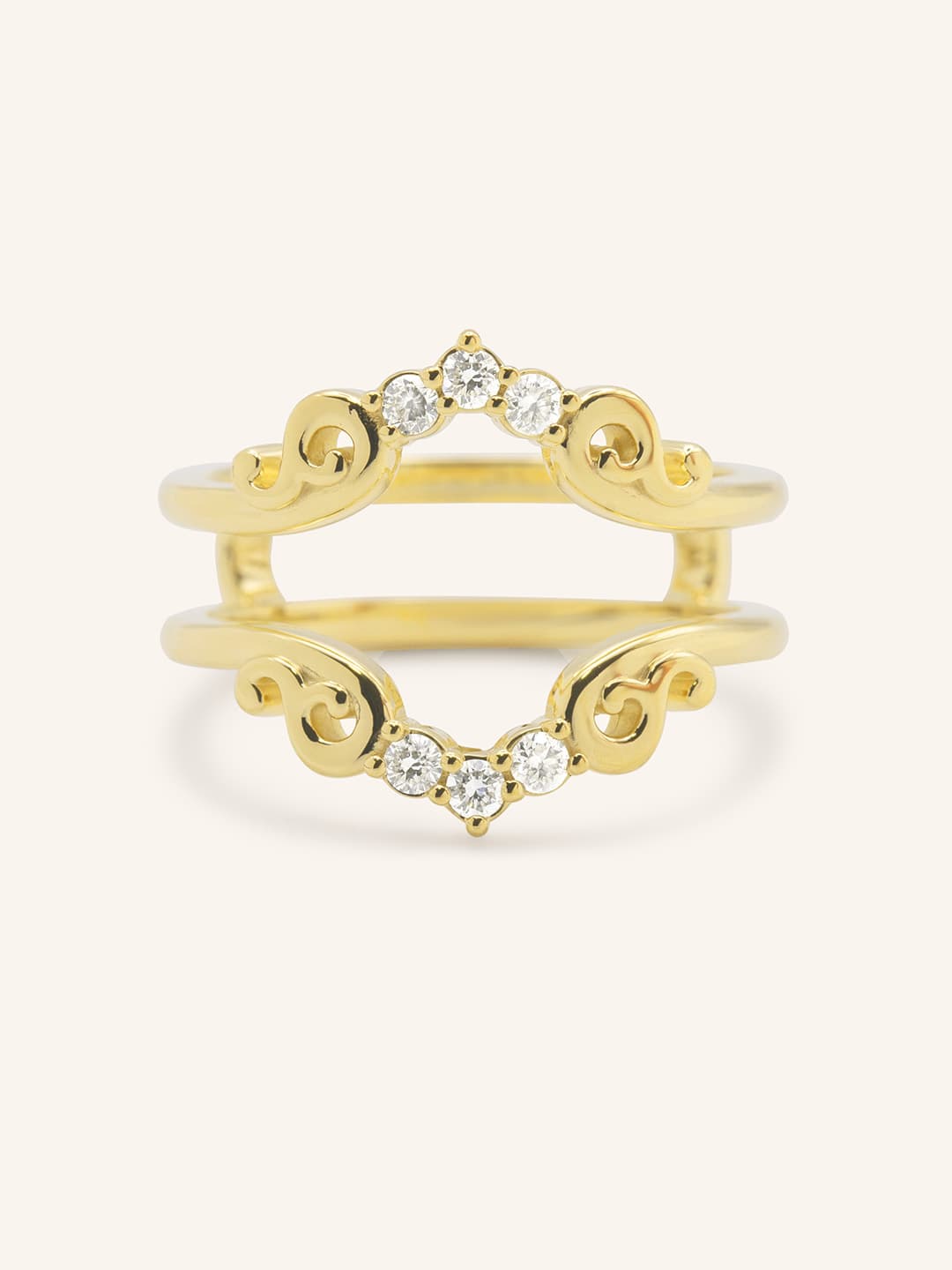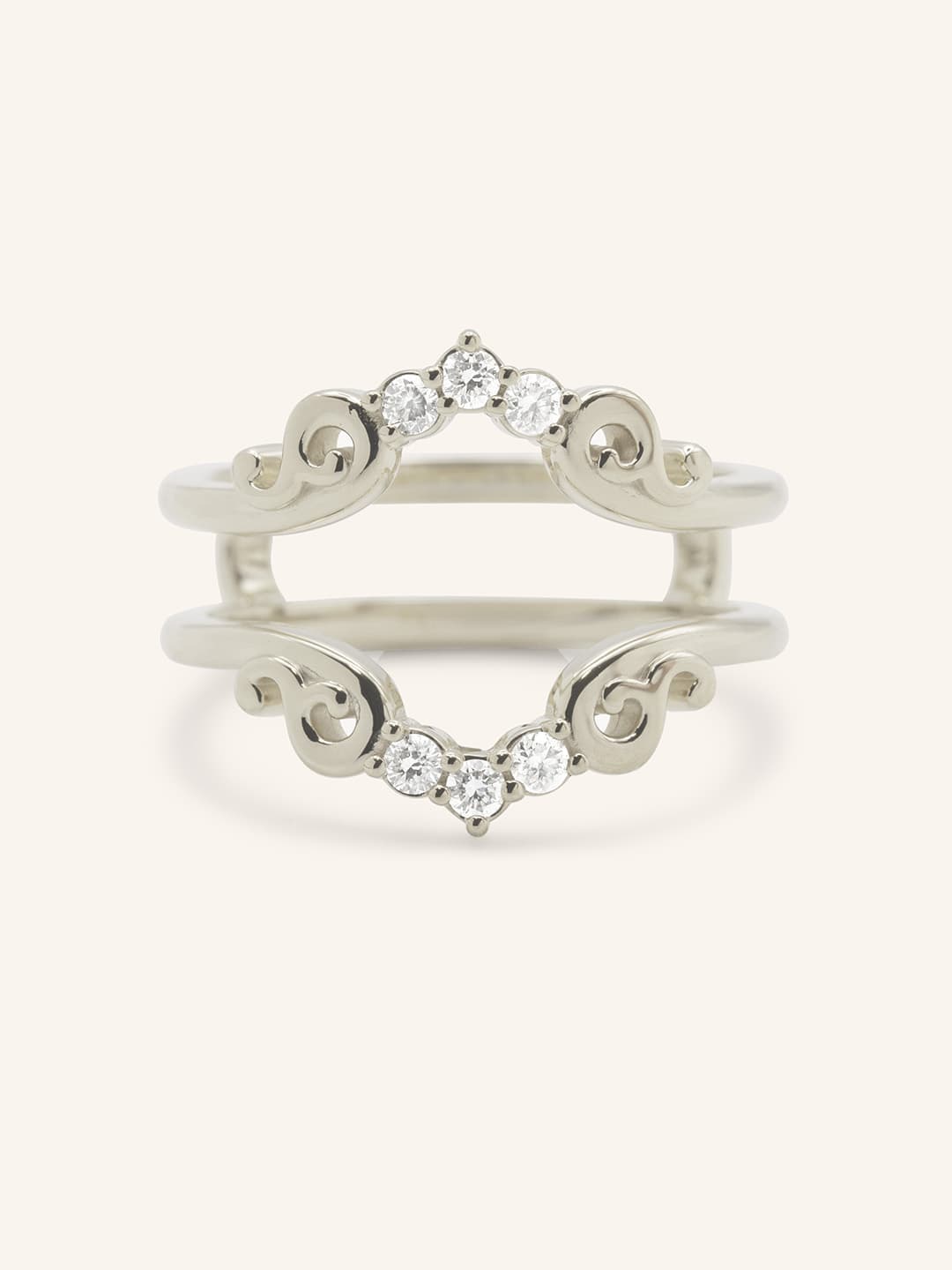 Designed to pair seamlessly with your engagement ring, the Aggie Contour Double Band Diamond Ring Guard brings vintage elegance to life. With its dual curved bands and sparkling diamonds, this piece frames your center ring beautifully while adding depth and brilliance. Intricate and timeless, it’s the perfect complement to the Aggie Contour Diamond Wedding Band or any heirloom-inspired solitaire.
