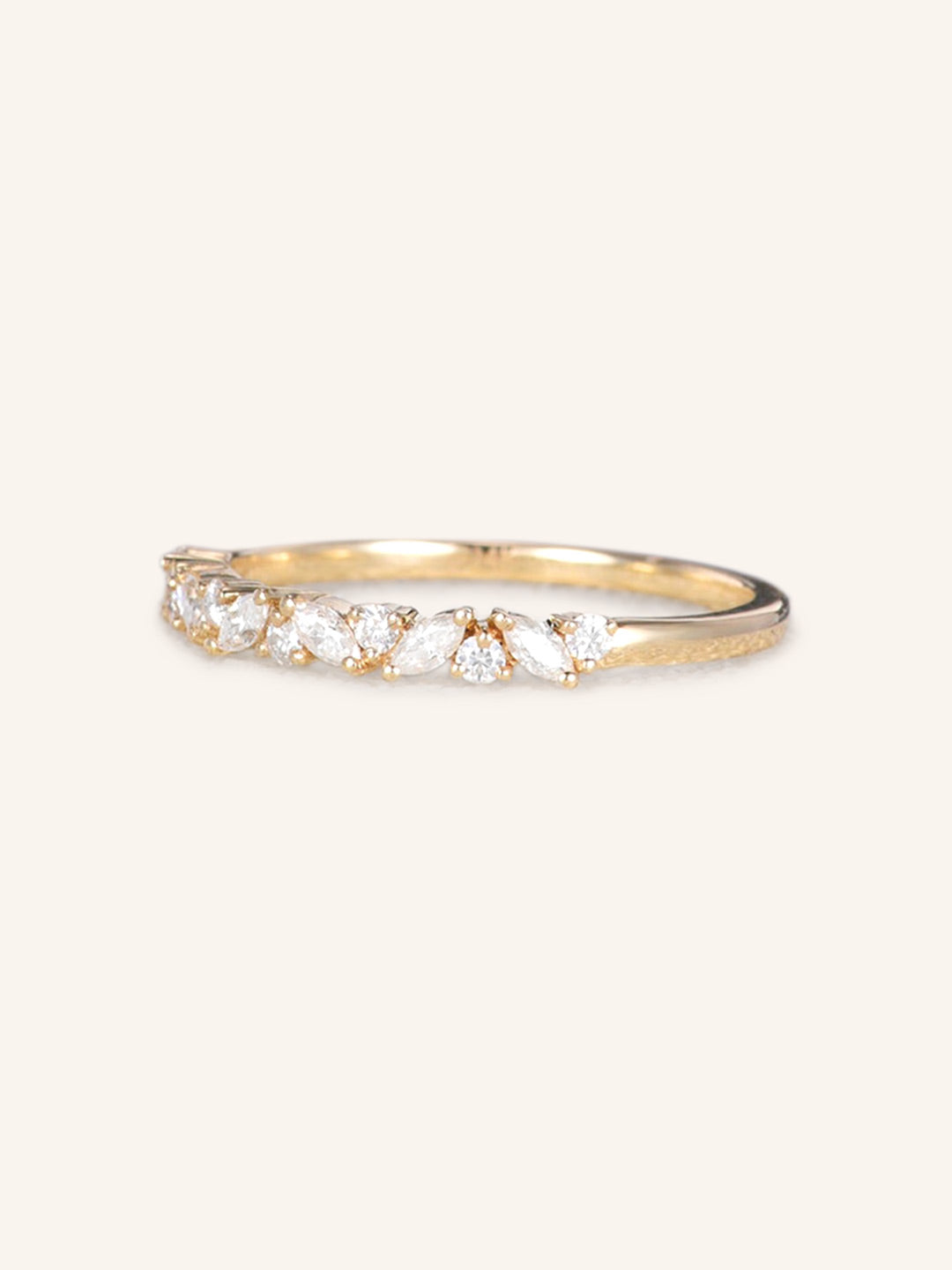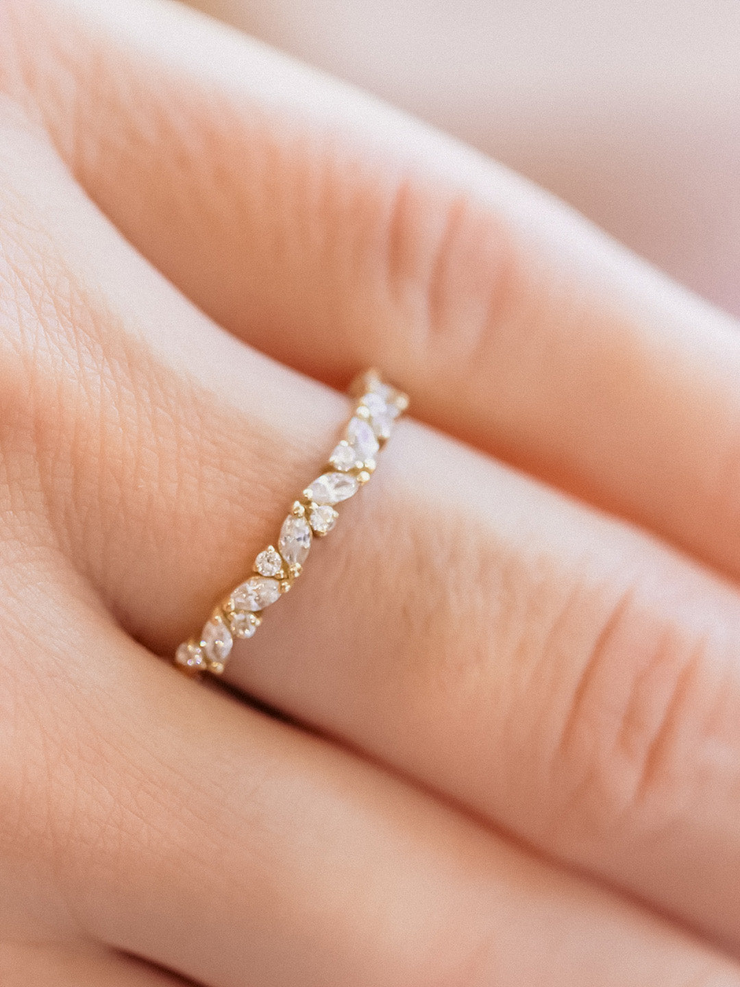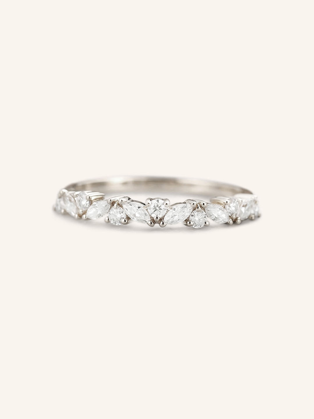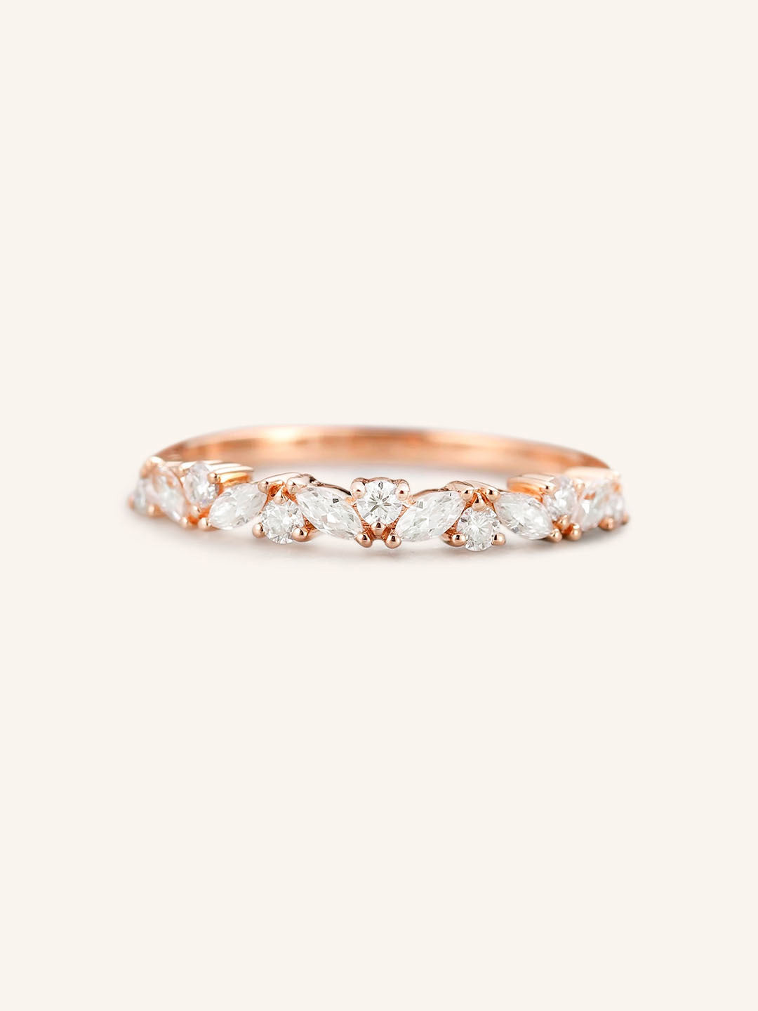 Radiant and captivating, the Marquise Moissanite Cluster Wedding Band exudes timeless elegance and sophistication. The perfect symbol of everlasting love, this stunning band is guaranteed to make your special day even more unforgettable.