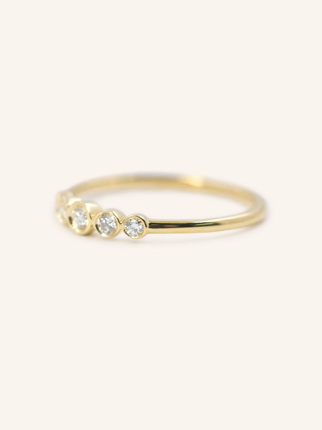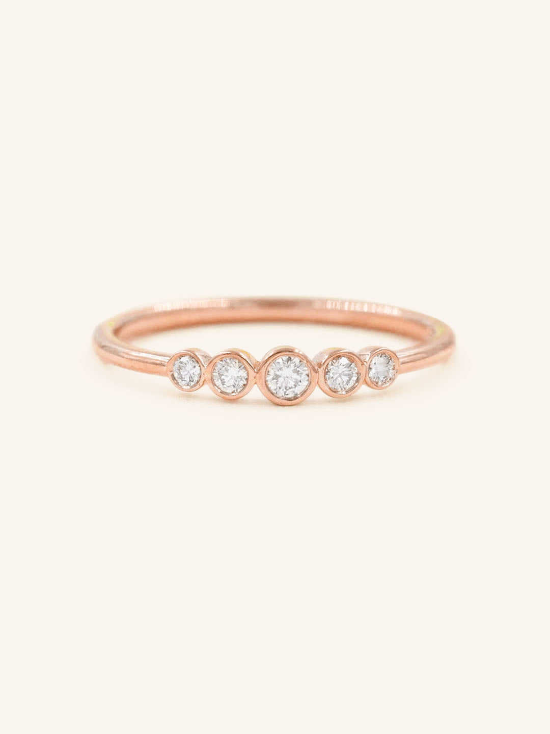 Thoughtfully made with conflict-free diamonds and recycled gold this beautiful diamond wedding band has 5 diamonds that tapers delicately. A great ring that can be worn alone or stacked.