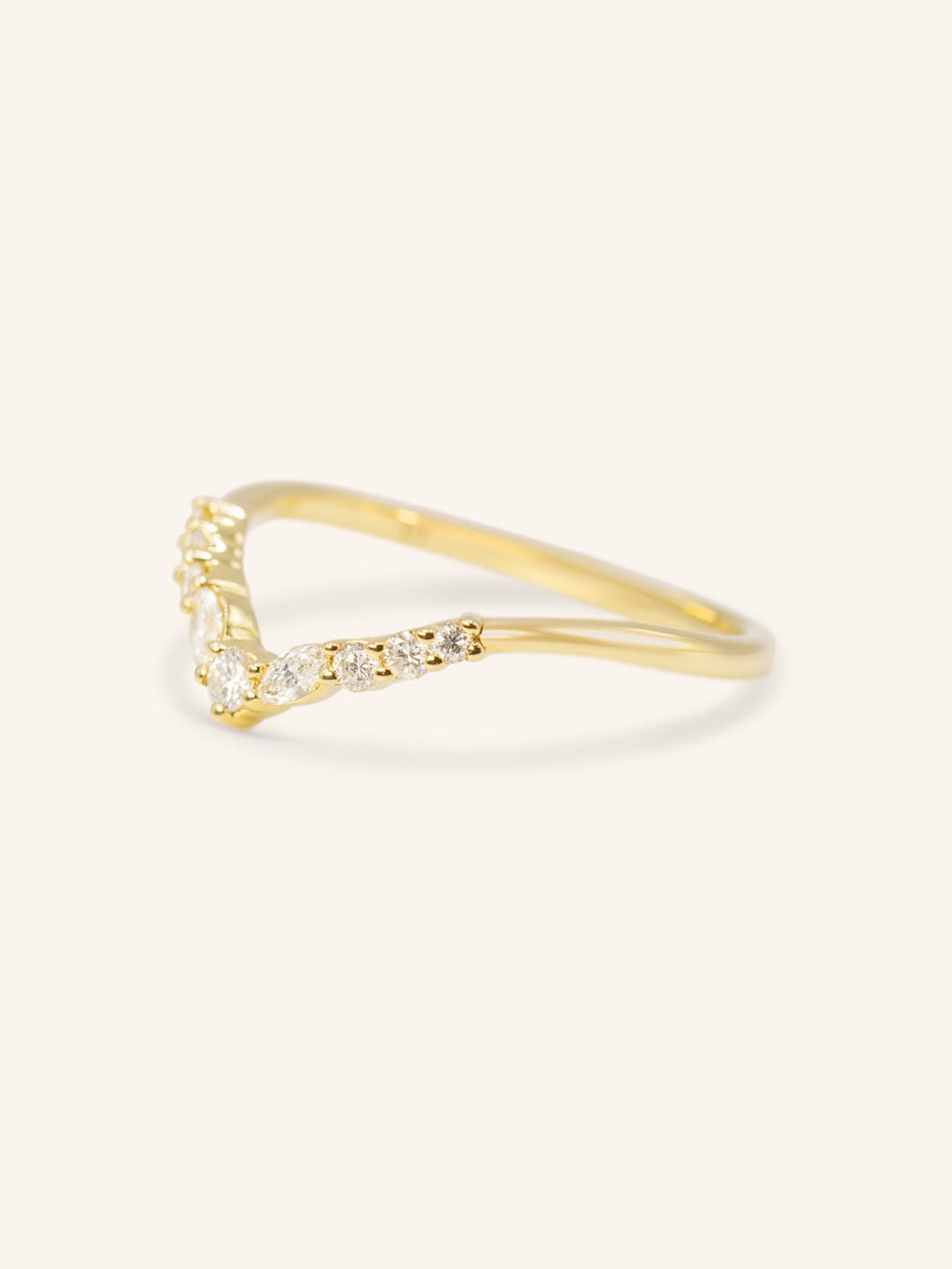 With its unique curved design and stunning diamond accents, this wedding band offers a perfect contour to complement your engagement ring. Make your special day even more memorable with this stunning and timeless addition.