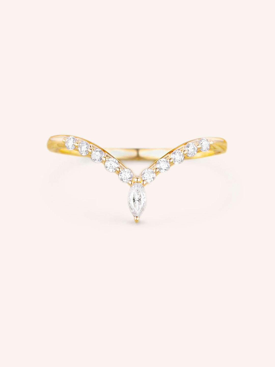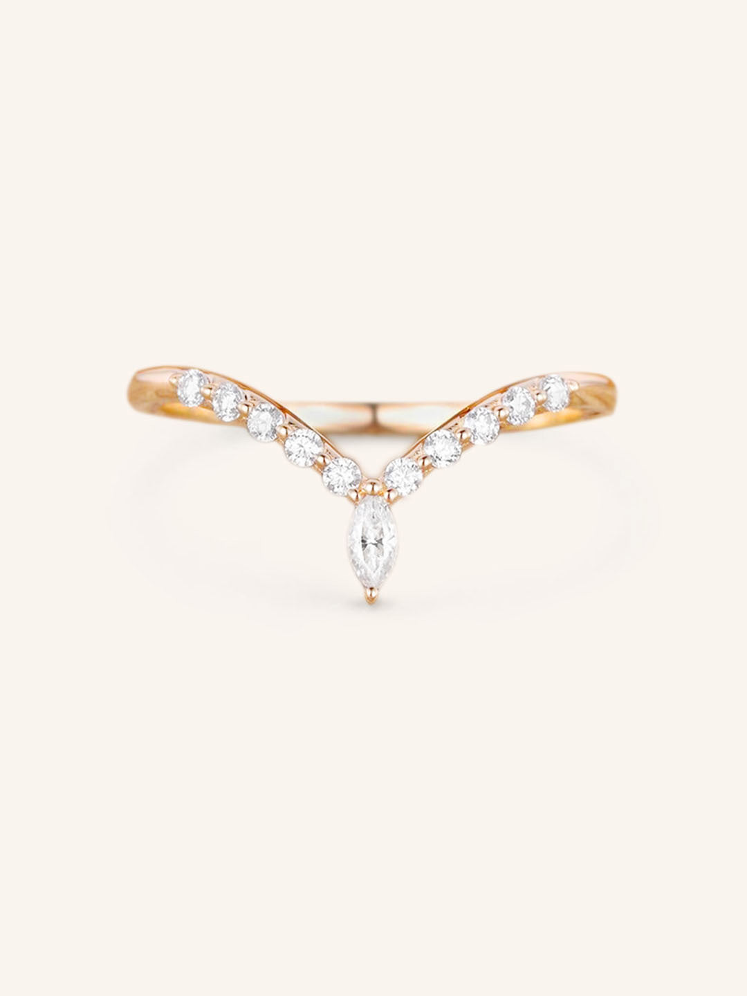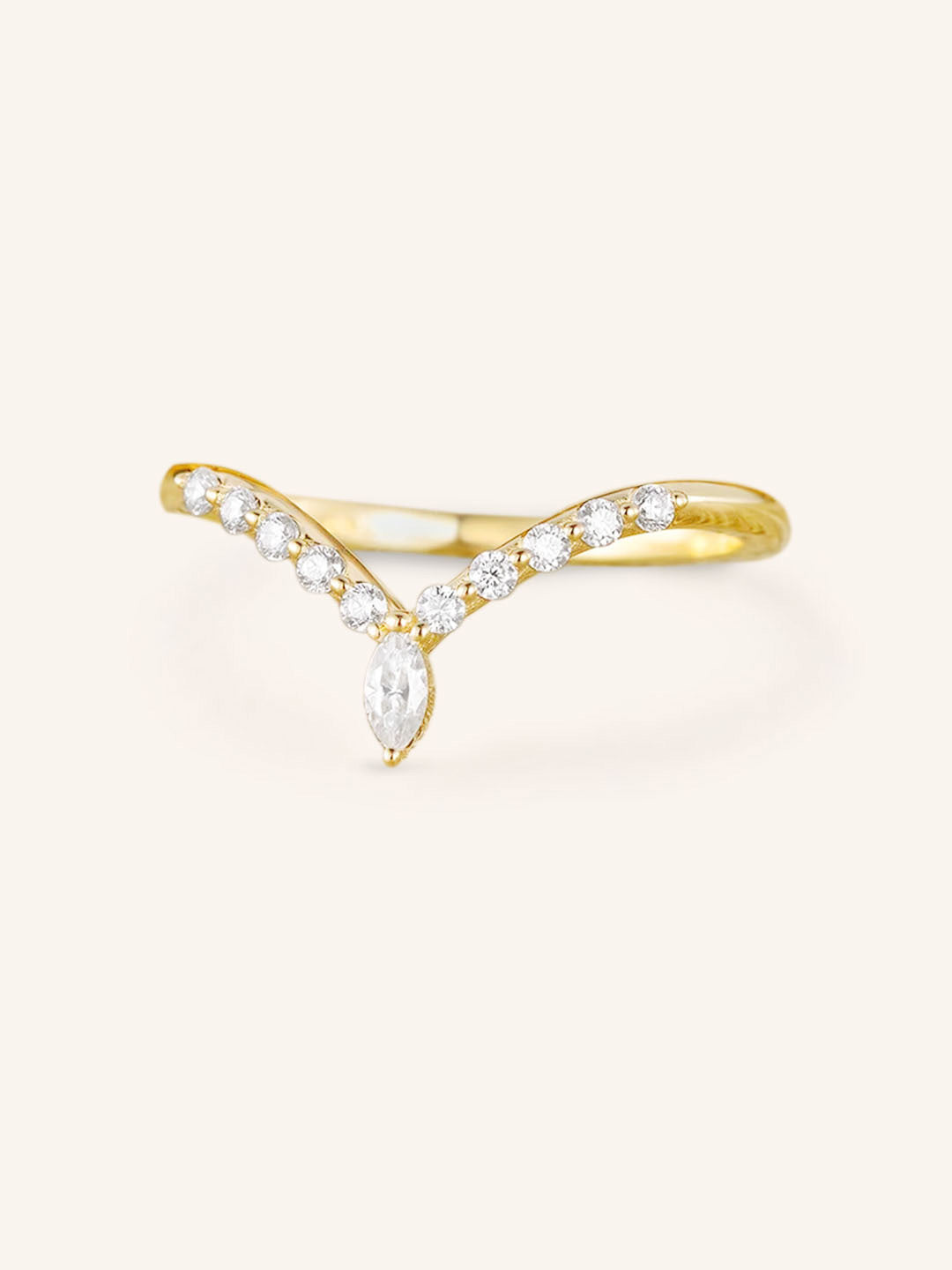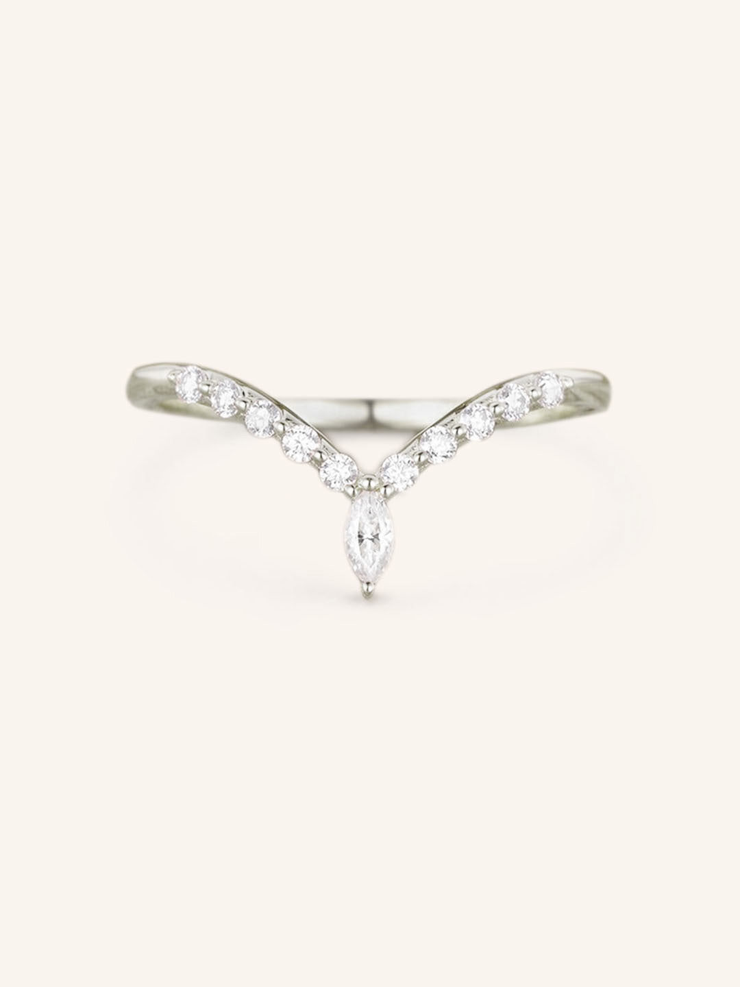 Our marquise and round moissanite and diamond chevron wedding band is a delicate and elegant choice for the bride who loves a dainty and minimal look. The chevron design is perfect for stacking with other rings, and the natural beauty of the moissanites and diamonds shines through.