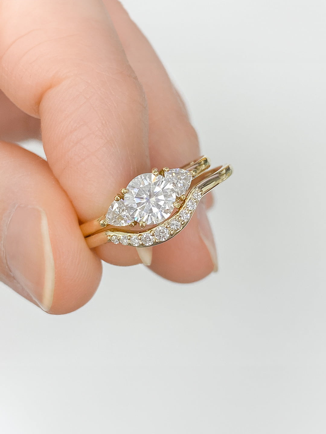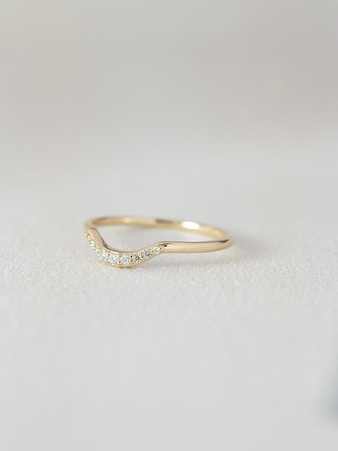 Experience timeless elegance with the Cassio Curved Diamond Wedding Band. This nesting ring's curved design and sparkling diamonds create a stunning, luxurious aesthetic that will turn any special moment into an unforgettable one. Crafted to the highest standards, it is the perfect accessory to make any bride feel radiant.