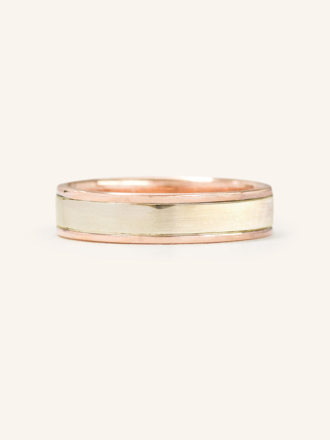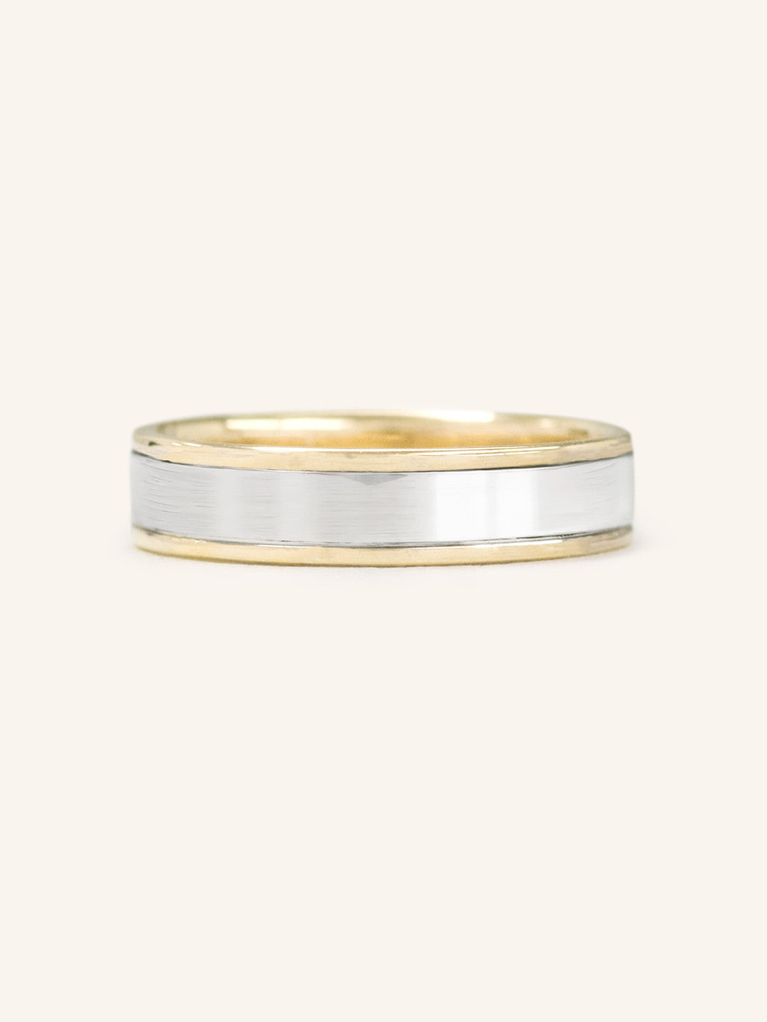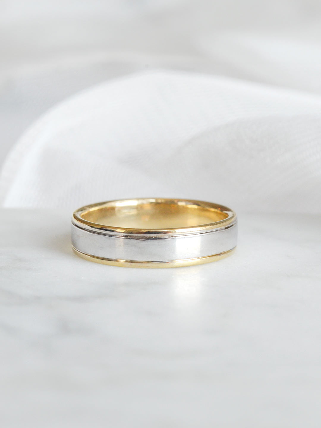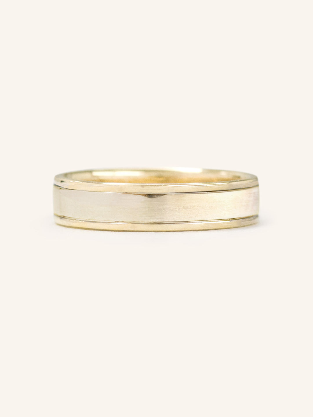 A classic two-tone half-flat edge band 5MM in width. The Coupled Wrought Band symbolizes your union and your promise to cherish each other forever. It's a comfortable ring with grooved edges - a subtle twist to a classic piece.