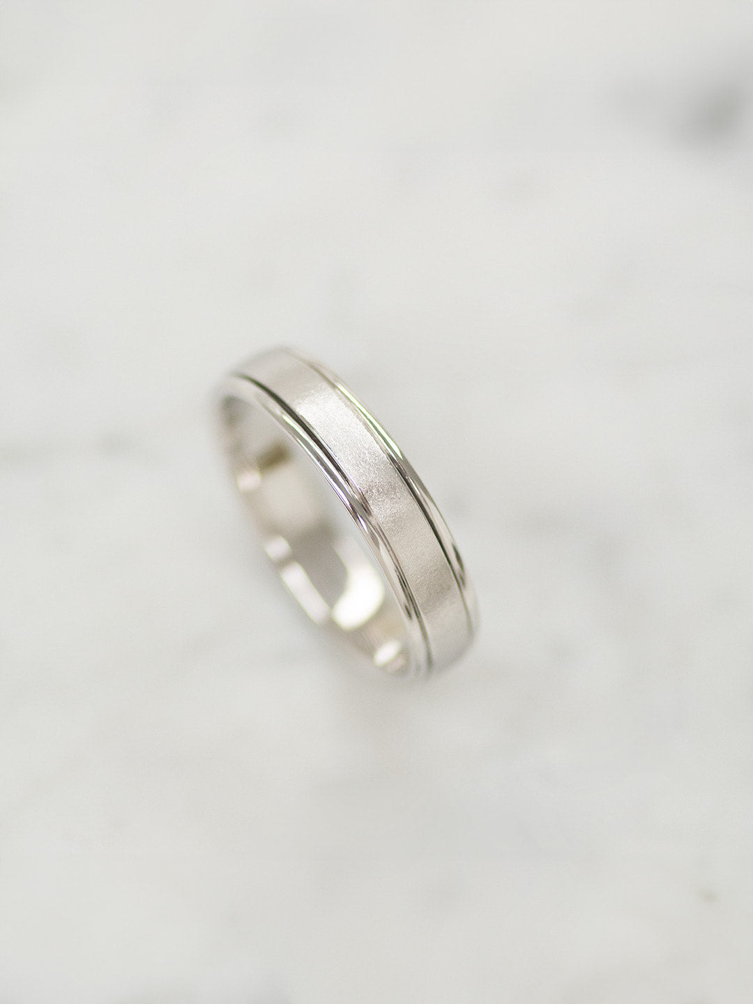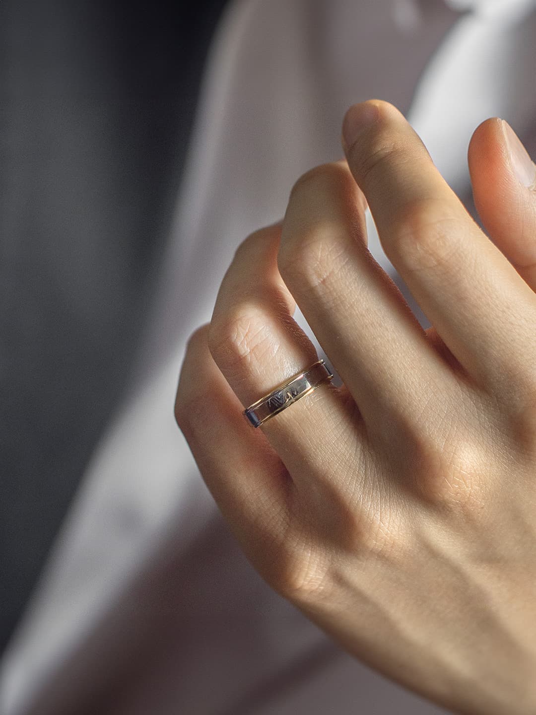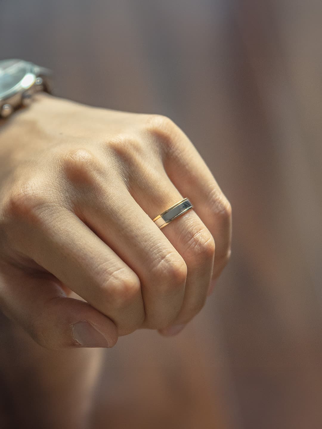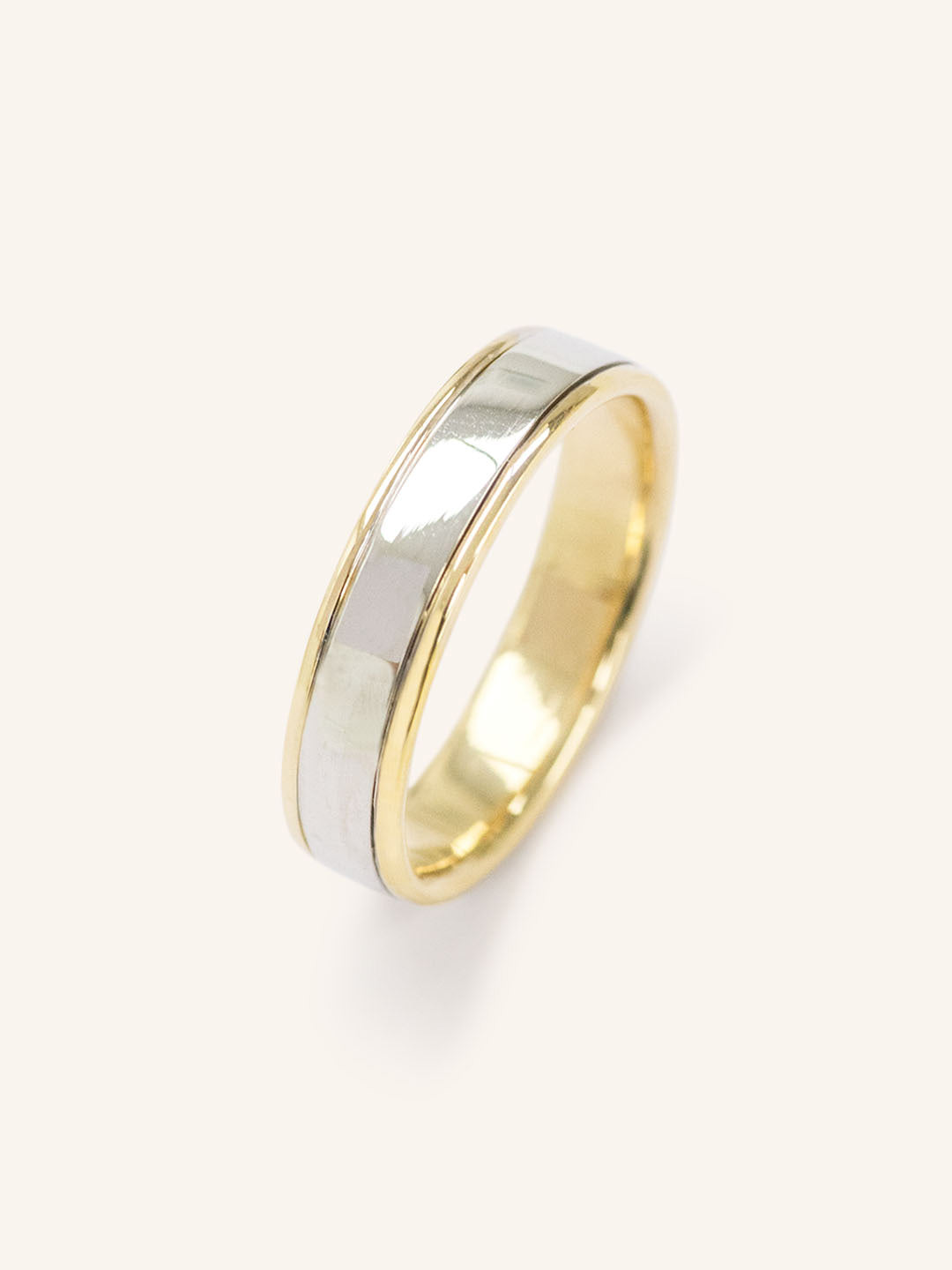 A classic two-tone half-flat edge band 5MM in width. The Coupled Wrought Band symbolizes your union and your promise to cherish each other forever. It's a comfortable ring with grooved edges - a subtle twist to a classic piece.