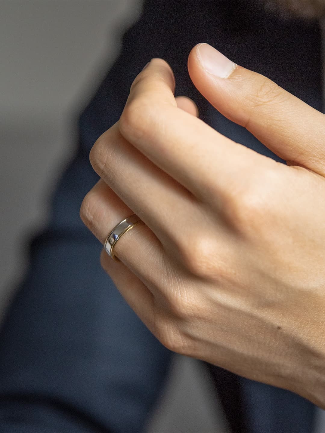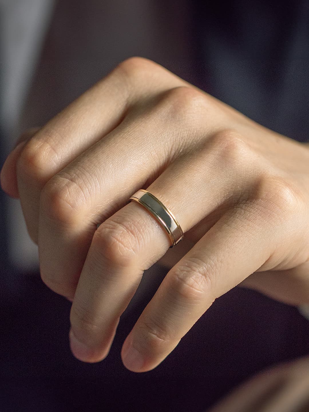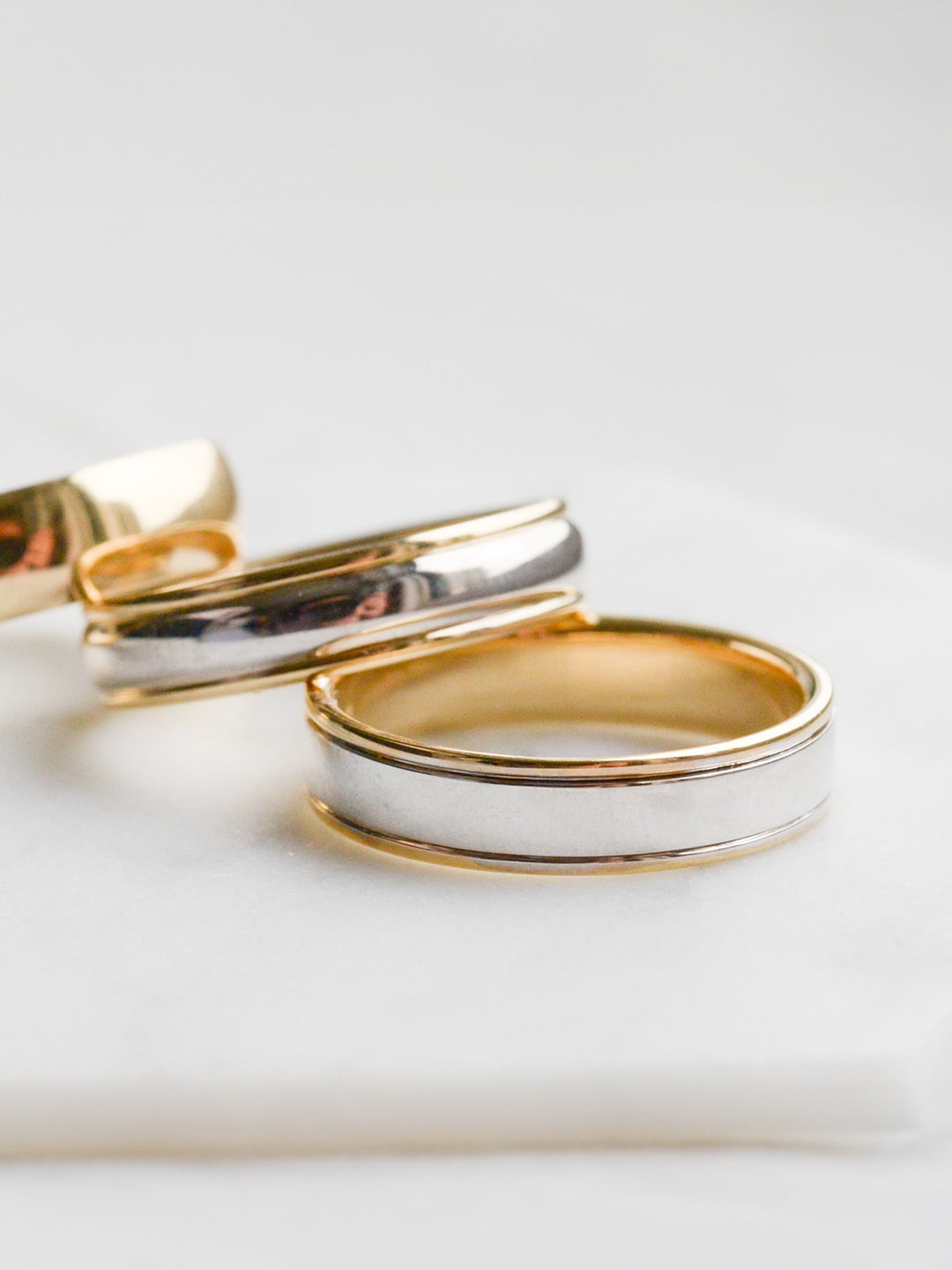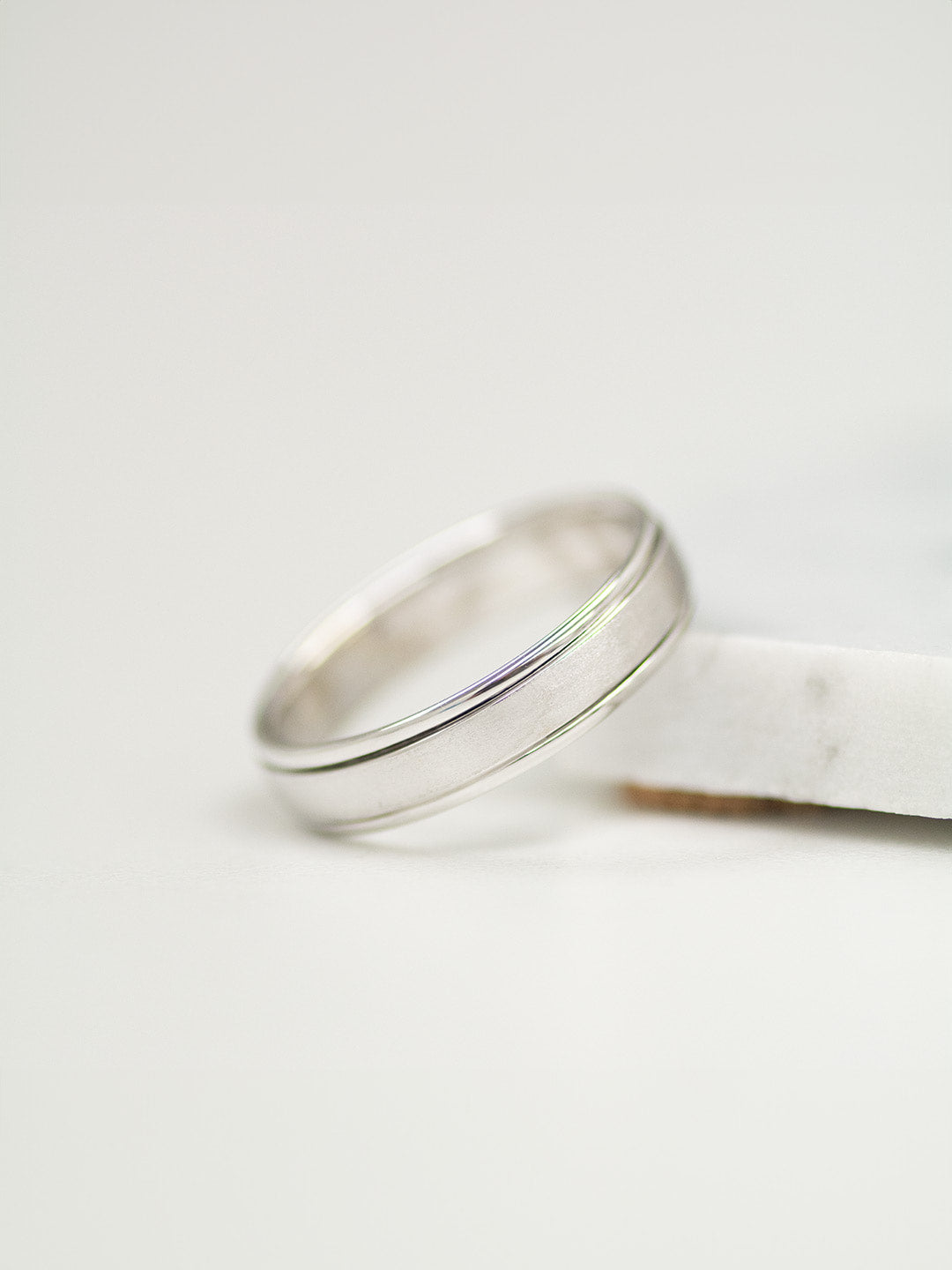 A classic two-tone half-flat edge band 5MM in width. The Coupled Wrought Band symbolizes your union and your promise to cherish each other forever. It's a comfortable ring with grooved edges - a subtle twist to a classic piece.