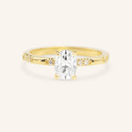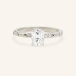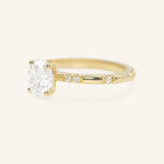 The Eliane Oval Diamond Accented Engagement Ring is a refined design that embodies understated beauty. Featuring an elegant oval diamond as the centerpiece, this ring is enhanced with a band of delicately spaced diamonds, creating a balanced and modern look. The subtle placement of the accent diamonds allows the center stone to take the spotlight while adding a touch of brilliance to the overall design. A timeless choice for those who appreciate sophistication and simplicity.