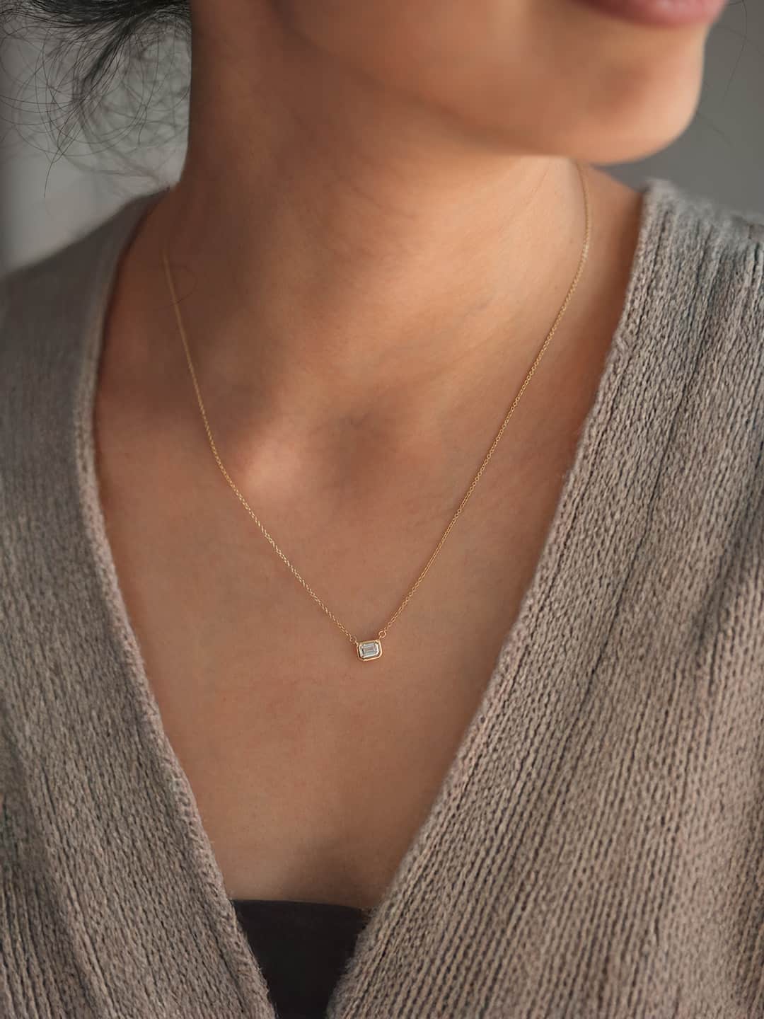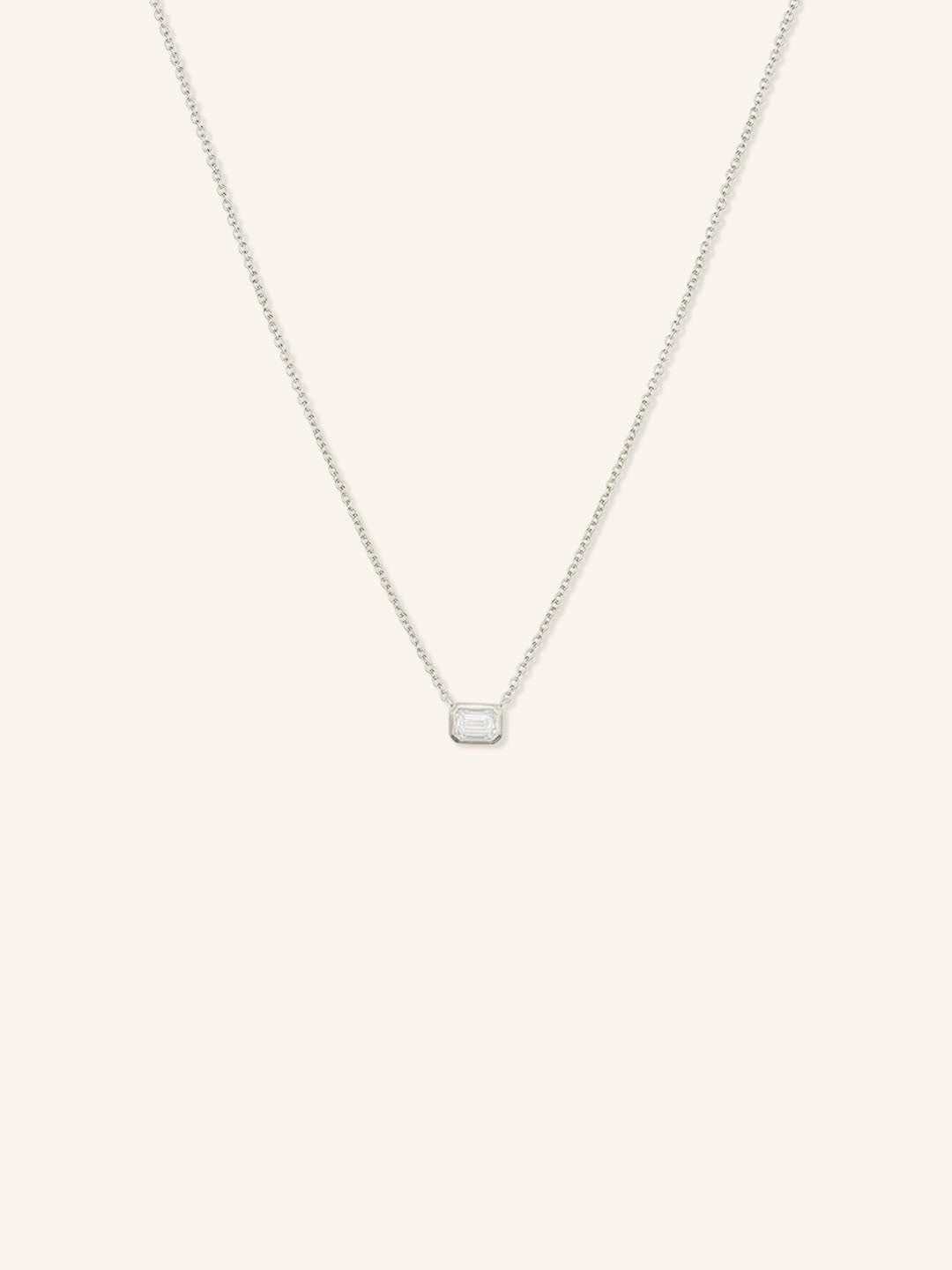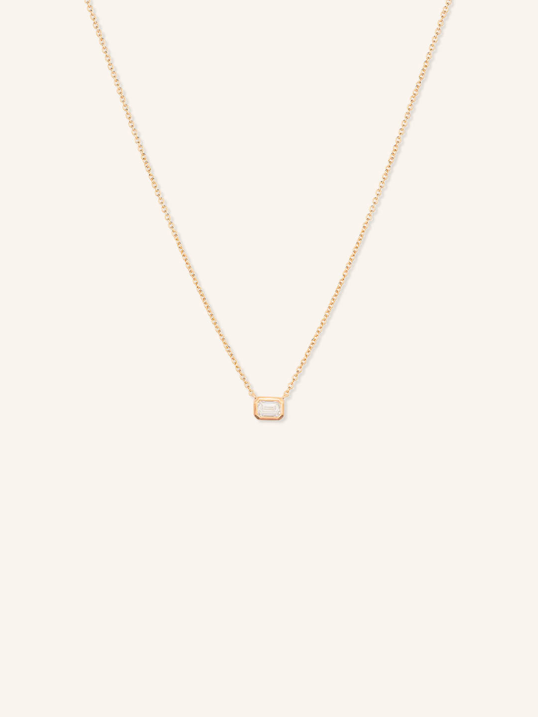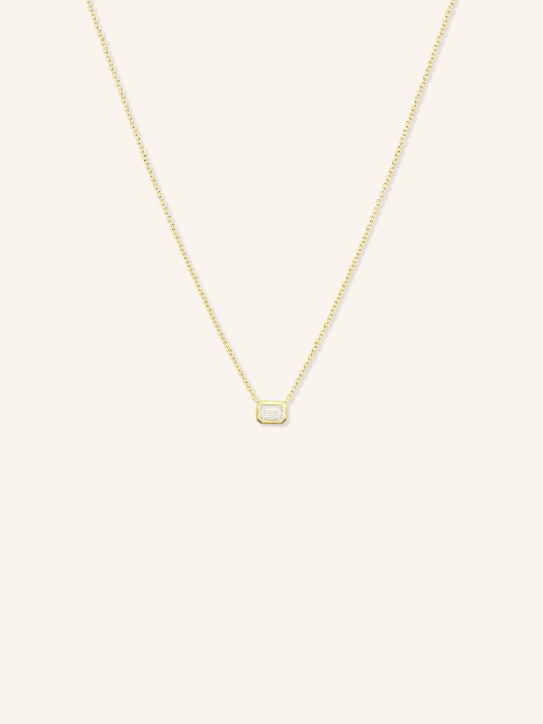The Emerald Cut Diamond Bezel Set Pendant Necklace features a stunning lab-grown emerald-cut diamond set in an east-west orientation, offering a sleek and modern twist on a classic design. Framed in a smooth 14k gold bezel, the pendant beautifully highlights the diamond’s clean lines and brilliance. Perfect for everyday elegance or special occasions, this necklace is a timeless piece with a sustainable touch.