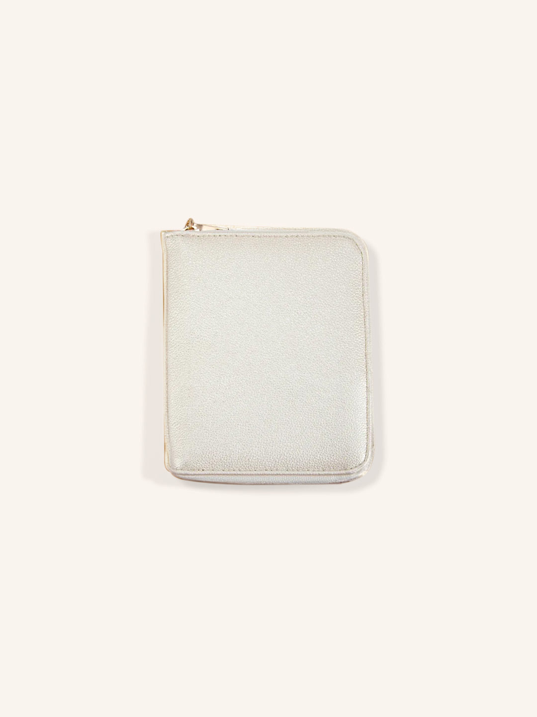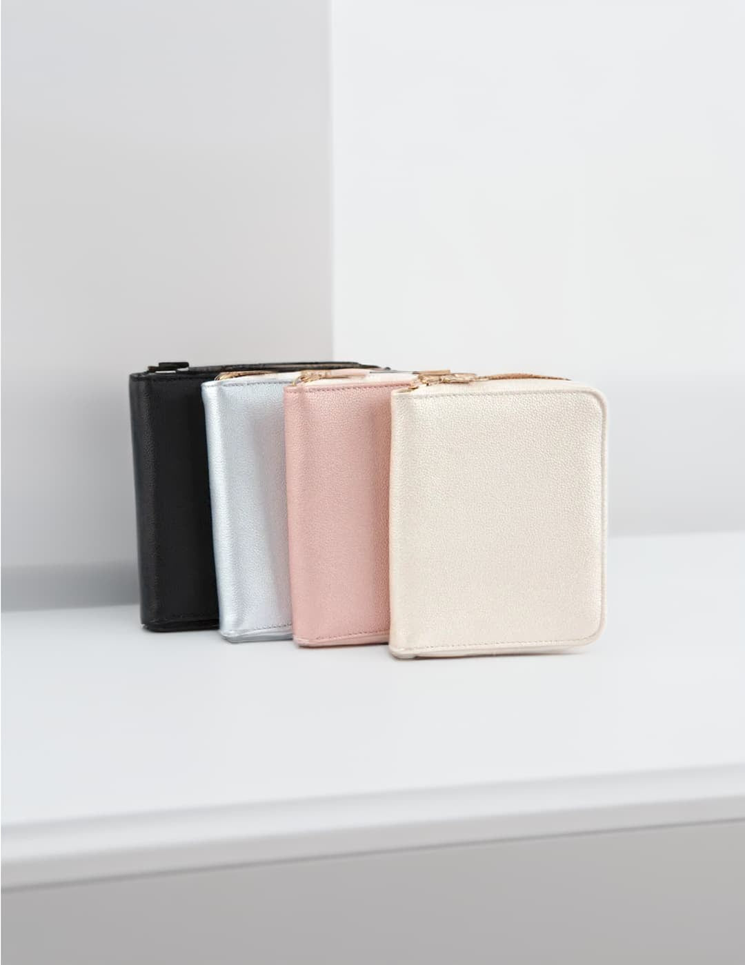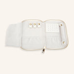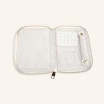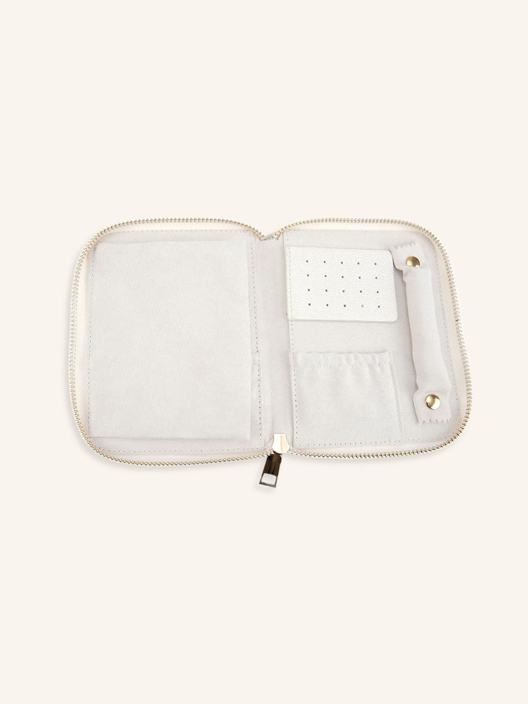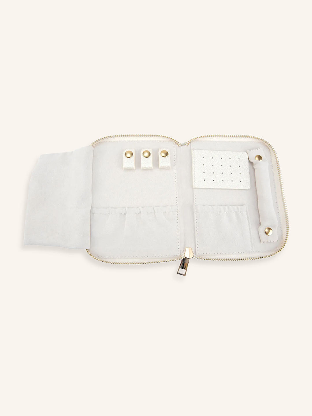 Organize your jewelry in style with our Leatherette Jewelry Travel Case. The luxurious silver design features a zipper closure and ivory suede interior for a sophisticated touch. With various compartments such as ring roll, pockets, and snap closures, this case provides convenience and elegance on the go.