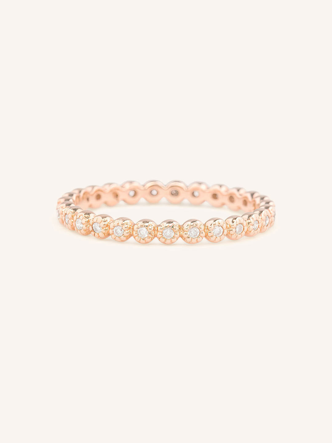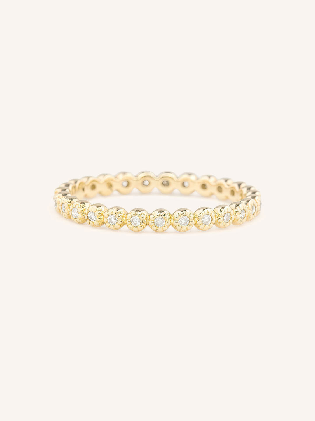 The Louise Diamond Milgrain Eternity Band features a continuous circle of diamonds framed with intricate milgrain detailing. Its vintage-inspired style and elegant craftsmanship make it a timeless symbol of everlasting love.