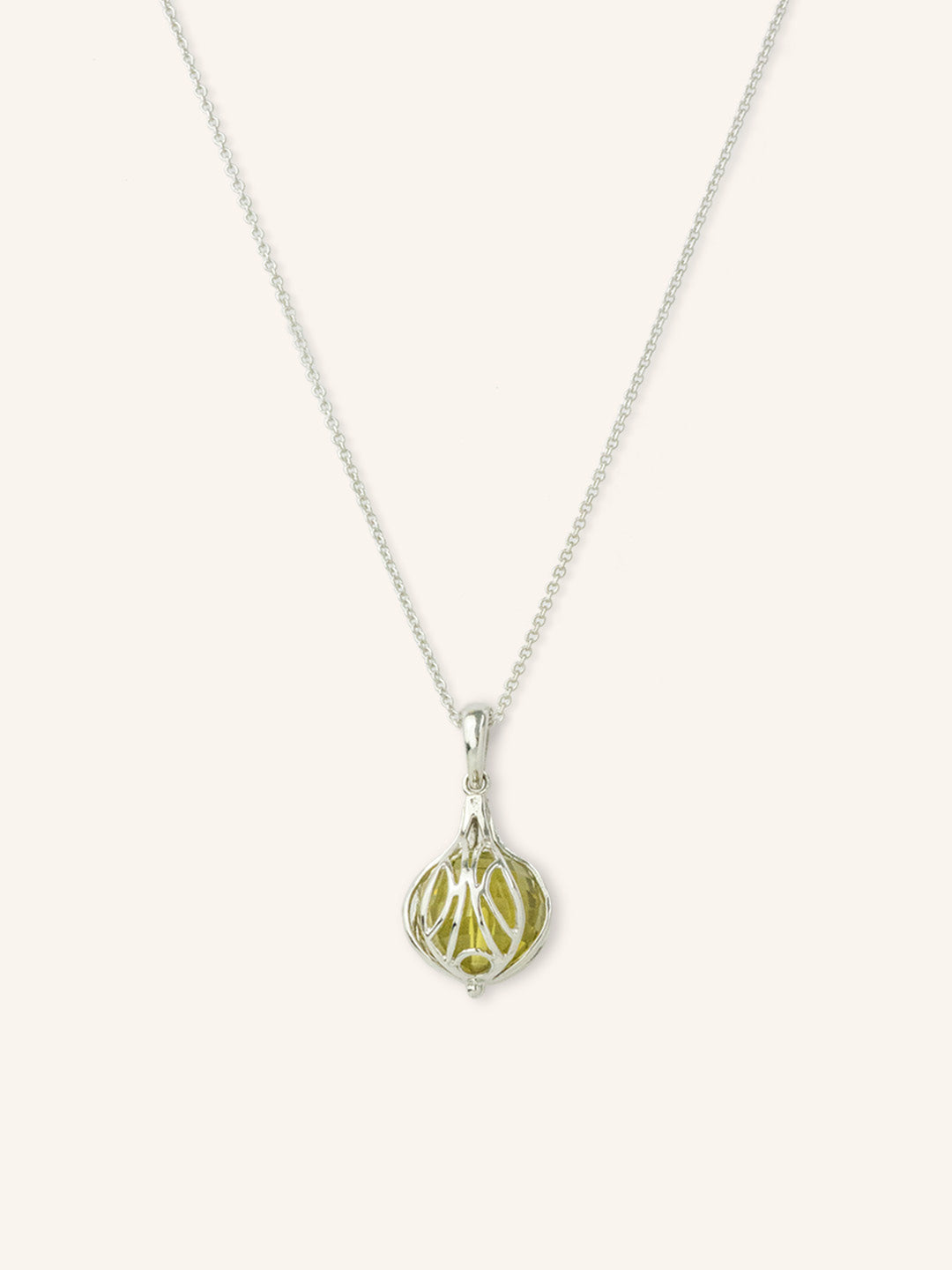 A beautiful green gold colored gemstone shaped like a delicate peach inside a lace carved encasing, a wonderful part of your fall wedding.