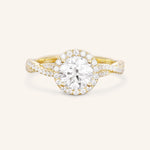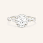 Celebrate your love in style with our beautifully crafted halo diamond engagement ring. Featuring a unique twisted band design, this ring is a true standout. The halo setting enhances the diamond's brilliance, while the modern twist on the band adds a touch of elegance. It's the perfect choice for anyone looking for a one-of-a-kind ring that symbolizes their commitment and love. With its timeless design and modern touch, it's a ring that will be cherished for a lifetime.