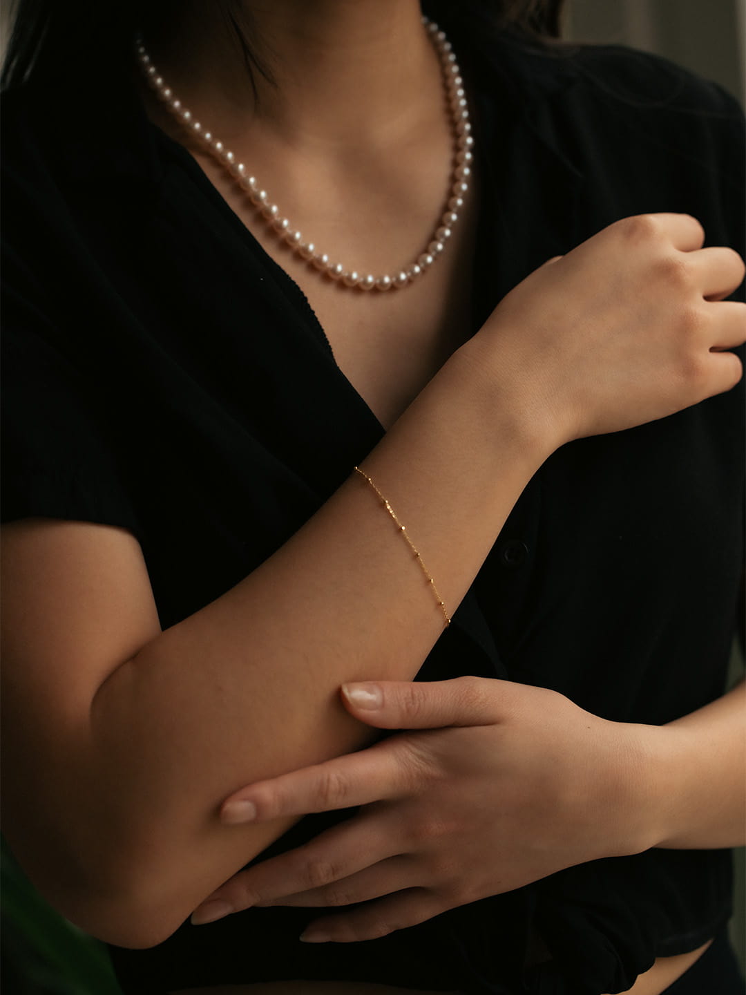 Keep your bracelet away from chlorine, bleach, and other strong household cleaners, as they can dull the finish over time—even on solid gold.