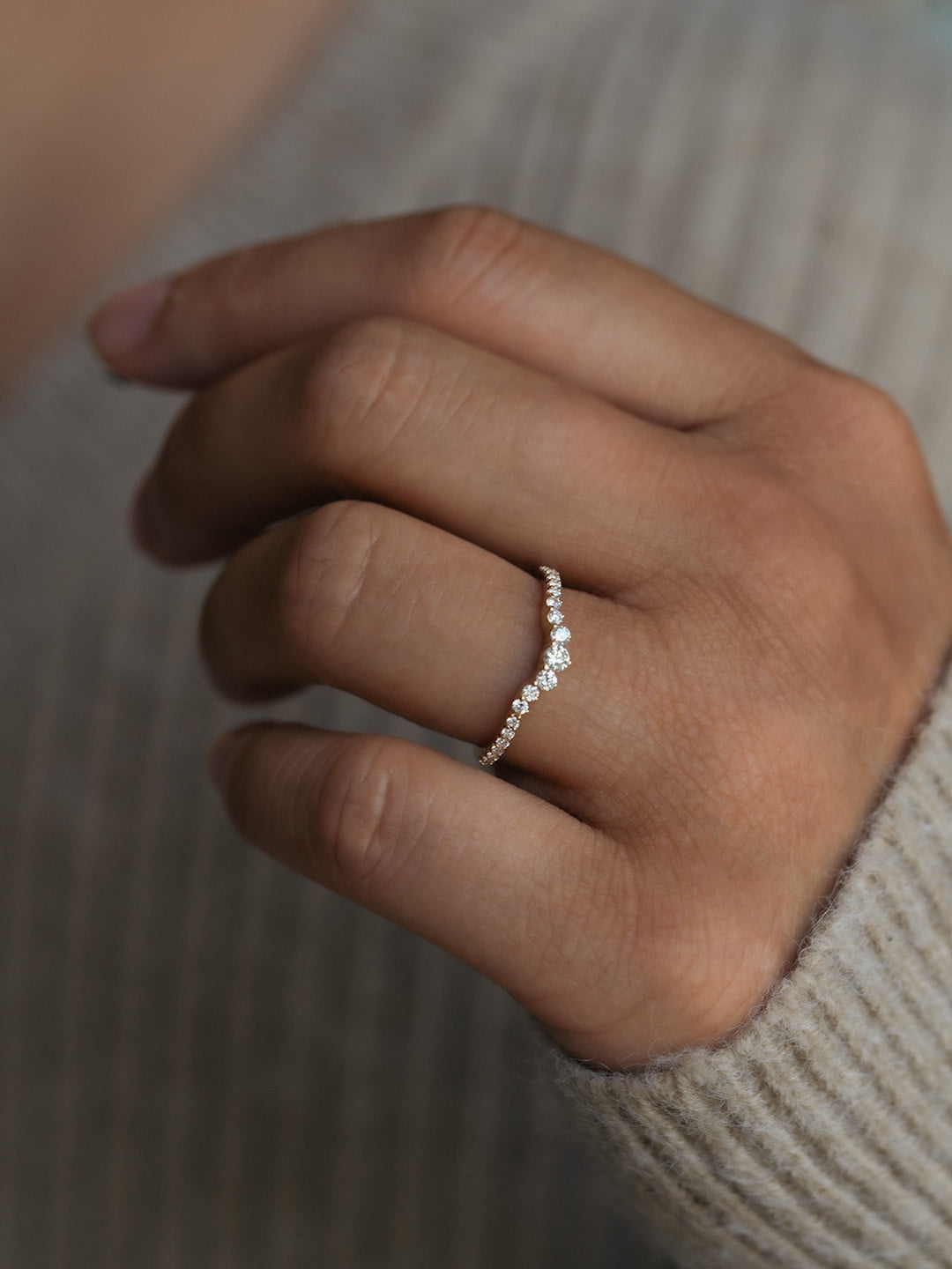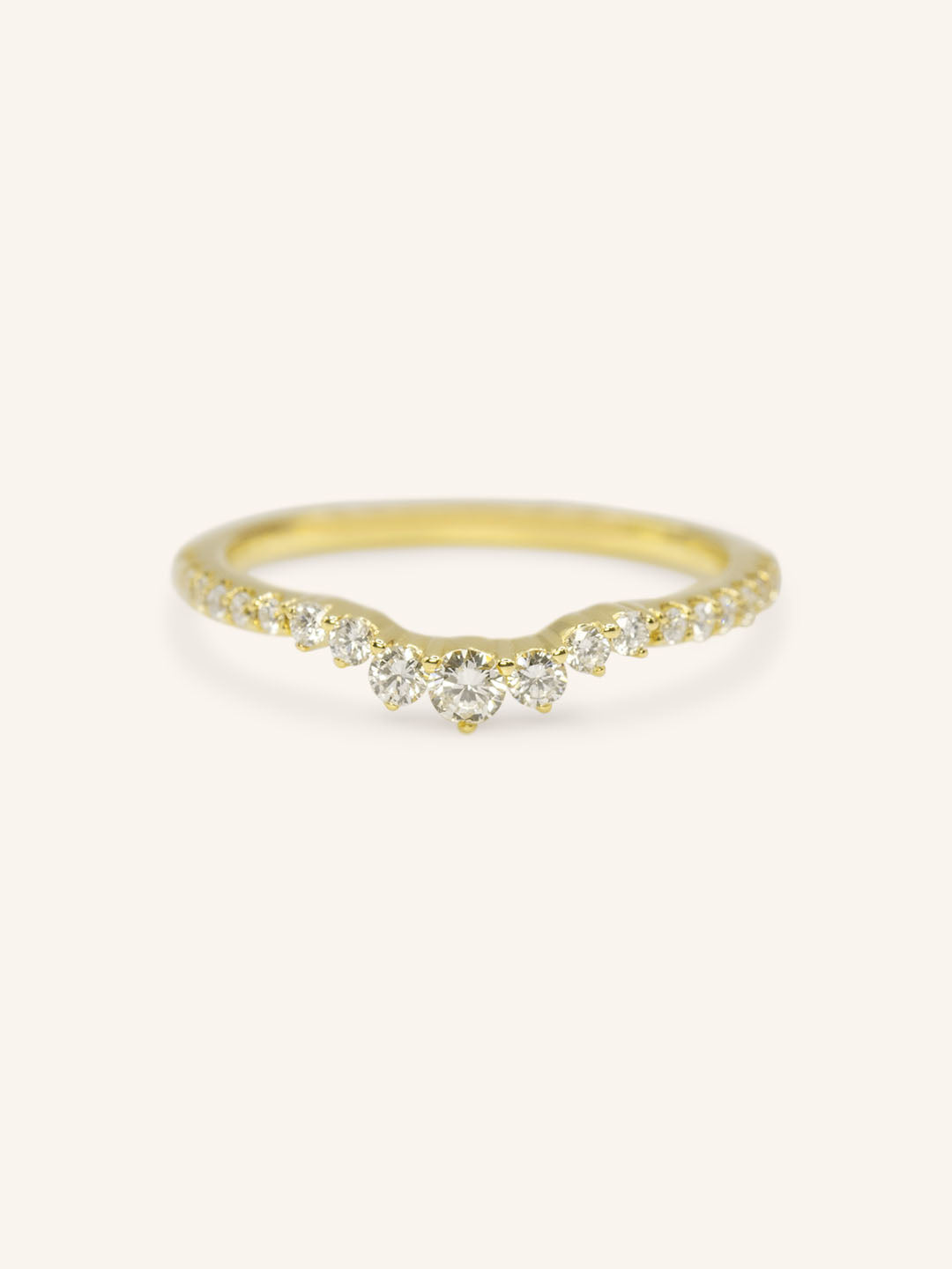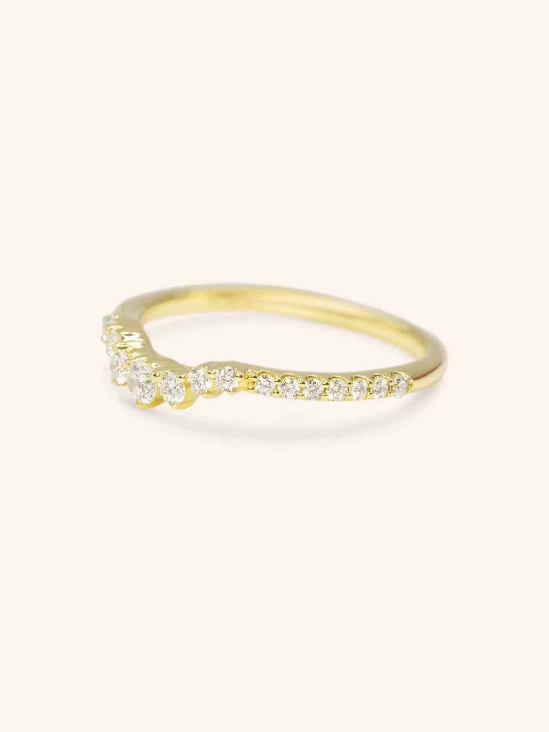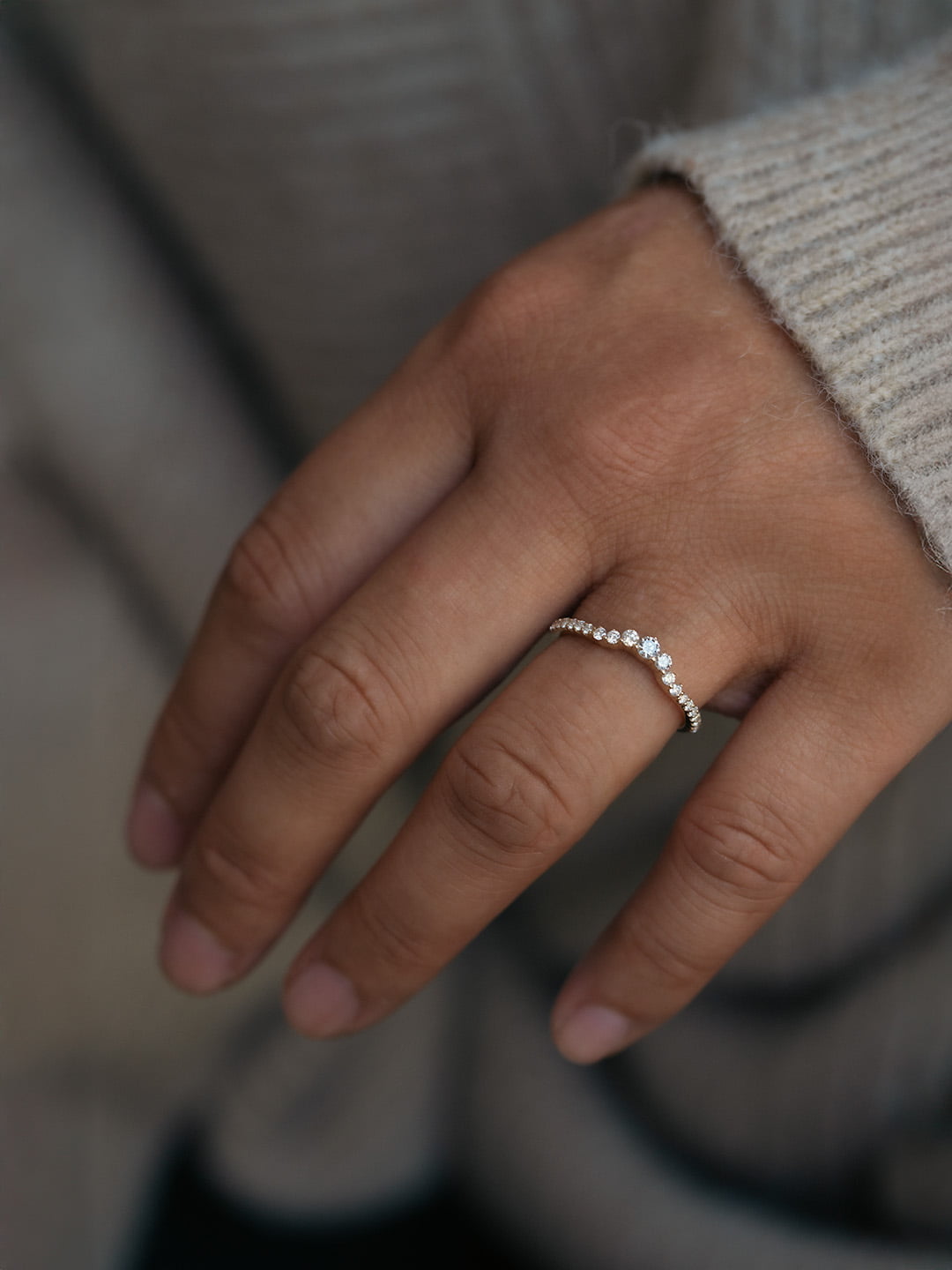 The Whitney Curved Diamond Wedding Band features a subtle curve that beautifully contours to the shape of your engagement ring. Crafted from 14k gold, this elegant band showcases sparkling diamonds, adding a touch of sophistication to its understated design. Perfect for stacking or wearing alone, the Whitney band is a timeless piece that symbolizes the unique bond of your love with grace and elegance.