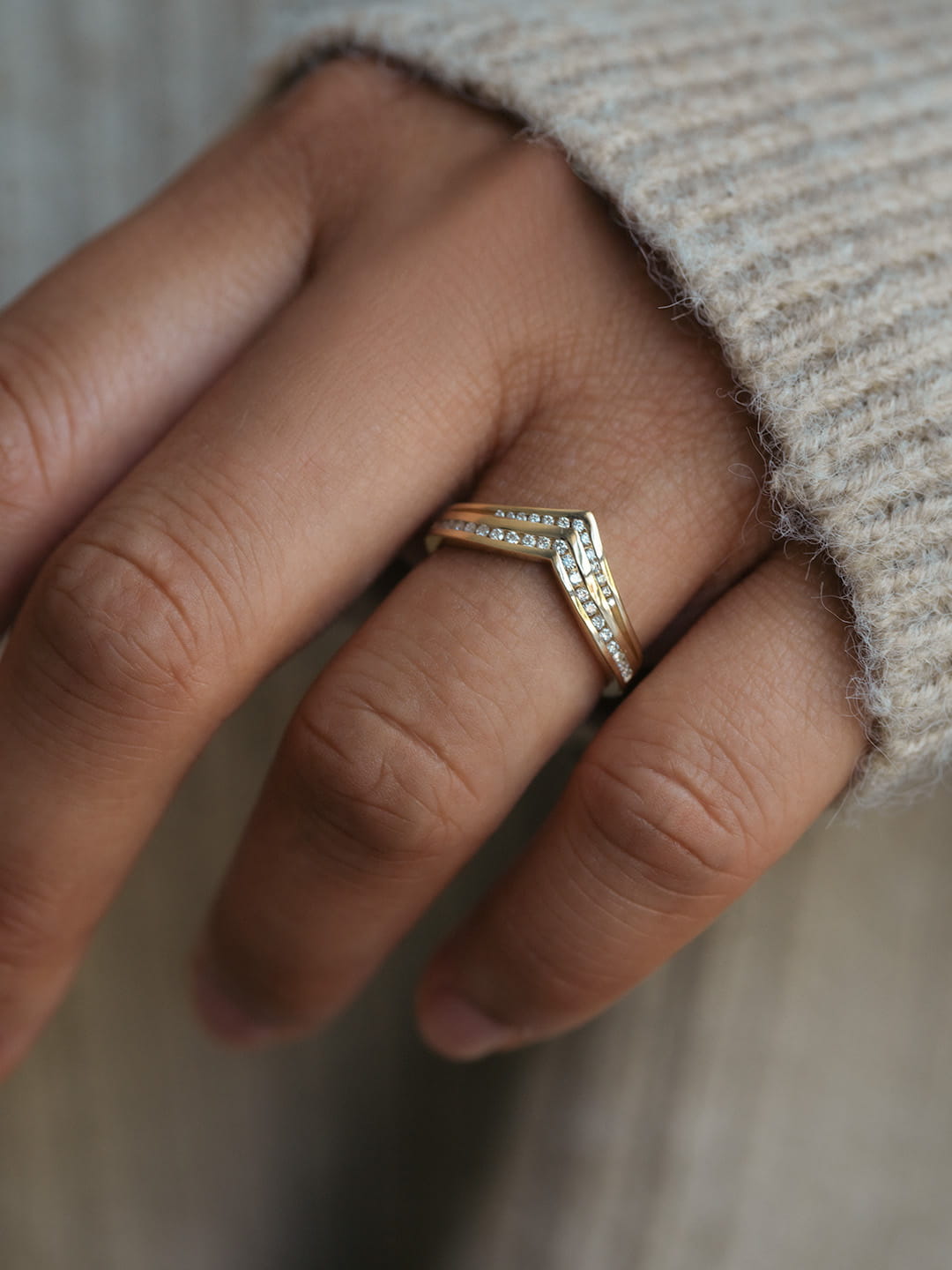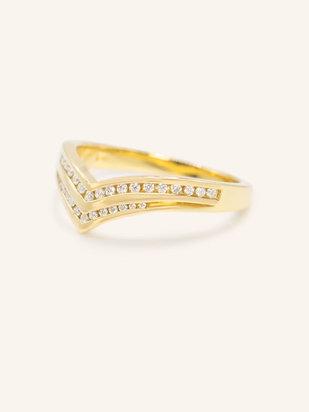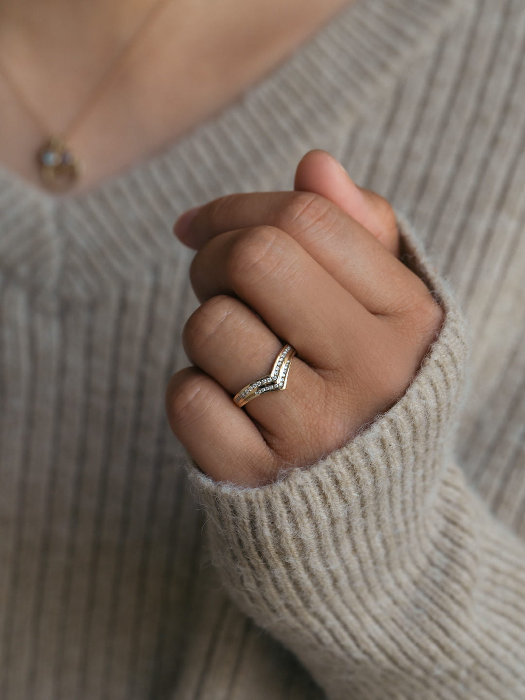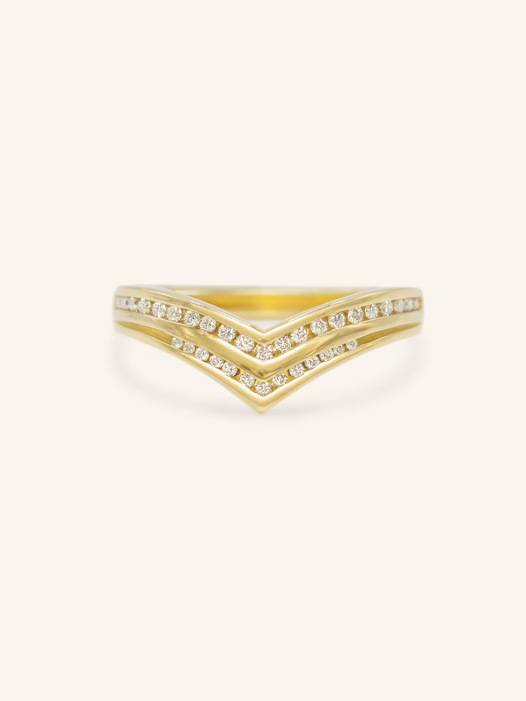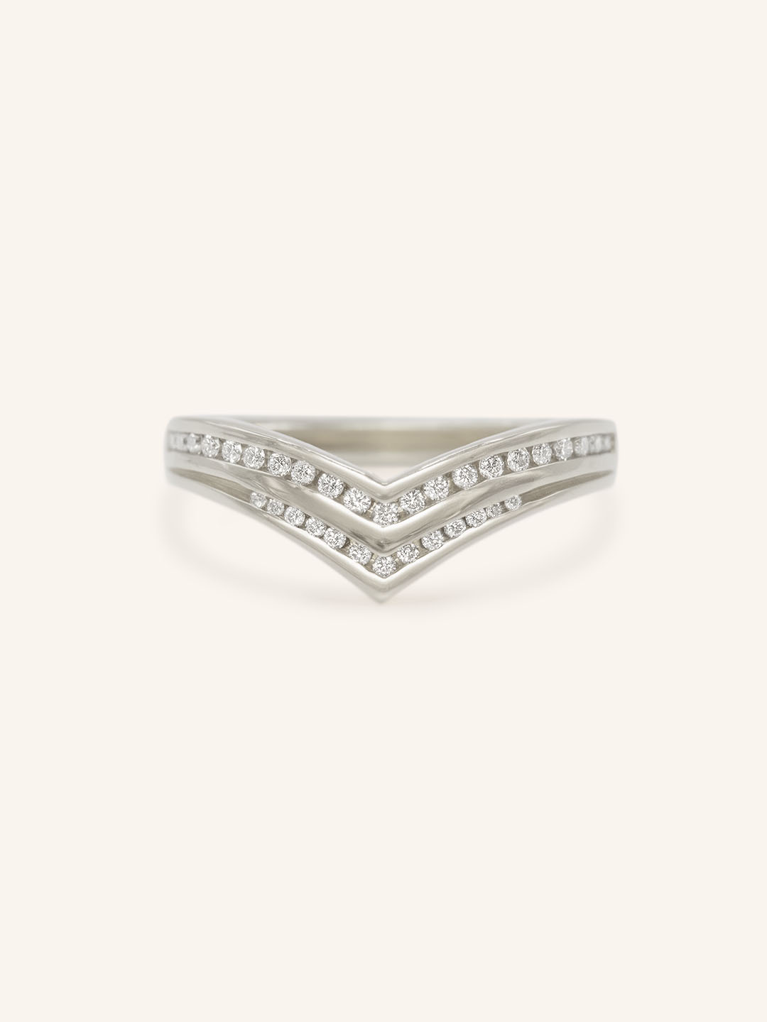 The Zamora Diamond Double Row Curved Anniversary Band features two dazzling rows of diamonds set along a V-shaped curve in 14k gold. This striking design adds a modern twist to a classic anniversary band, creating a perfect complement to your engagement ring or a stunning standalone piece. Ideal for celebrating a special milestone, the Zamora band offers both elegance and brilliance with its distinctive V-shaped silhouette.