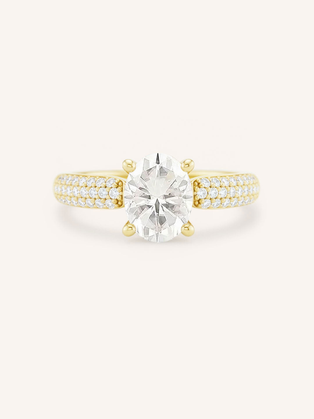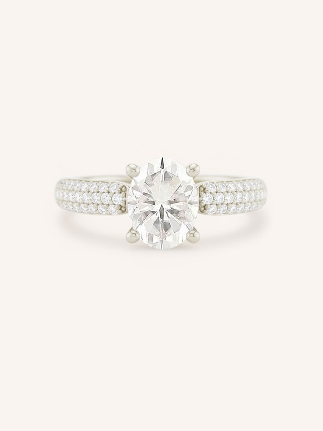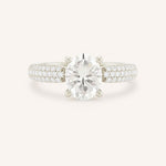 This exquisite design showcases a dazzling solitaire center stone, capturing timeless elegance and brilliance. The shank is adorned with three rows of pavé-set diamonds, adding a sparkling dimension that complements the center gem. Perfect for those who love classic sophistication with a modern twist, this ring is designed to shine from every angle.