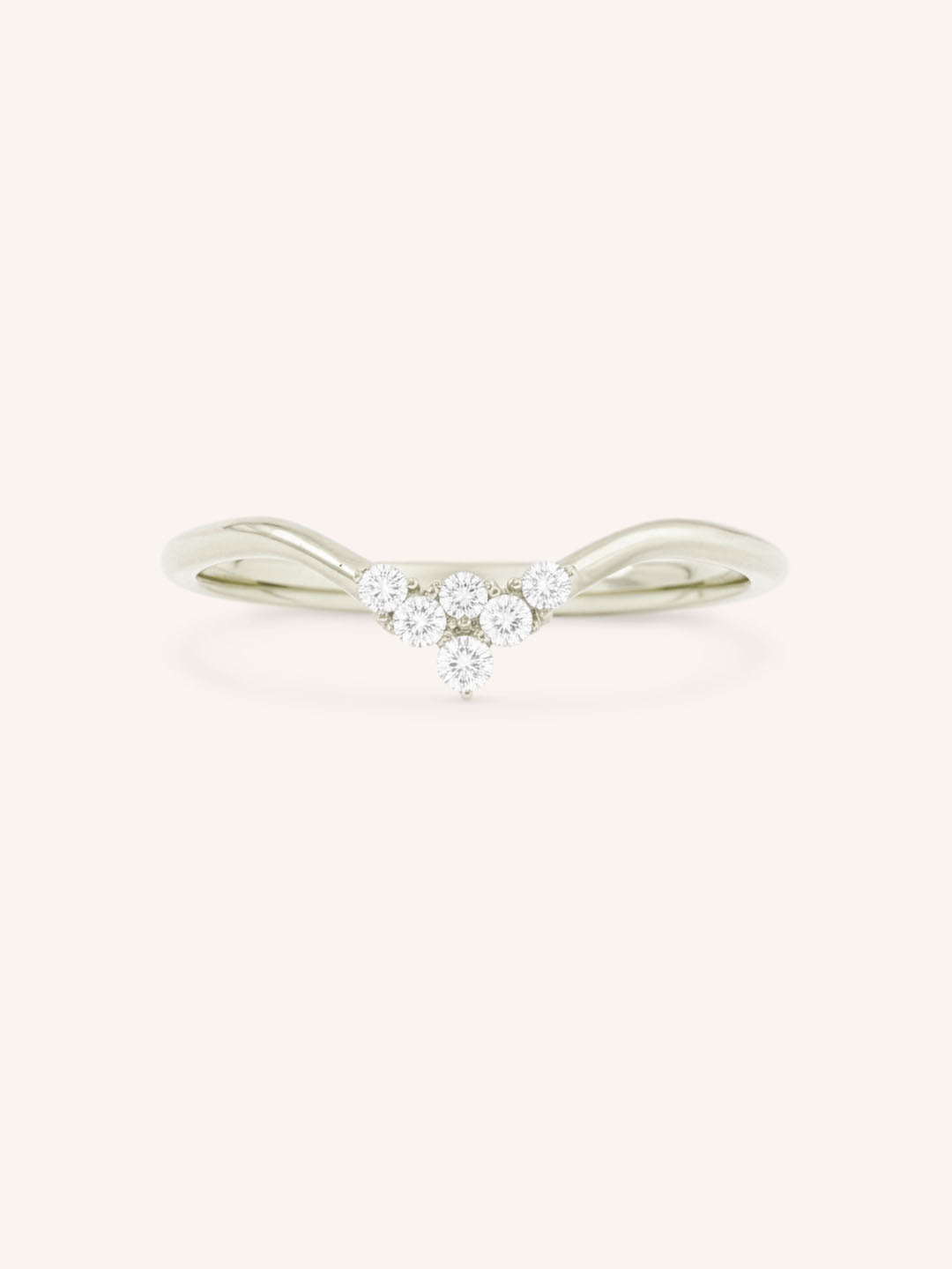 The LB Cluster V Diamond Wedding Band brings a modern twist to a classic silhouette. Designed in a gentle V shape, this band features a shimmering cluster of round diamonds at the center, creating a brilliant focal point. Perfect for pairing with a solitaire or worn alone as a statement, this piece adds sparkle and dimension with a contemporary edge.