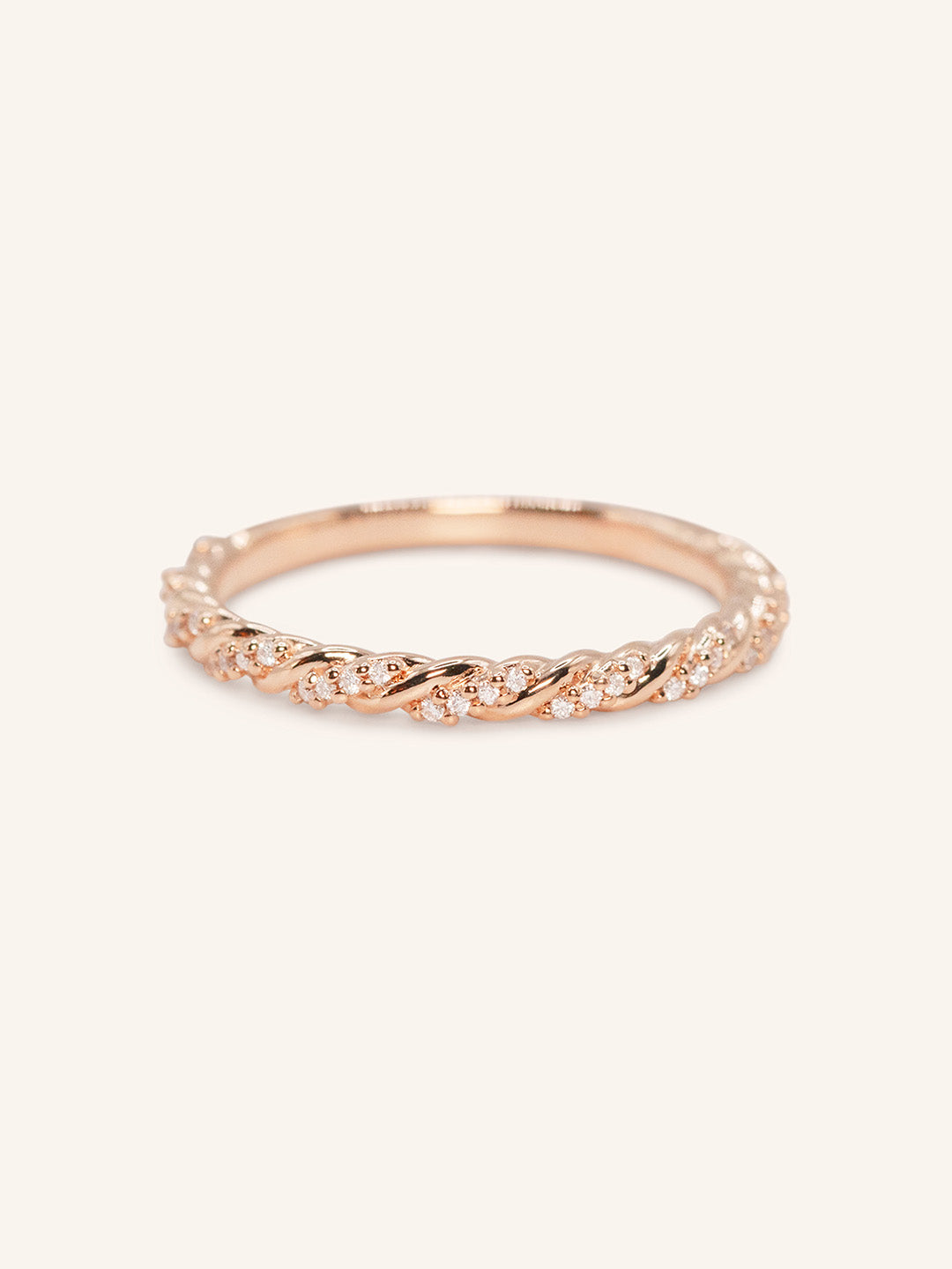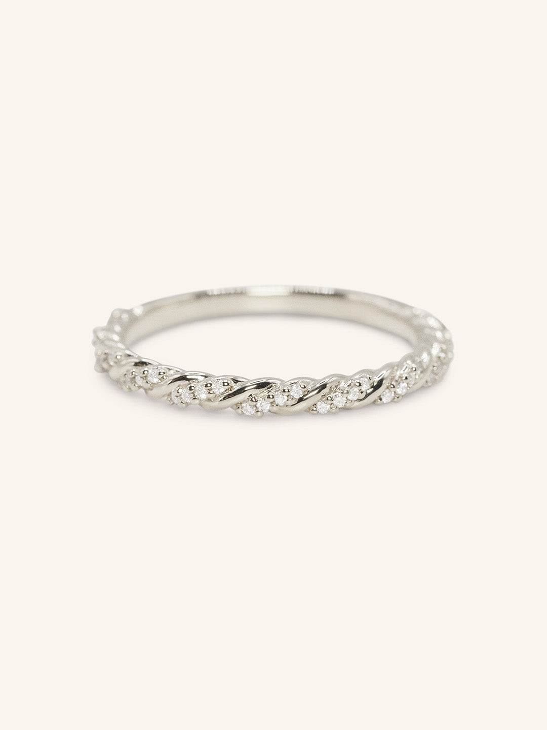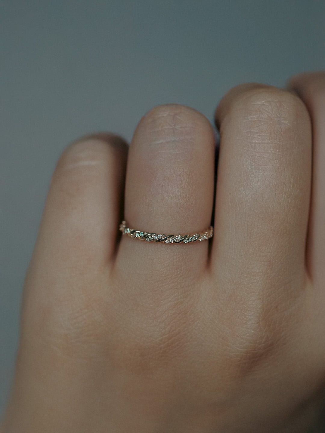 The Woven Diamond Wedding Band showcases an elegant, braided design, symbolizing the beautiful intertwining of two lives. Crafted from 14k gold and adorned with pavé-set diamonds, this band offers a touch of sparkle and sophistication. Its intricate woven pattern makes it a perfect companion to the pavé twisted anniversary band, creating a timeless and harmonious set for your most cherished moments.