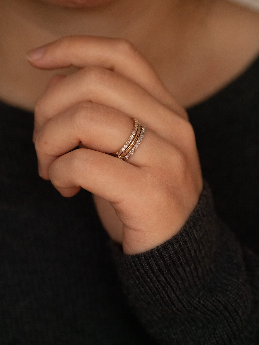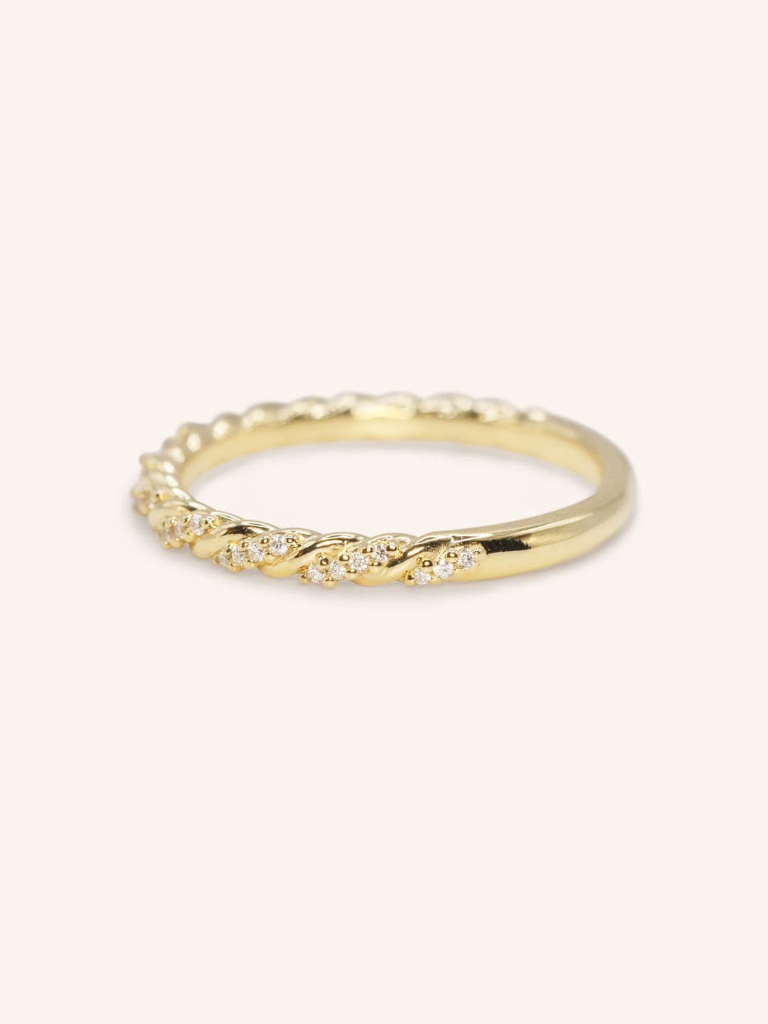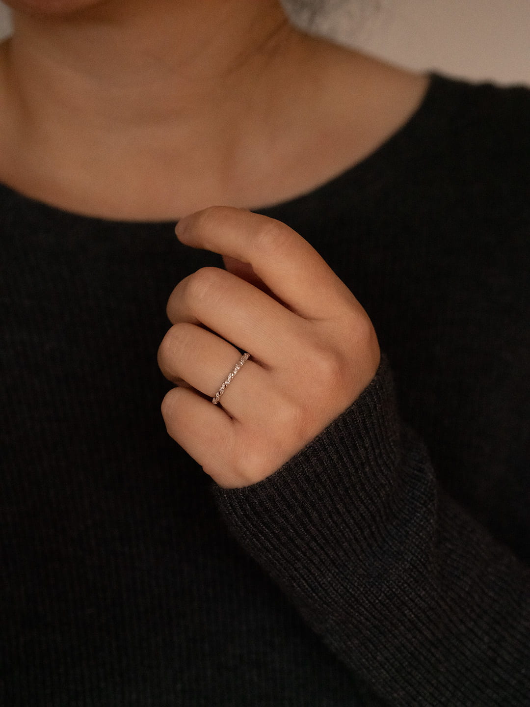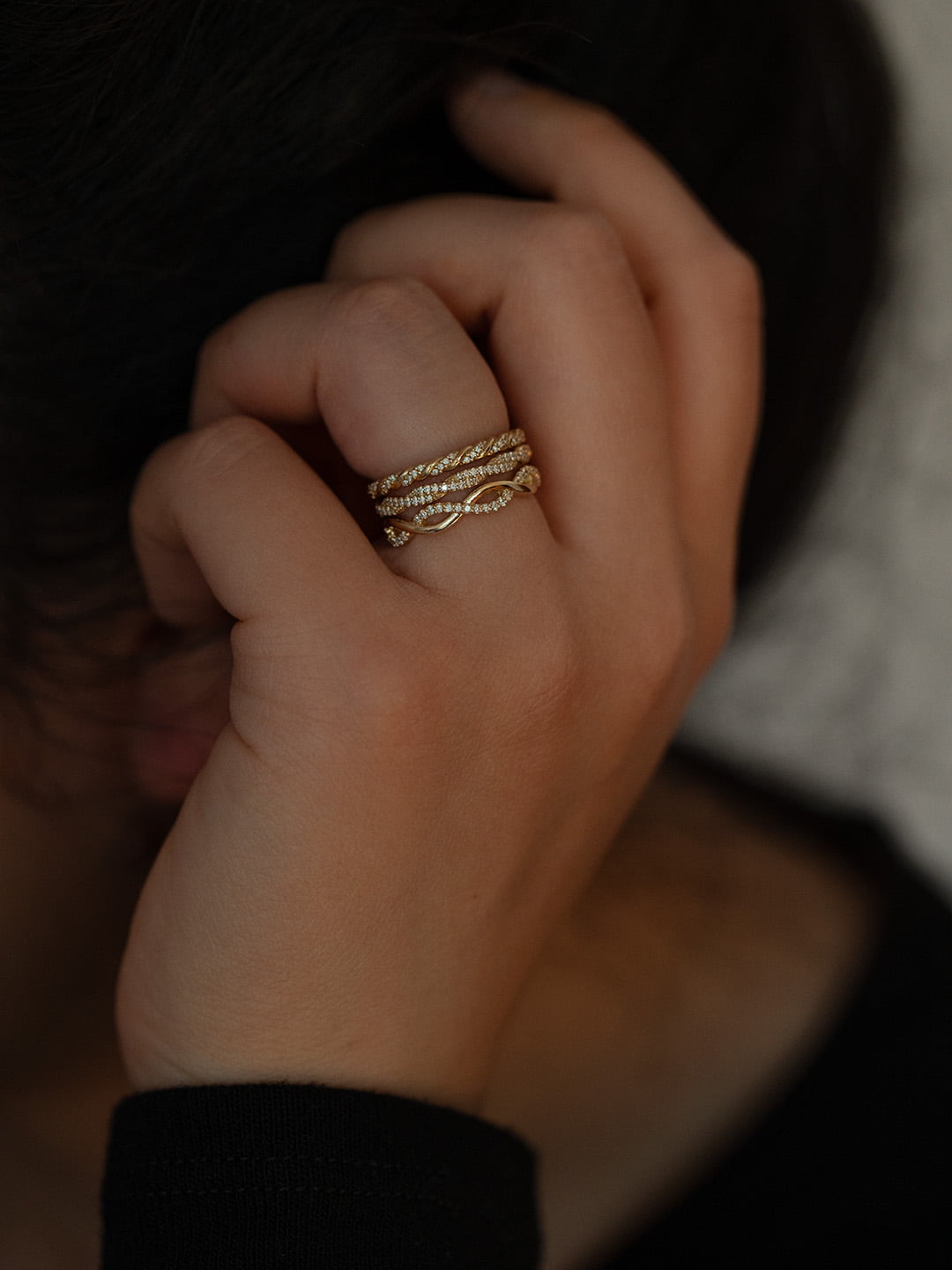 The Woven Diamond Wedding Band showcases an elegant, braided design, symbolizing the beautiful intertwining of two lives. Crafted from 14k gold and adorned with pavé-set diamonds, this band offers a touch of sparkle and sophistication. Its intricate woven pattern makes it a perfect companion to the pavé twisted anniversary band, creating a timeless and harmonious set for your most cherished moments.