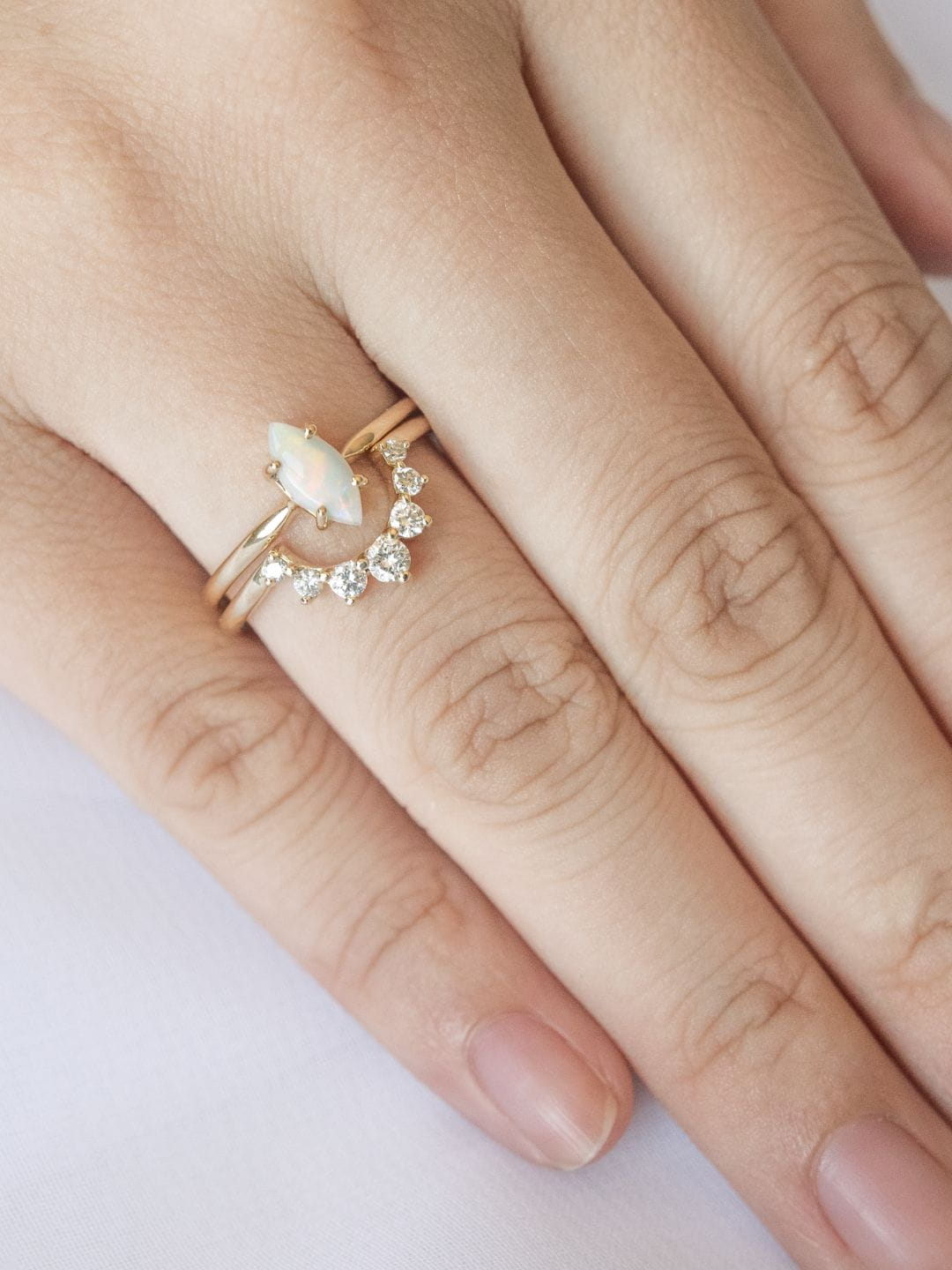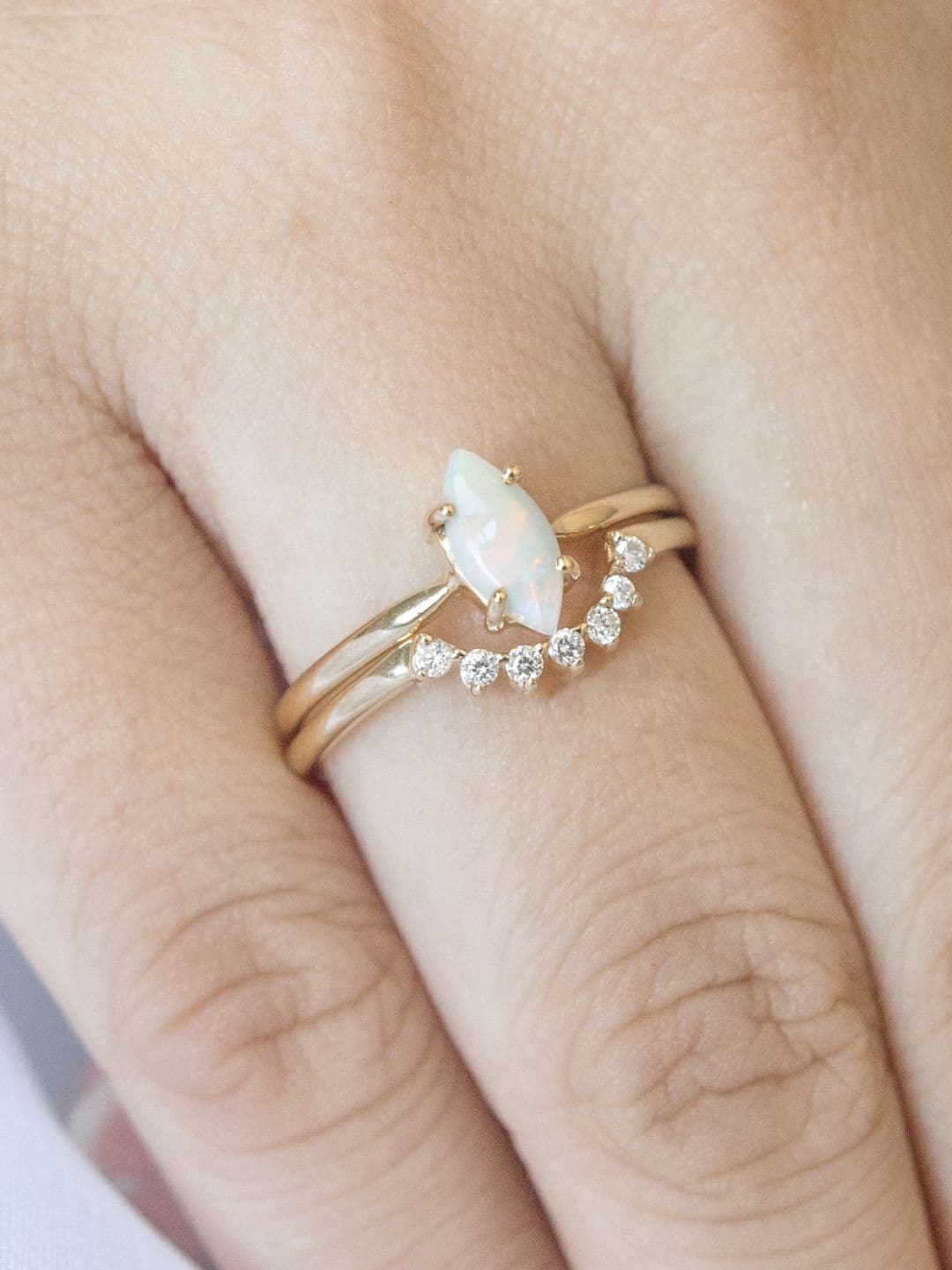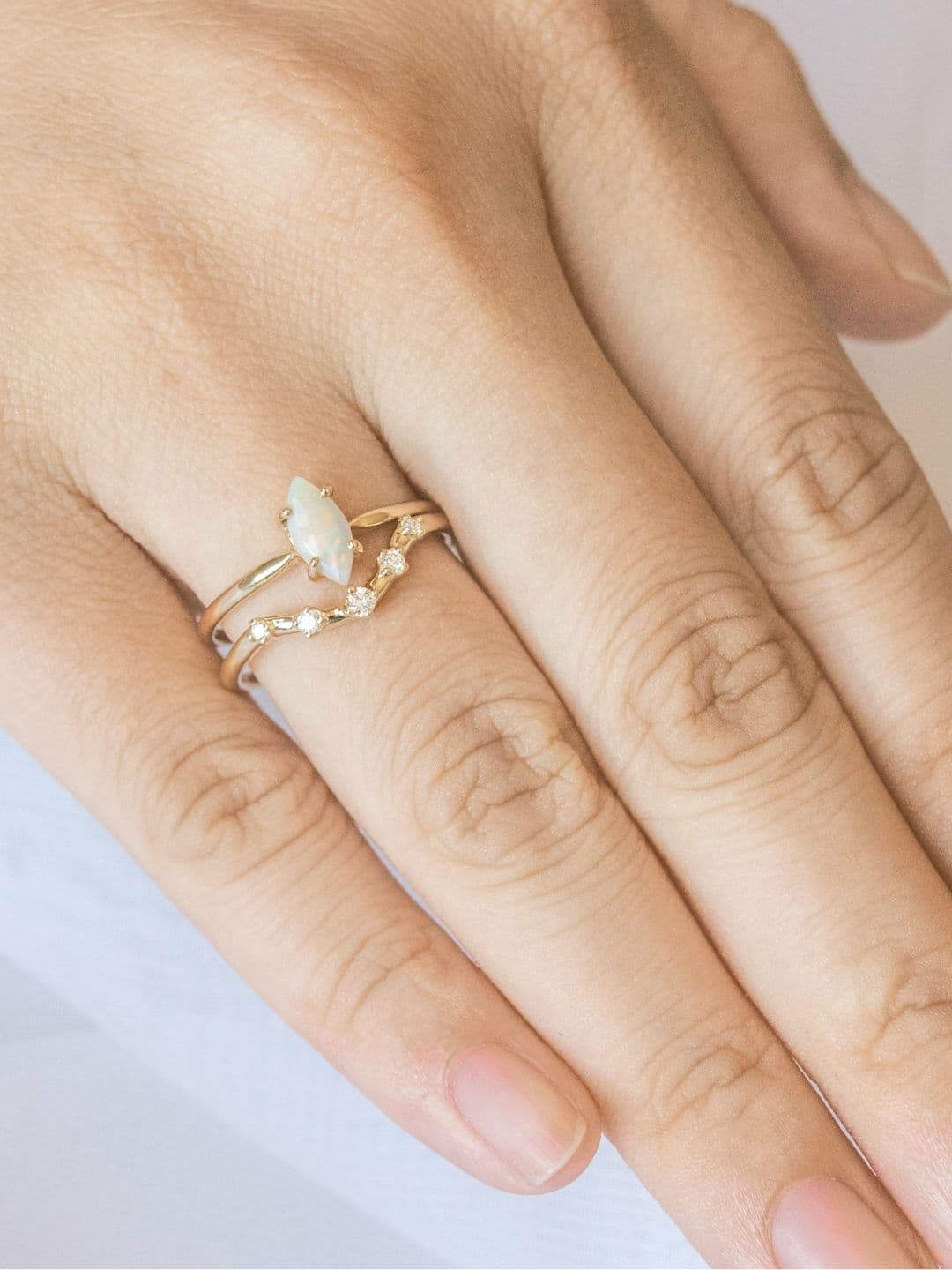 I spent a lot of time browsing around for the ring that was in my mind’s eye for my wedding band. I found this opal ring at a gilded leaf and it seemed perfect! I got it in the mail yesterday and it’s everything I could have wanted and more! It’s light-weight and comfortable, beautifully crafted with quality materials and I love the values a gilded leaf stand for. I put it on my finger and I don’t plan on ever taking it off. I am so pleased!