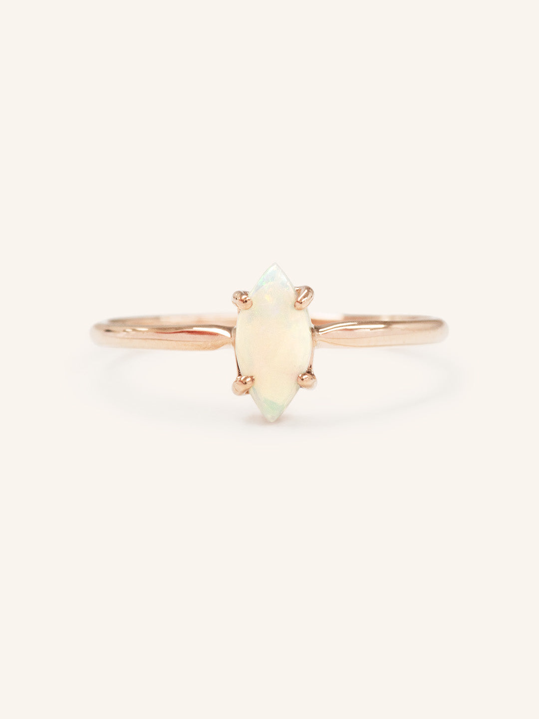 Our Buttonsage Solitaire Ring is set with a delicate, illuminating and magical opal with a beautiful array of colors from pinks to greens, this ring will attract the bees and butterflies trailing behind in a bewitching display of colors.