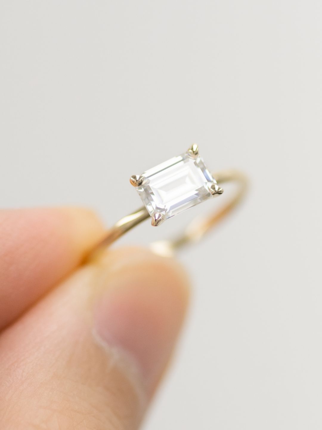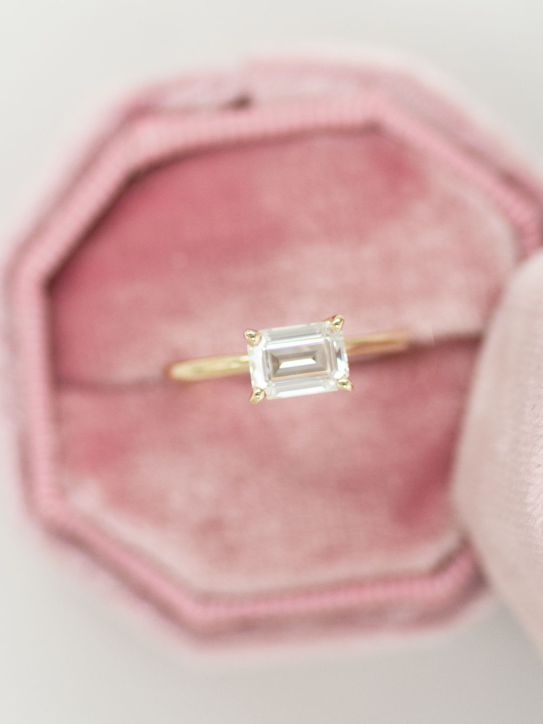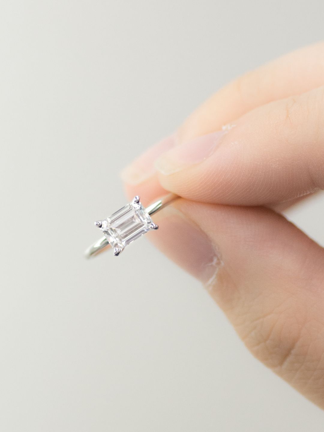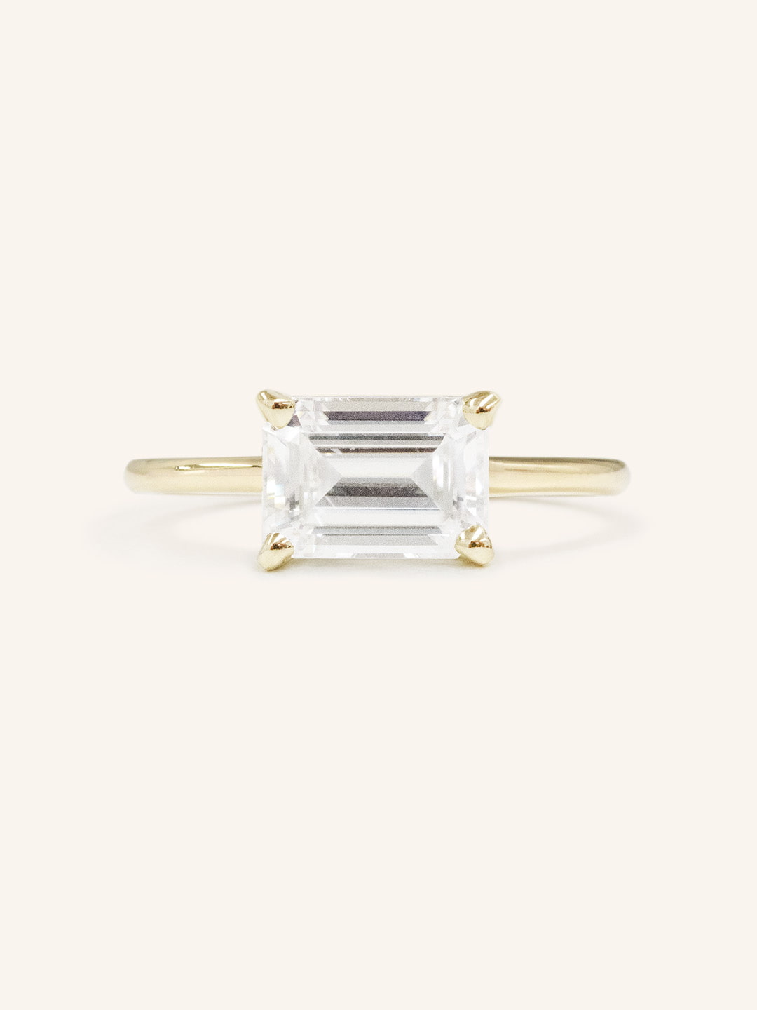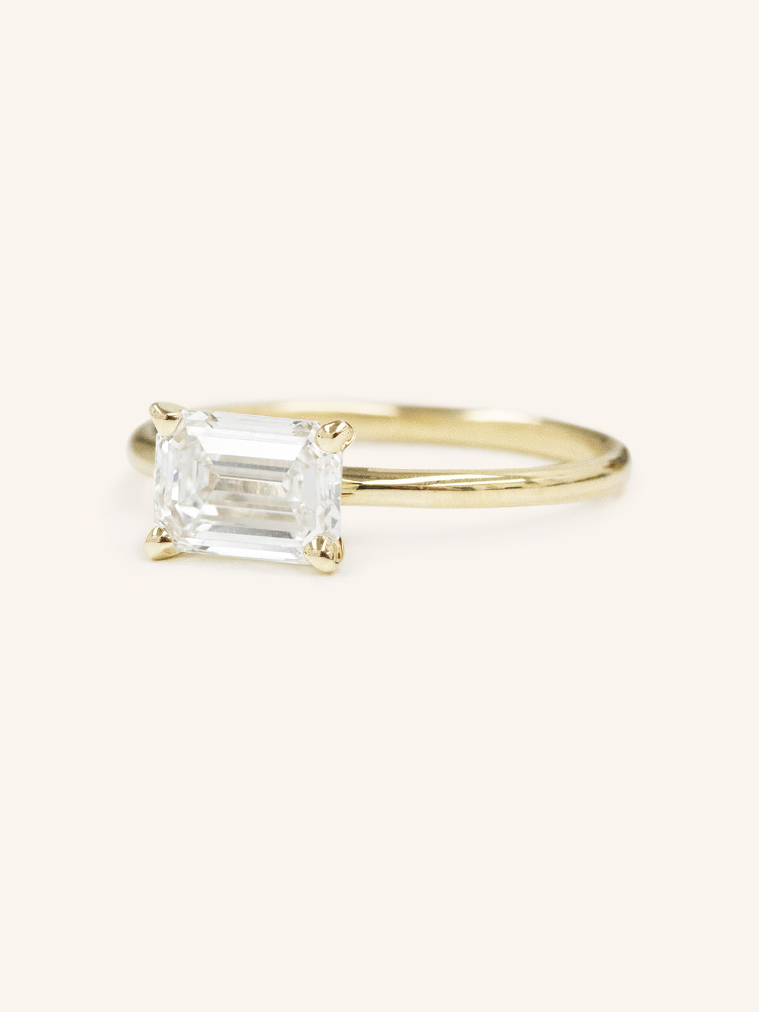 Elevate your proposal to a new level of sophistication with this timeless East West emerald step cut Diamond solitaire engagement ring. Delivering classic elegance with a modern edge, its minimal design will mesmerize you with its superior quality and lustrous finish, making it a beautiful choice that will always remain in style.