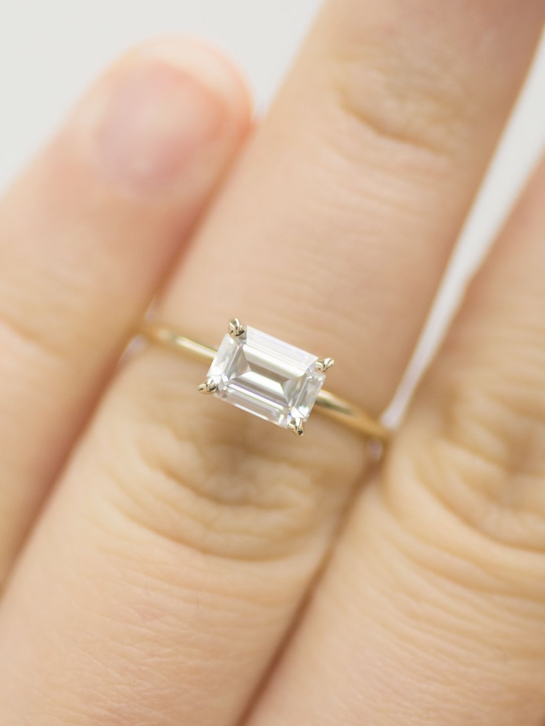 East West Emerald Step Cut Diamond Solitaire Engagement Ring