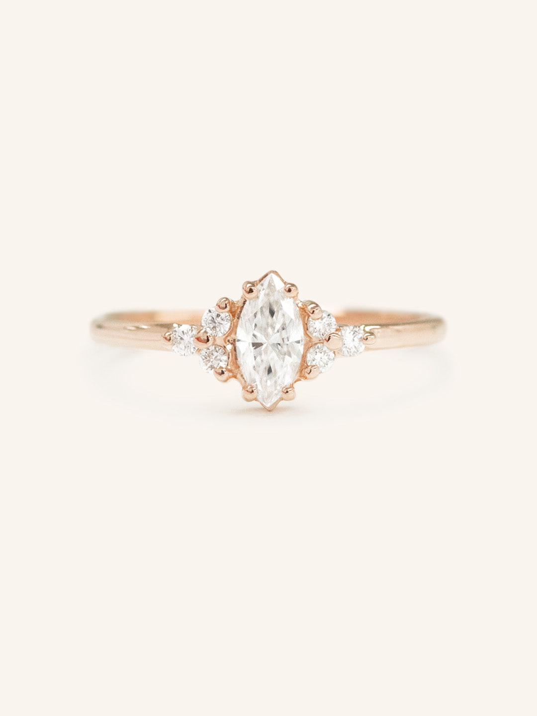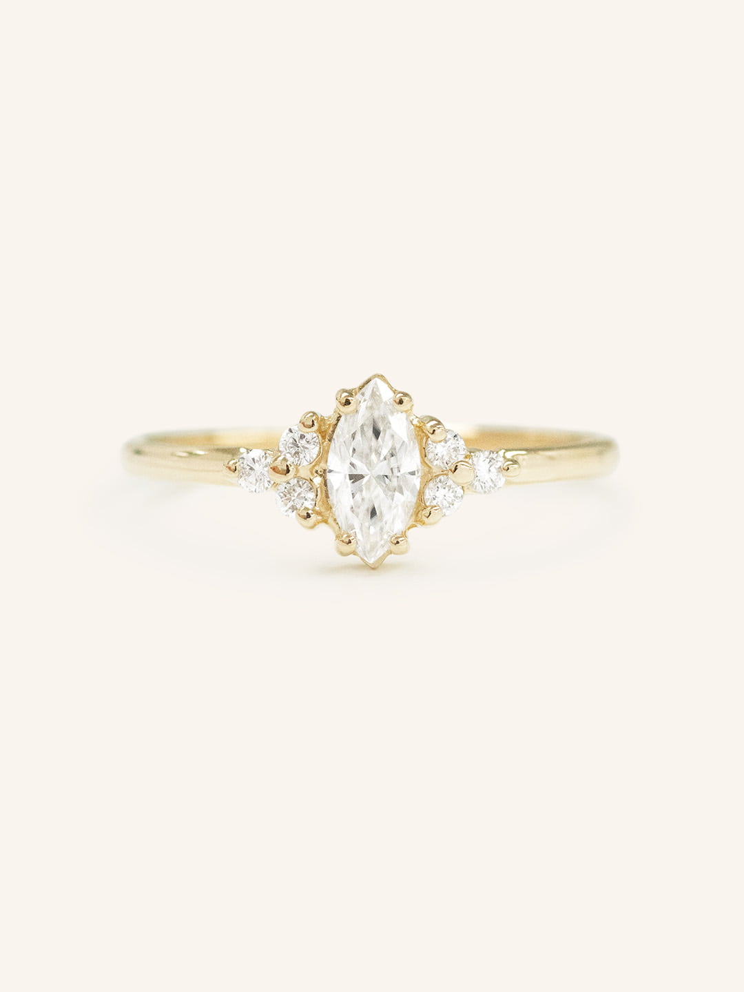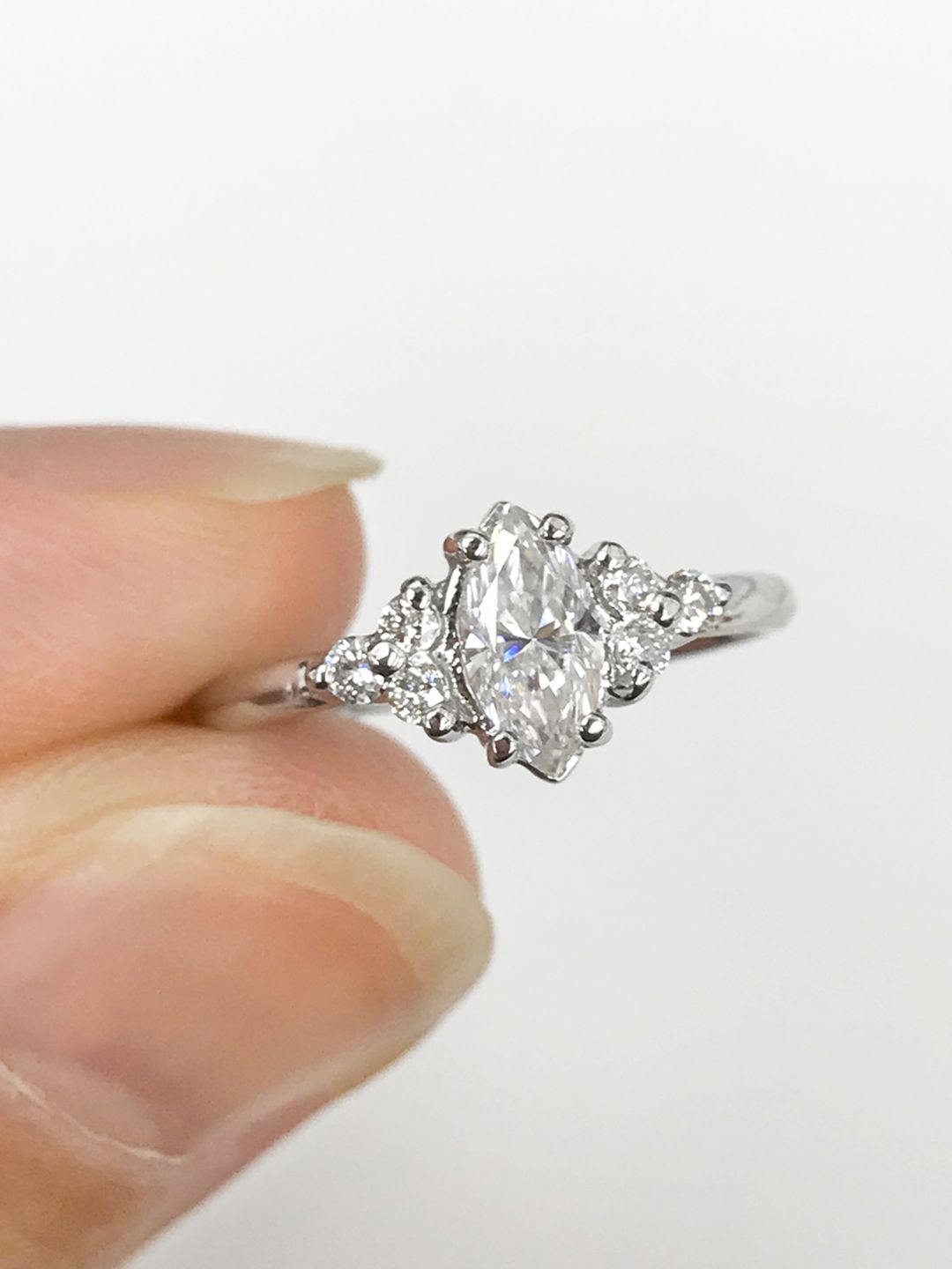 Celebrate your love with our enchanting vintage-style engagement ring, showcasing a captivating marquise moissanite center stone nestled between a cluster of dazzling diamonds. The marquise cut of the moissanite creates a stunning focal point, complemented by the brilliance of the surrounding diamonds. Let this exquisite engagement ring be a symbol of your everlasting commitment, as you embark on your journey of eternal love.