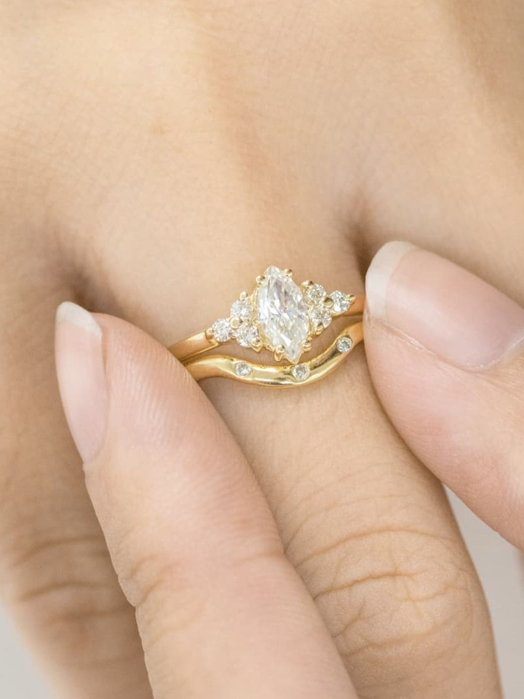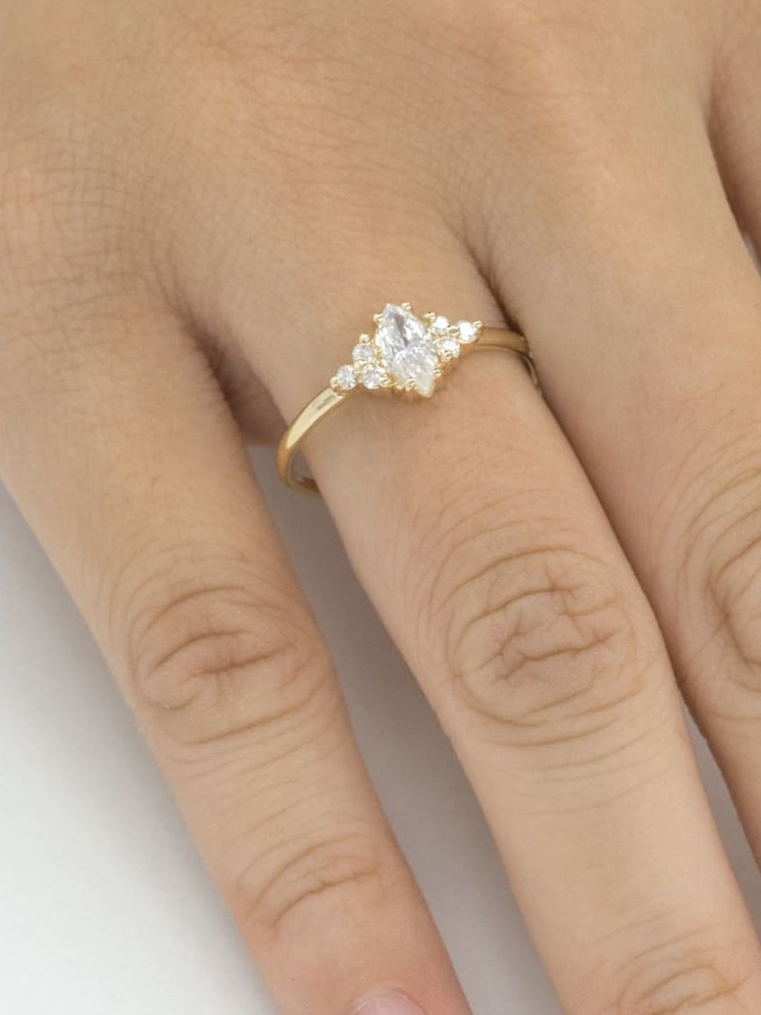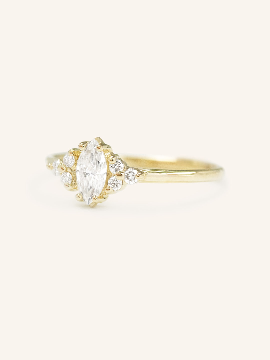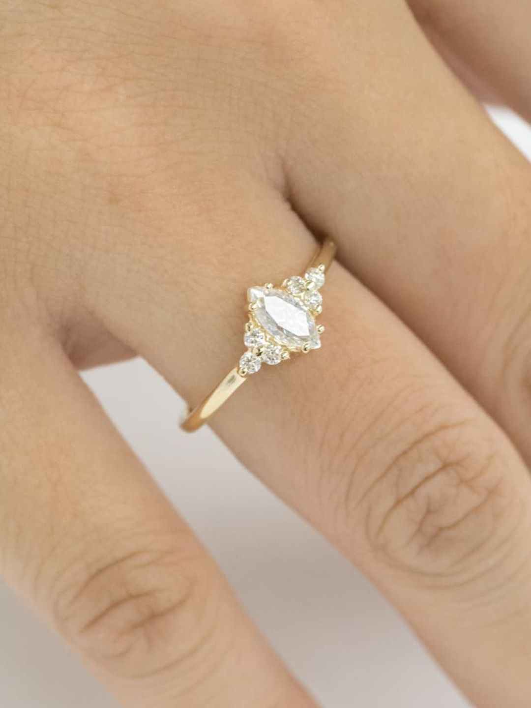 Celebrate your love with our enchanting vintage-style engagement ring, showcasing a captivating marquise moissanite center stone nestled between a cluster of dazzling diamonds. The marquise cut of the moissanite creates a stunning focal point, complemented by the brilliance of the surrounding diamonds. Let this exquisite engagement ring be a symbol of your everlasting commitment, as you embark on your journey of eternal love.