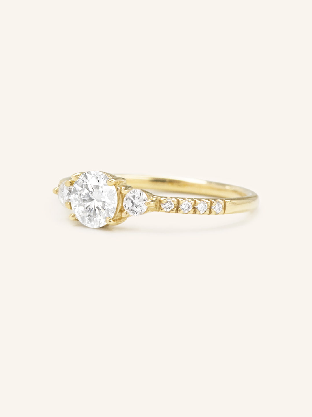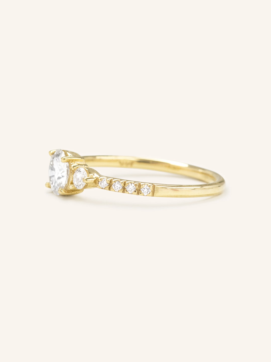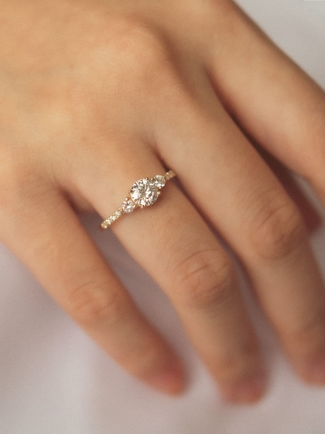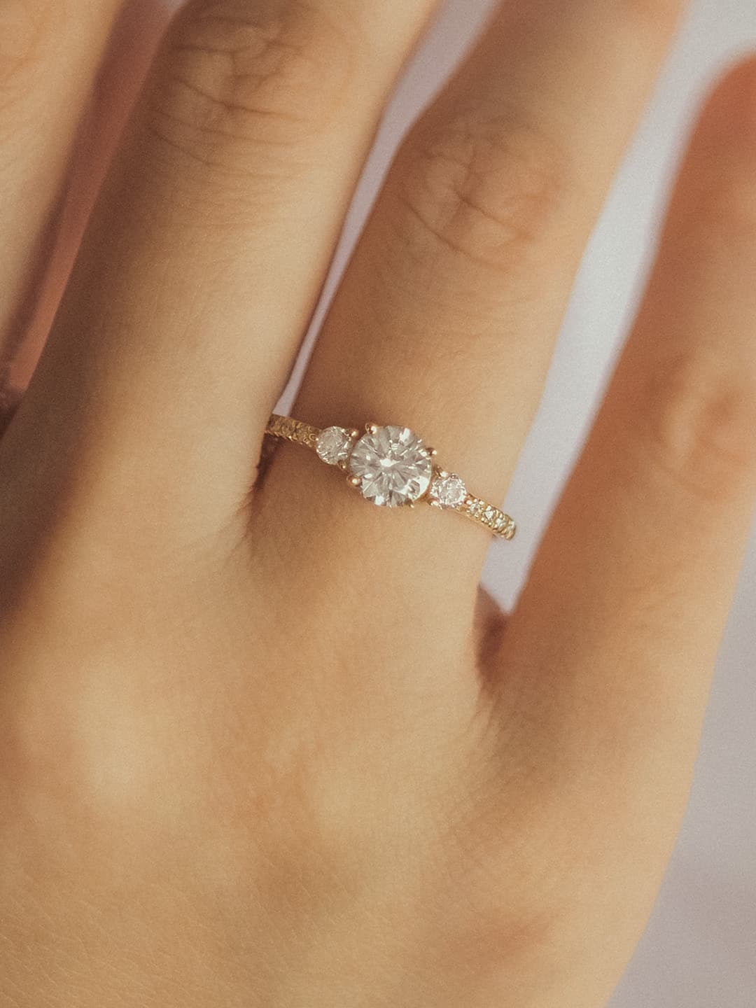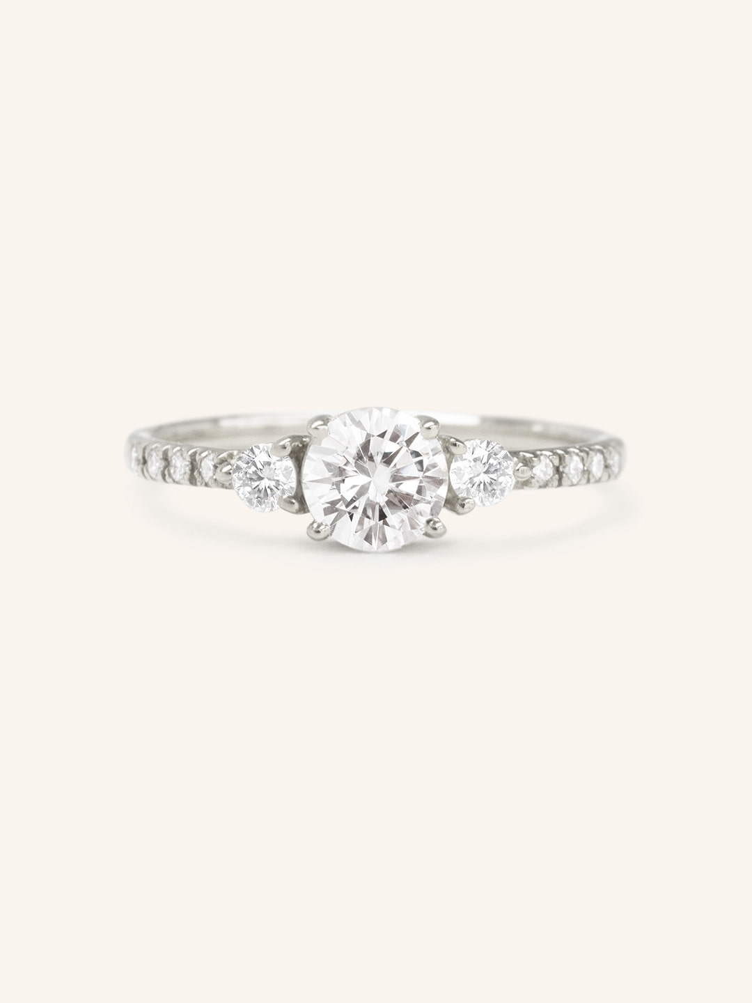 Our three stone engagement ring is a perfect combination of modern and classic design. The center stone, a stunning round-cut moissanite, is flanked by two smaller moissanites, while the side stones are set with dazzling diamonds. This exquisite ring is available in your choice of precious metal and is sure to be a cherished symbol of your love for years to come.