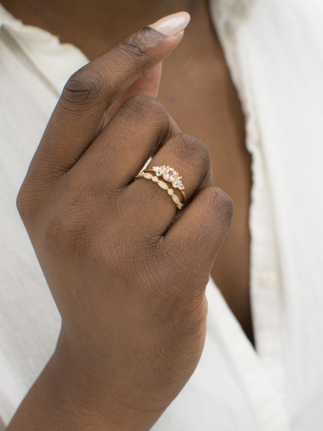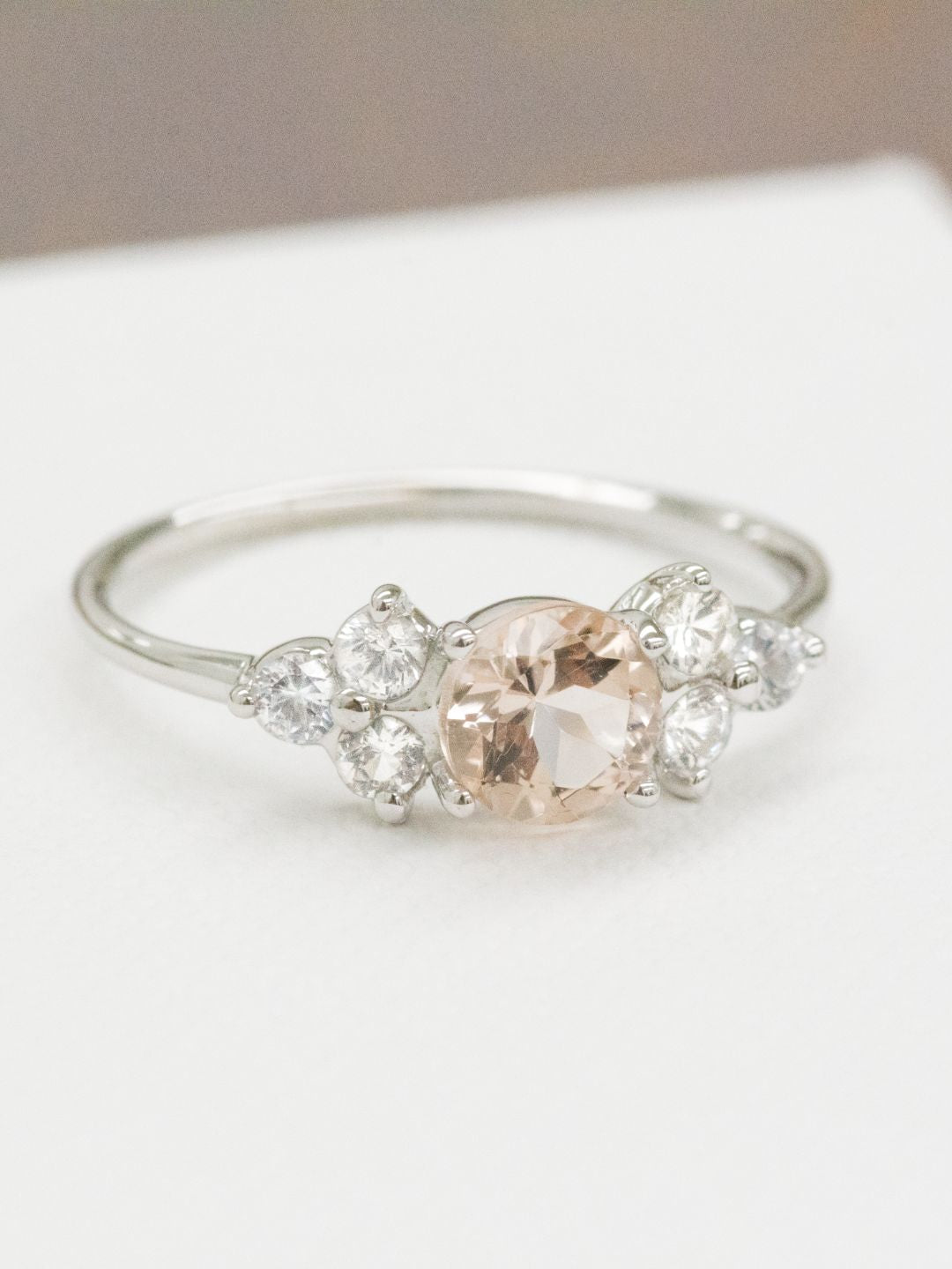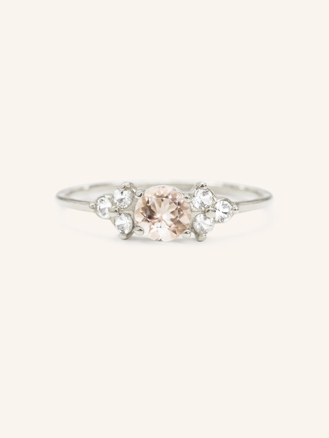 A swoon worthy essential piece. This stunning pale blush pink morganite features white sapphire accents made to complement your blushing bride. Present this as a token of your affection and love to the person you want to spend your life with.