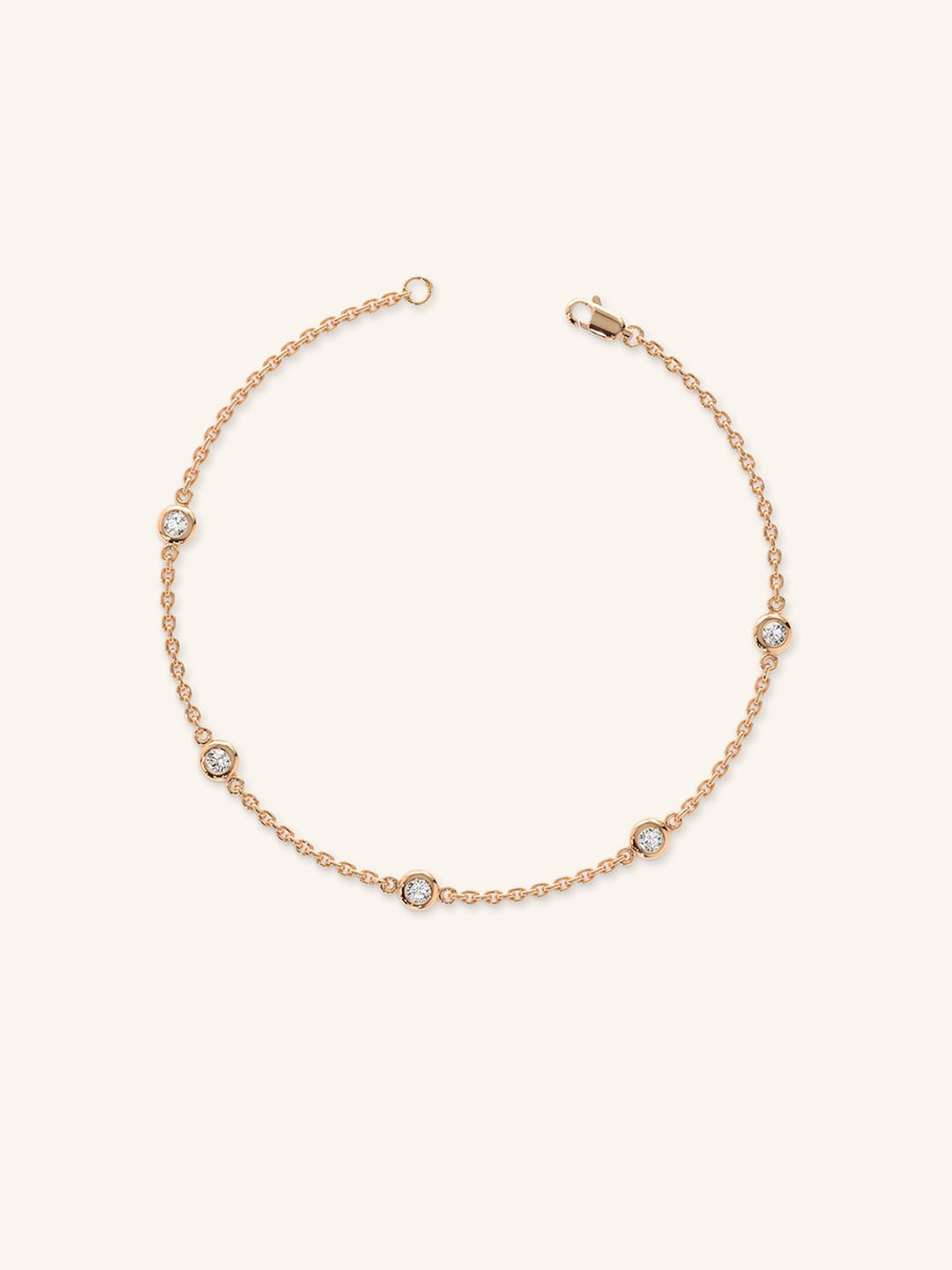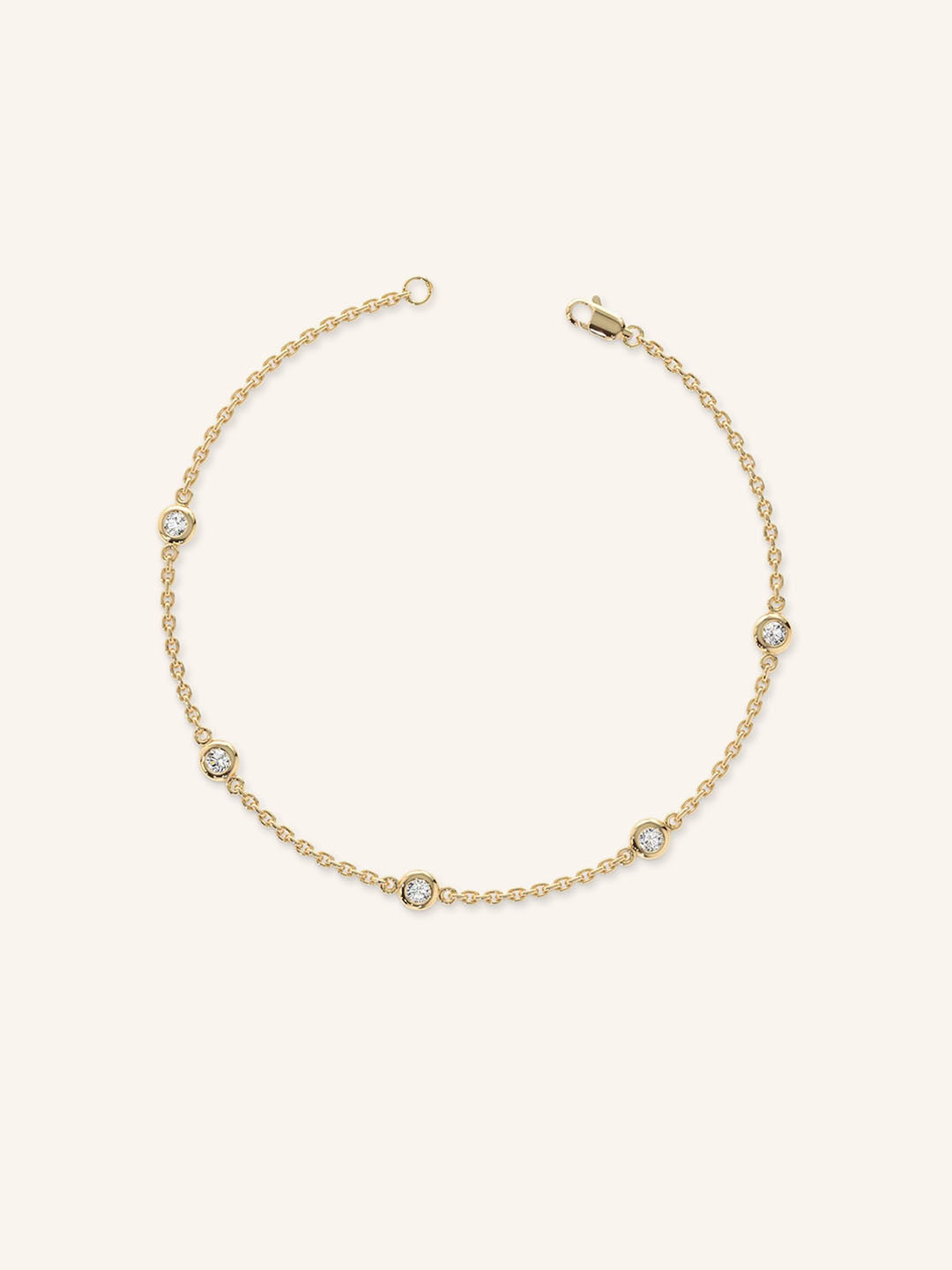A beautifully crafted bracelet with five bezels across a solid gold chain, wherever way it turns it will sparkle. This bracelet goes nicely with any outfit, from day to black-tie gala.