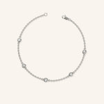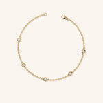 Solid 14k gold five (2.00, 2.40, or 2.70) mm bezels spaced equally on a 1.15 mm 7" length cable chain (available in yellow, white, or rose gold).