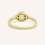 The Abigail Ring features a richly colored gemstone framed by a trio of petite diamonds on each side. Delicate yet vibrant, its timeless silhouette makes it perfect for stacking or wearing solo as a subtle statement.