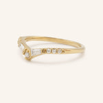 The Miluse Curved Diamond Wedding Band is an elegant and distinctive piece, designed to complement your engagement ring beautifully. Featuring a gentle curve, this band is set with two tapered baguettes and shimmering round diamonds, creating a graceful balance of shapes and sparkle. Its thoughtful design makes it a timeless choice for marking your special moments, whether as a wedding band or anniversary ring.