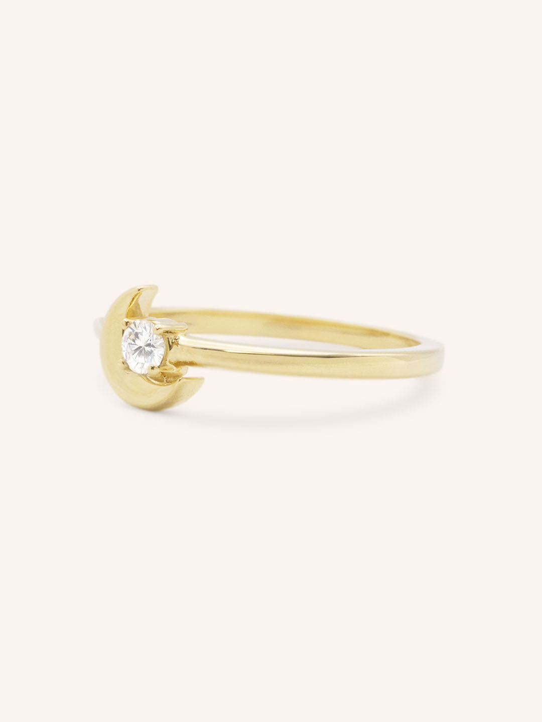 Celestial charm meets everyday elegance in this whimsical ring. Featuring a delicate crescent moon paired with a twinkling star, each set with a diamond, this piece captures the magic of the night sky in a dainty, wearable form.