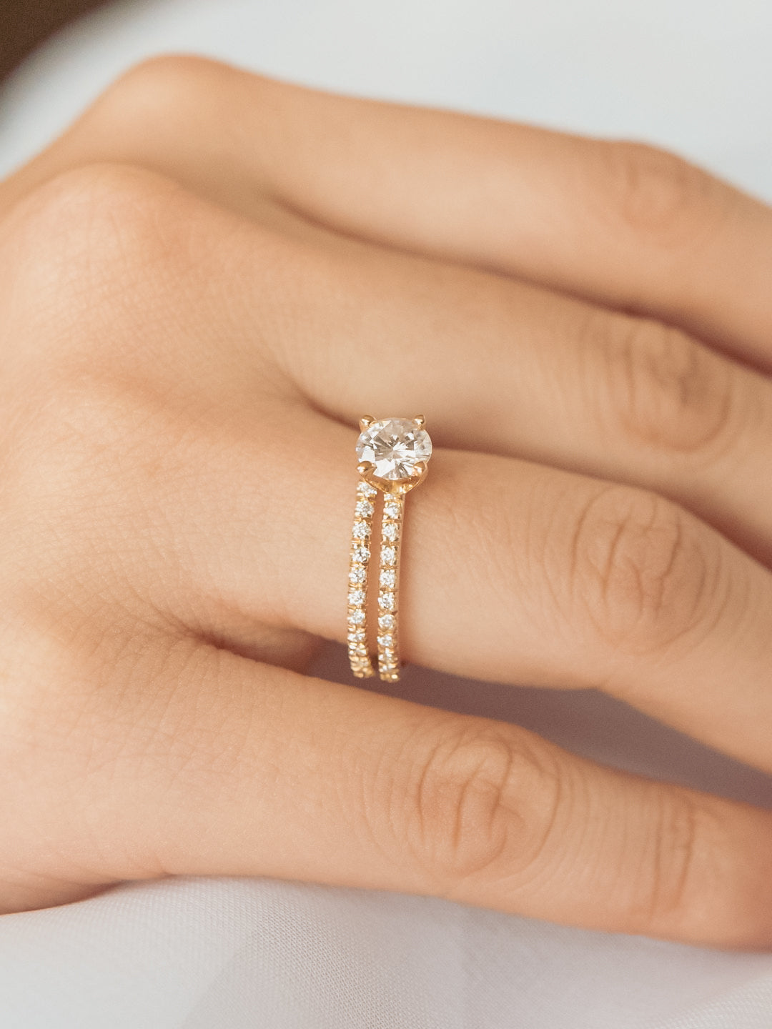 This ring features a Charles & Colvard Forever One Round Brilliant Cut Moissanite with a selection of carat weight from 0.68 ctw to 2.26 ctw. We offer an option of stone color grading from near colorless (GHI) to colorless (DEF).