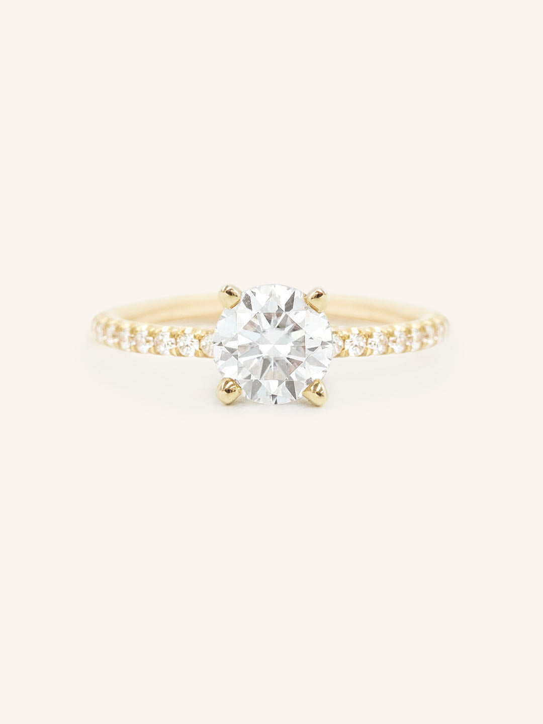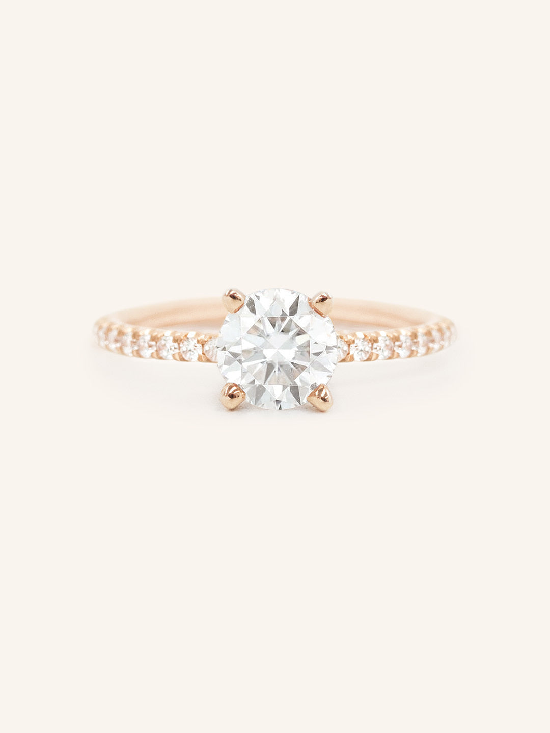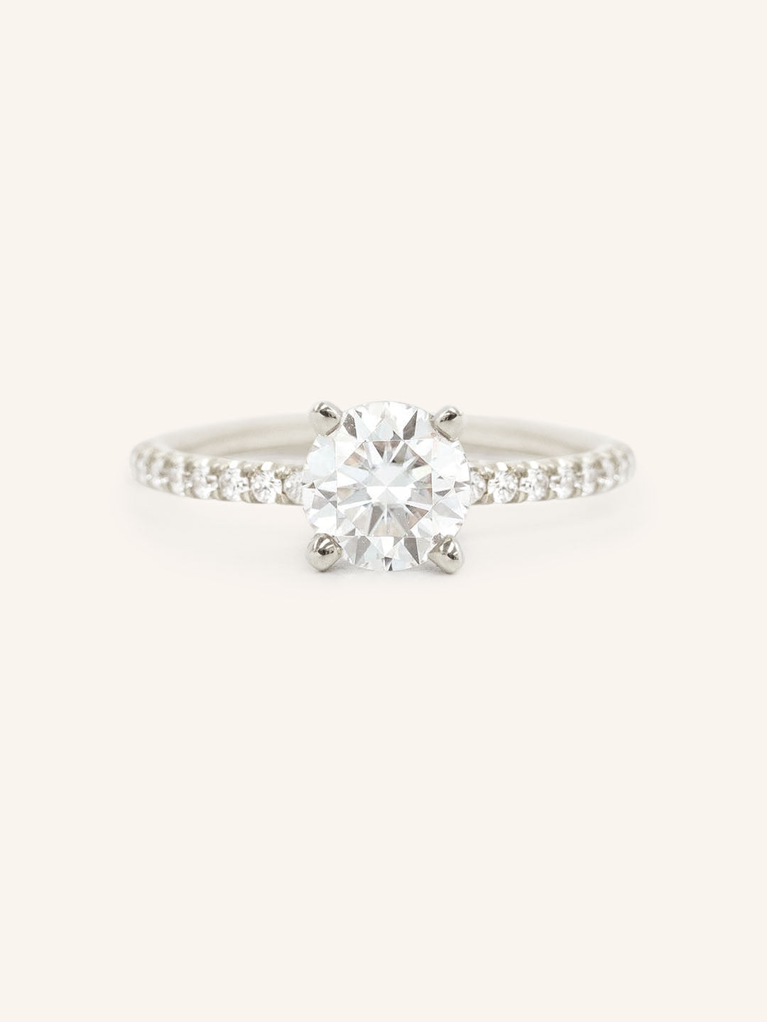 Like the moonlight sky itself, this engagement ring is made for twinkling and shining. The moissanite center stone - considered by some to be even more beautiful than diamonds, combined with a classic 4 prong diamond setting creates a delicate ring so simple and sweet that it's hard to resist.