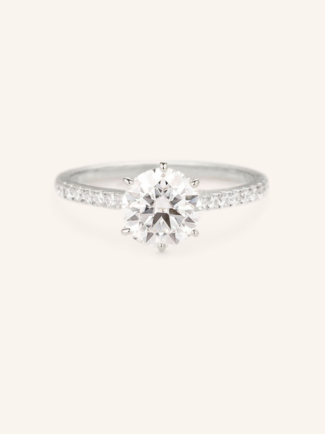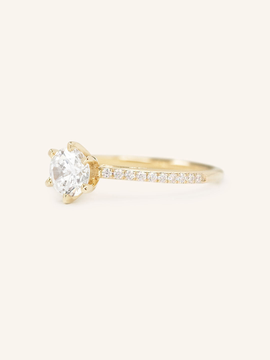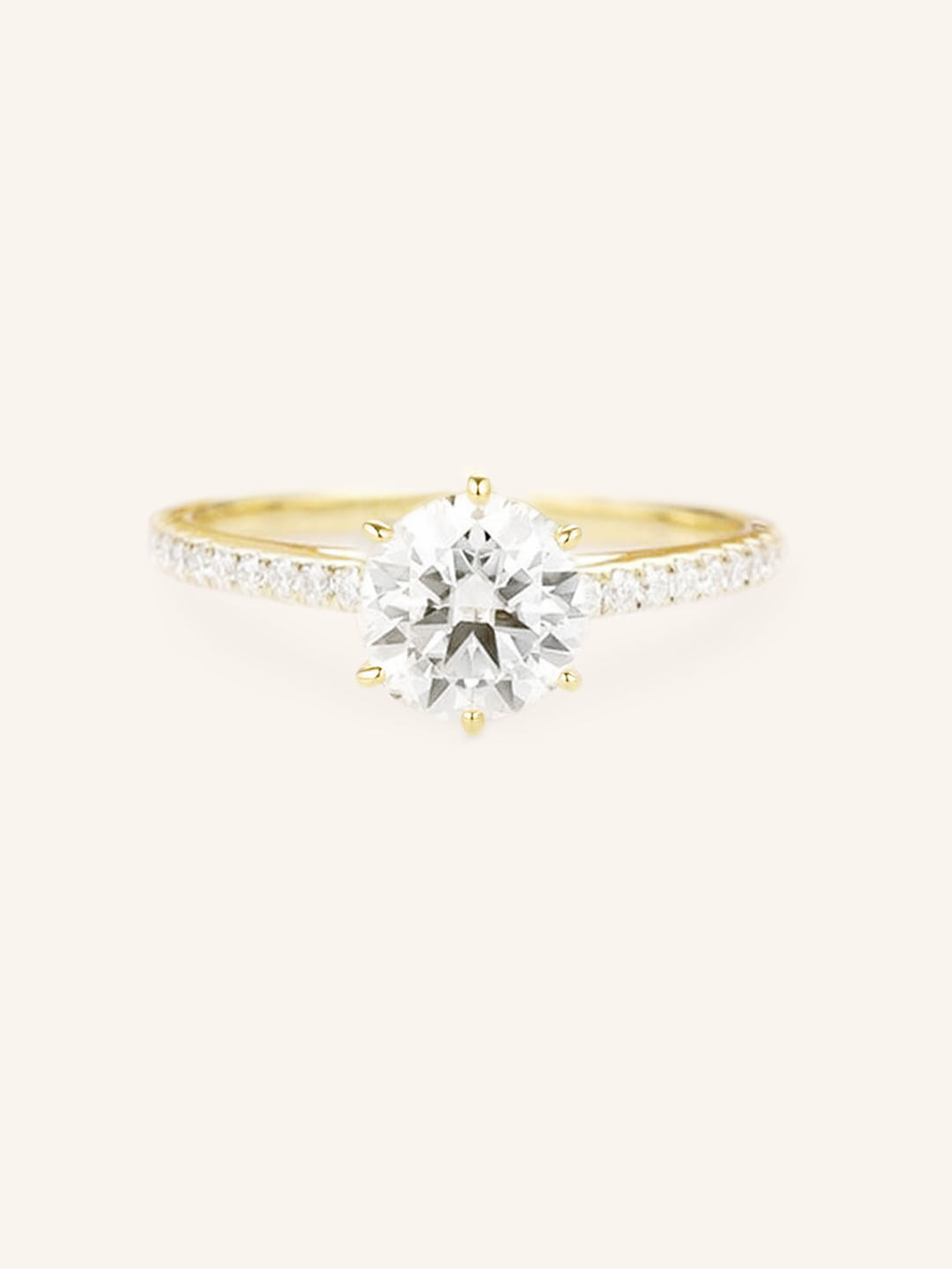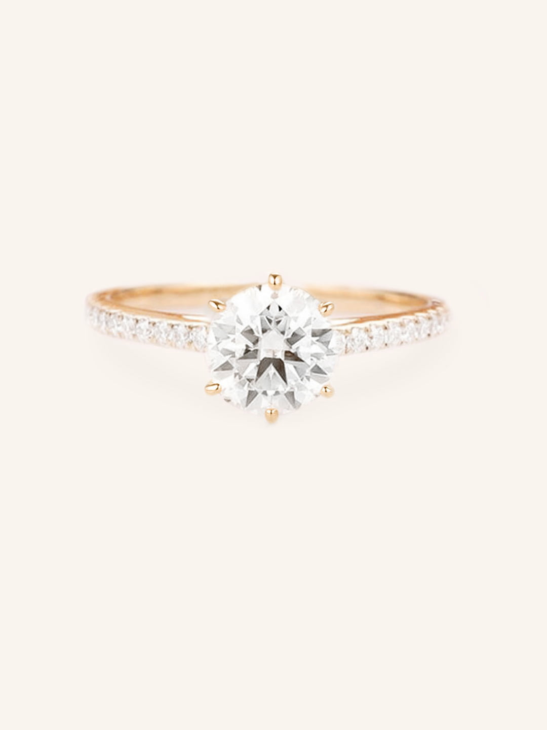 Our Wedding Arbor Diamond collection features six prongs as well as a cathedral which elevates the stone enhanced by twenty brilliant diamonds along the side of this classic solid gold engagement ring.